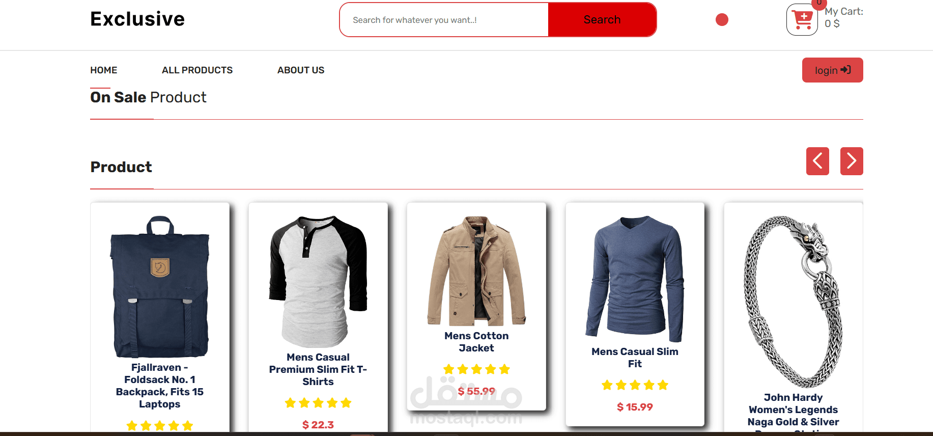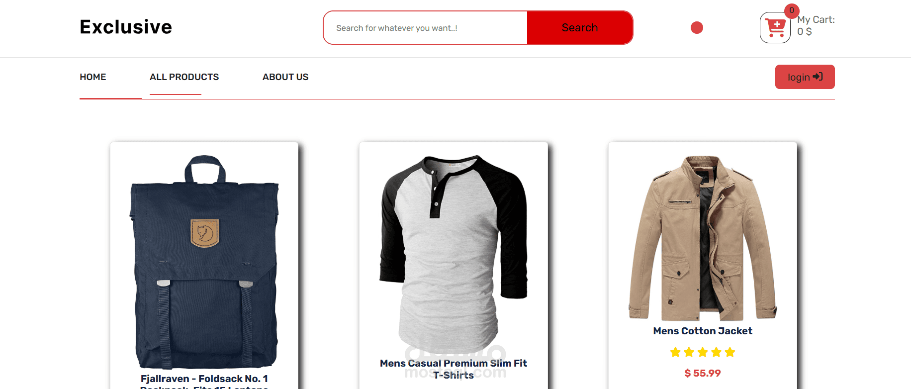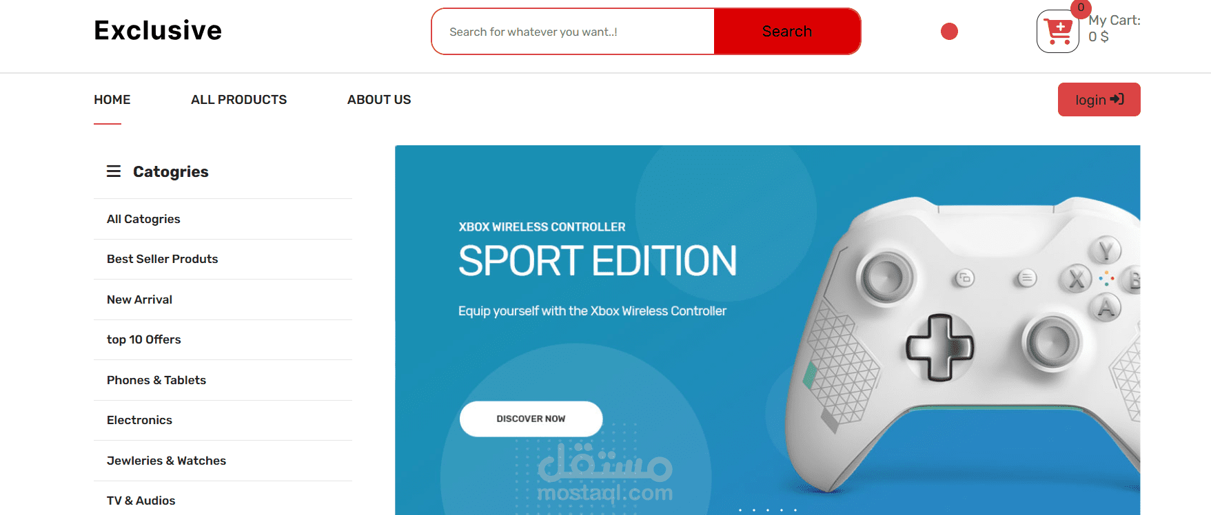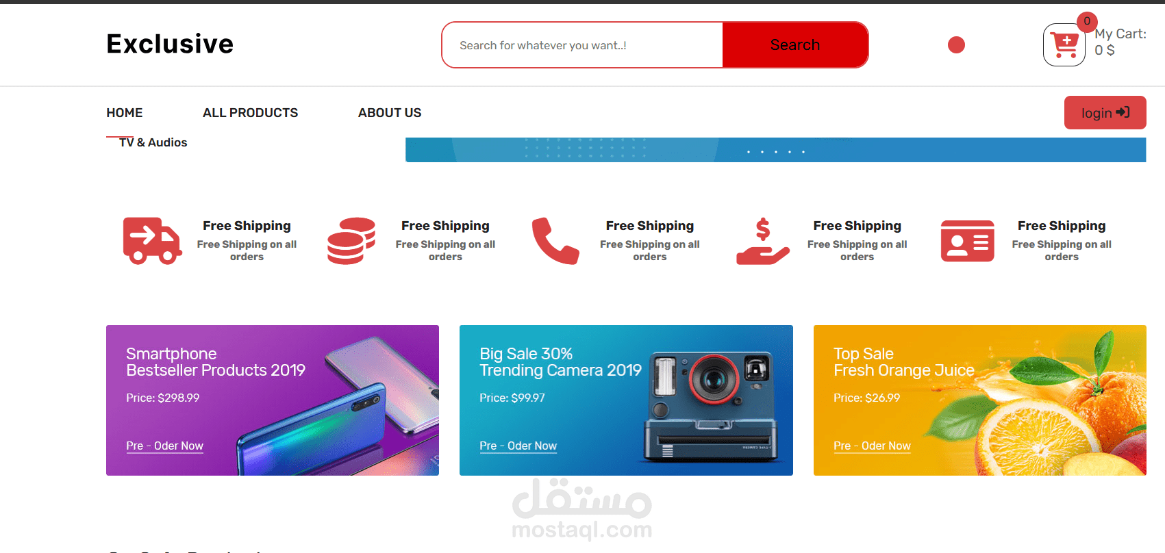 متجر الكتروني متكامل بصفحة واجهة وصفحة تسجيل دخول وتسجيل على الموقع وعرض المنتجات بطريقة جميلة واضافة طريقة دفع