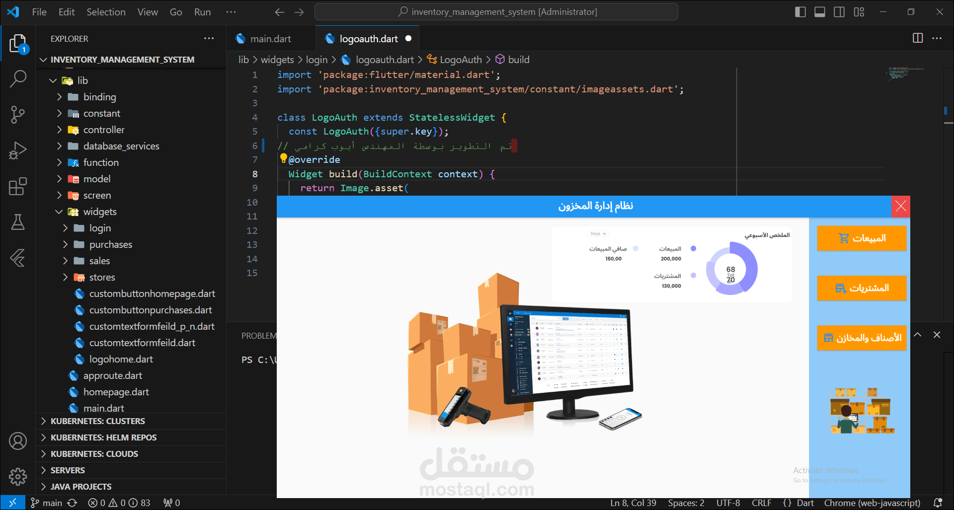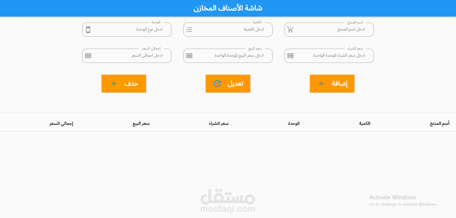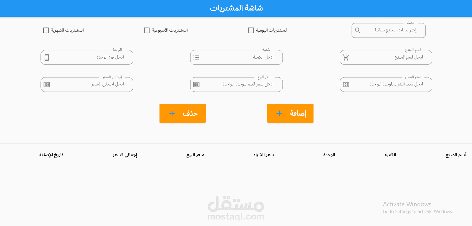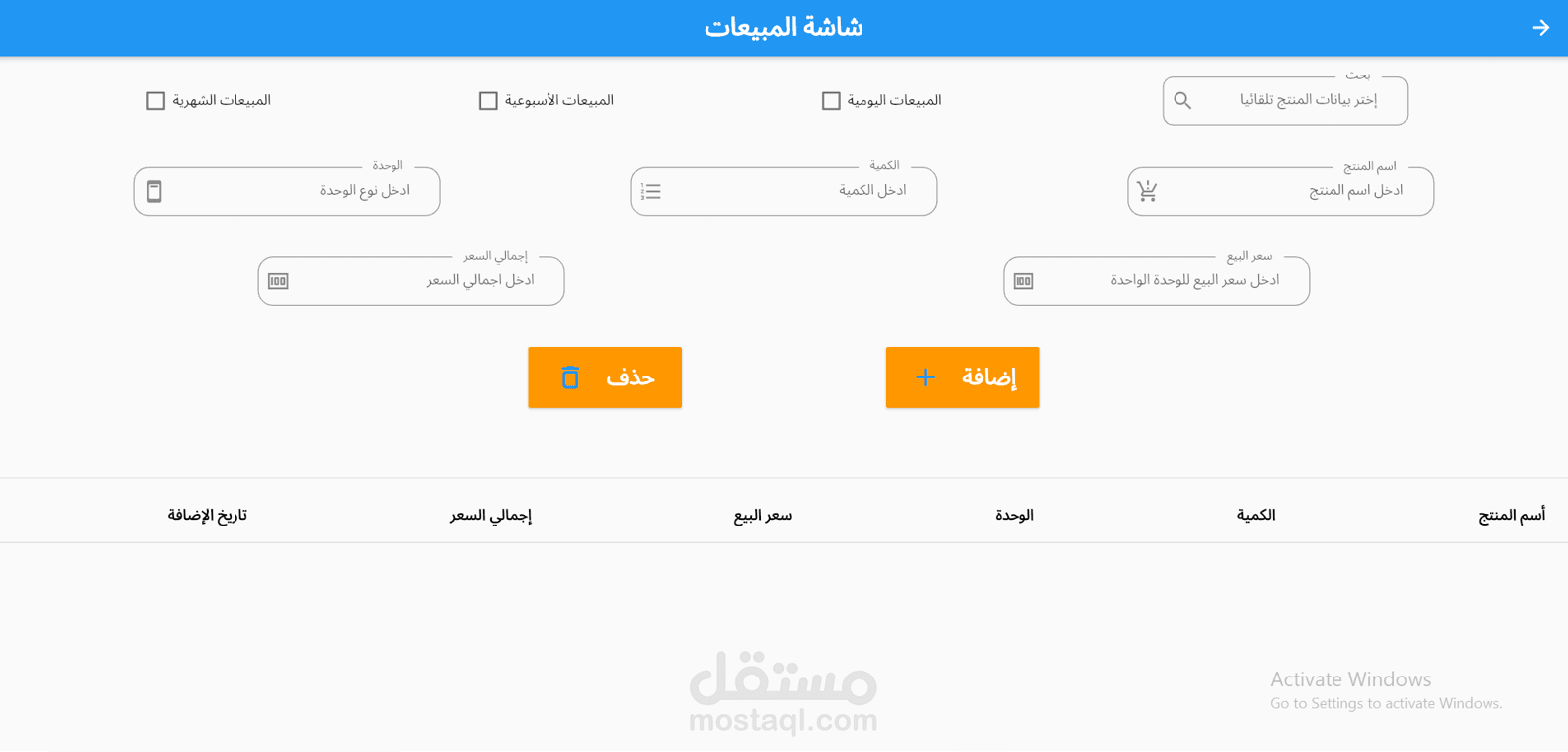 نظام إدارة المخزون في windows-flutter - MVC - GetX-Sqflite - يسمح النظام بإضافة وتعديل وحذف المنتجات - إضافة مبيعات جديدة - إضافة مشتريات جديدة - إدارة المخزون - تقارير مختصرة - تصفية المبيعات أو المشتريات بشكل يومي أو أسبوعي أو شهري - يتميز النظام بواجهة مستخدم سهلة وجذابة.