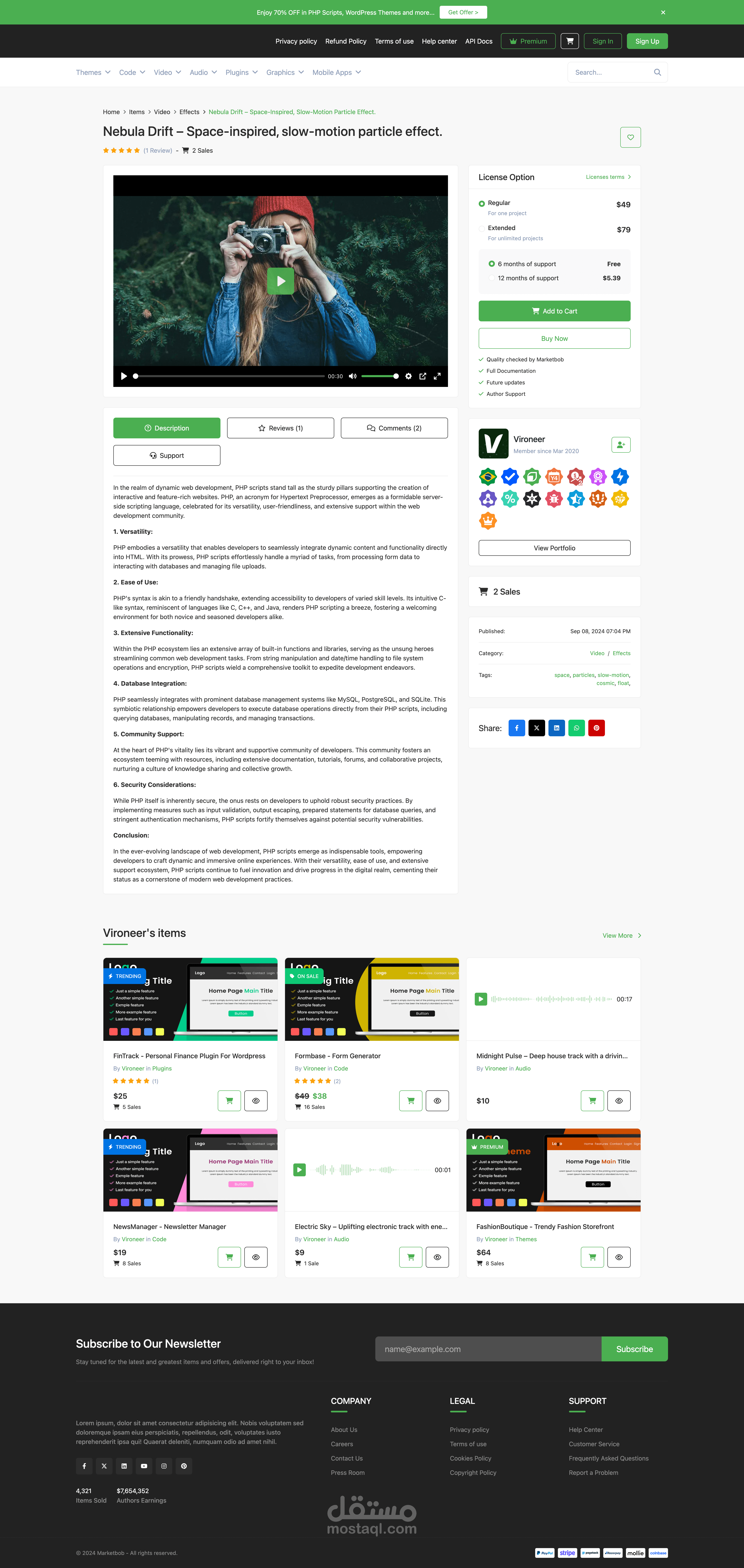 Key features include a multi-vendor system where authors can manage their profiles and products, create discounts, and earn through referral systems. The platform also supports premium subscription plans, video and audio previews, and efficient refund and support ticket systems. It empowers authors to offer free items, track sales transparently, and engage users through public profiles, favorites, and a follow system.