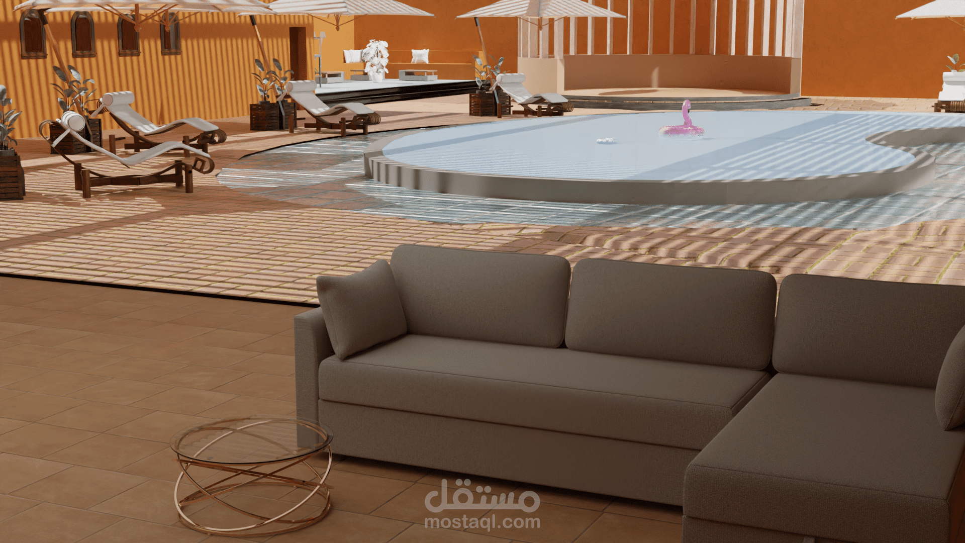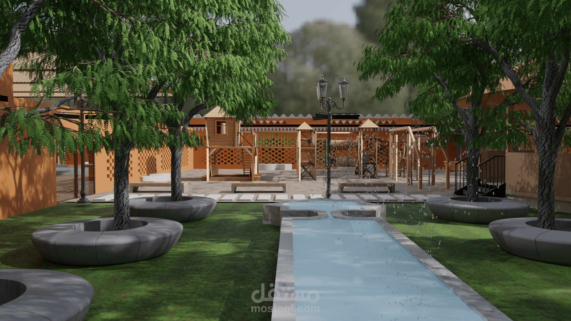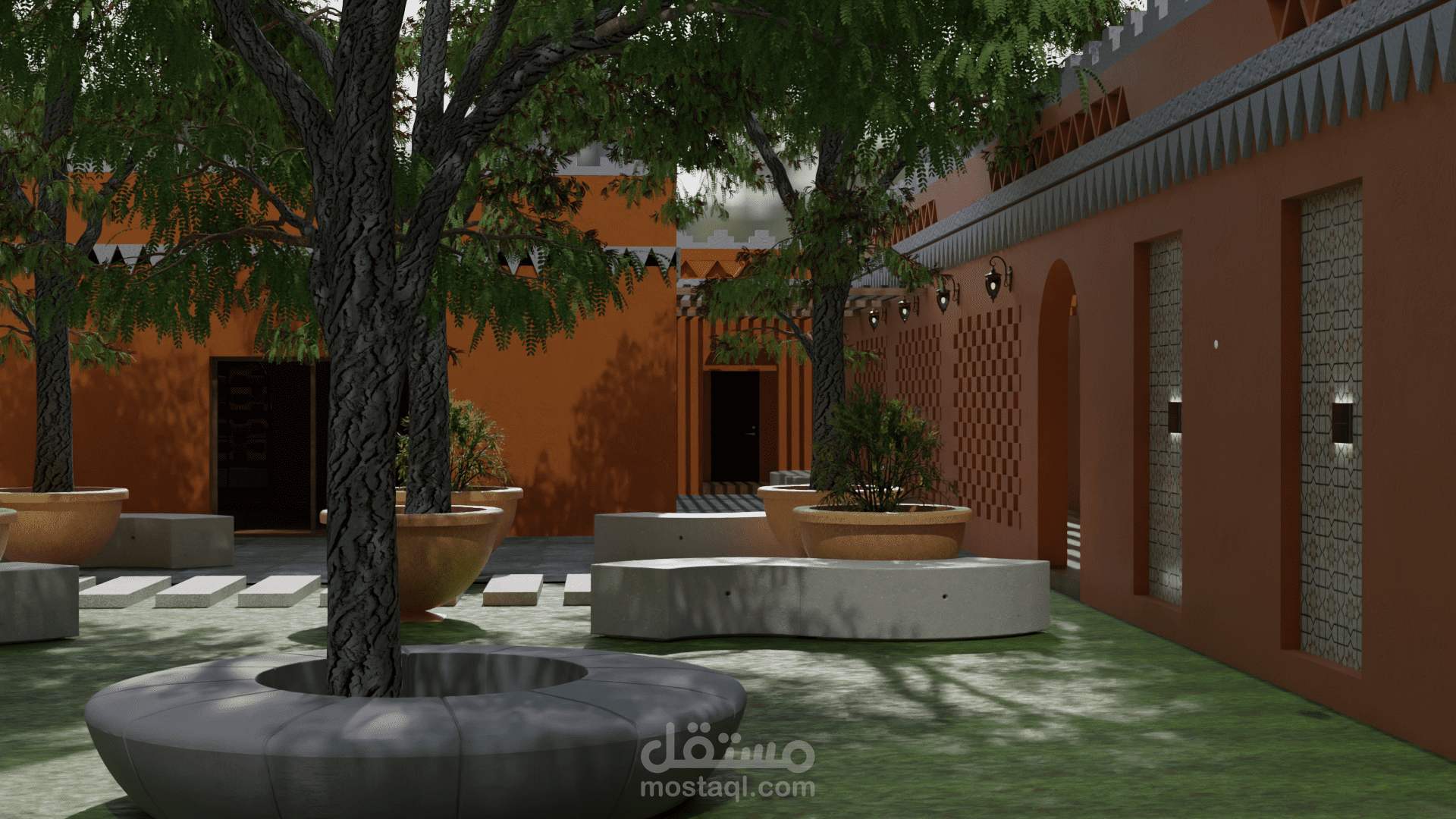 هذا المشروع عبارة عن استراحة مصممة بأسلوب معماري يعكس الطابع الصحراوي الجزائري. يتميز التصميم باستخدام الألوان الترابية التي تتناغم مع البيئة المحيطة، مع التركيز على البساطة والوظيفية. تتضمن الاستراحة مساحات مفتوحة مزروعة بالأشجار لتوفير الظل وتعزيز الراحة، بالإضافة إلى جلسات تقليدية مغطاة بمظلات قماشية أو خشبية. يظهر في التصميم اهتمام بتوفير مناطق جلوس متعددة تلائم الأجواء الصحراوية، مع دمج عناصر تقليدية مثل الزخارف والنوافذ الصغيرة المستوحاة من العمارة الجزائرية المحلية. يعكس المشروع توازنًا بين الطراز التراثي والاحتياجات العصرية لتوفير تجربة مريحة وثرية للزوار.