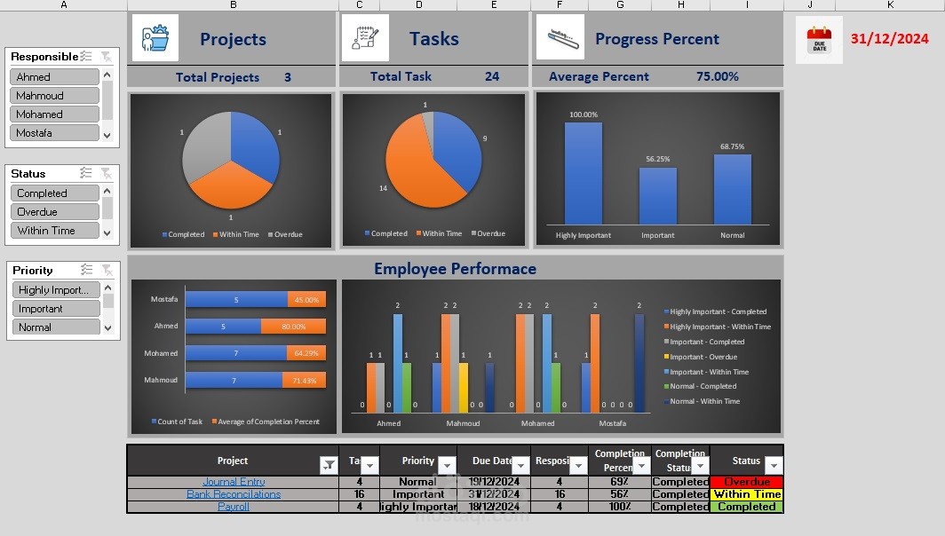 • نسبة التقدم: متوسط نسبة الإنجاز لجميع المهام.