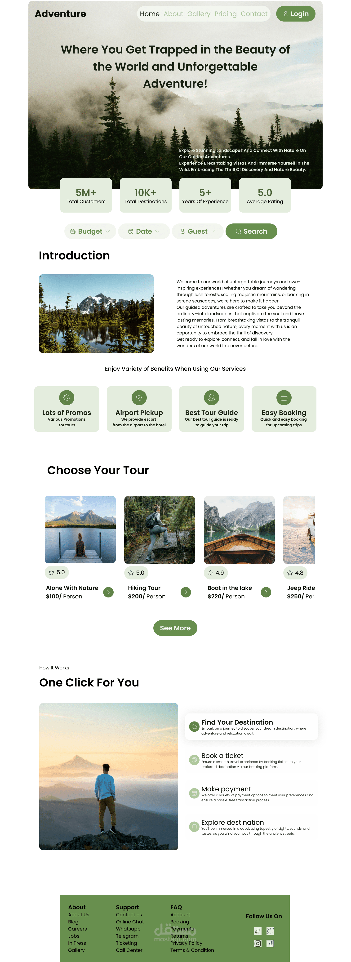 المشروع عبارة عن تصميم واجهة موقع إلكتروني يقدم خدمات المغامرات السياحية حول العالم. الموقع يعكس جمال الطبيعة وروح المغامرة من خلال تصميم عصري وجذاب، يركز على تجربة المستخدم بشكل سهل ومريح.