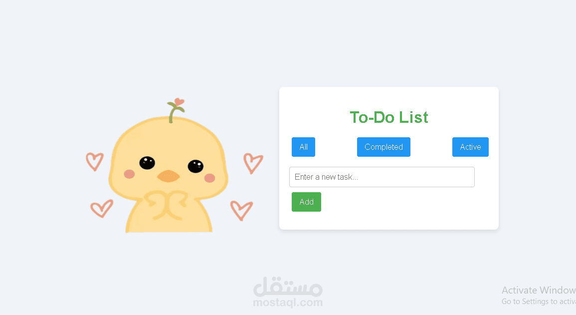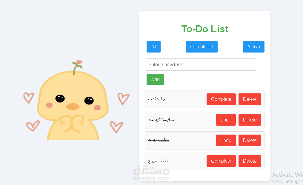 قمت بتطوير تطبيق To-Do List بسيط وسهل الاستخدام يساعد المستخدمين على إدارة مهامهم اليومية بكفاءة، مع إمكانية إضافة المهام، حذفها، ووضع علامة على المهام المكتملة.