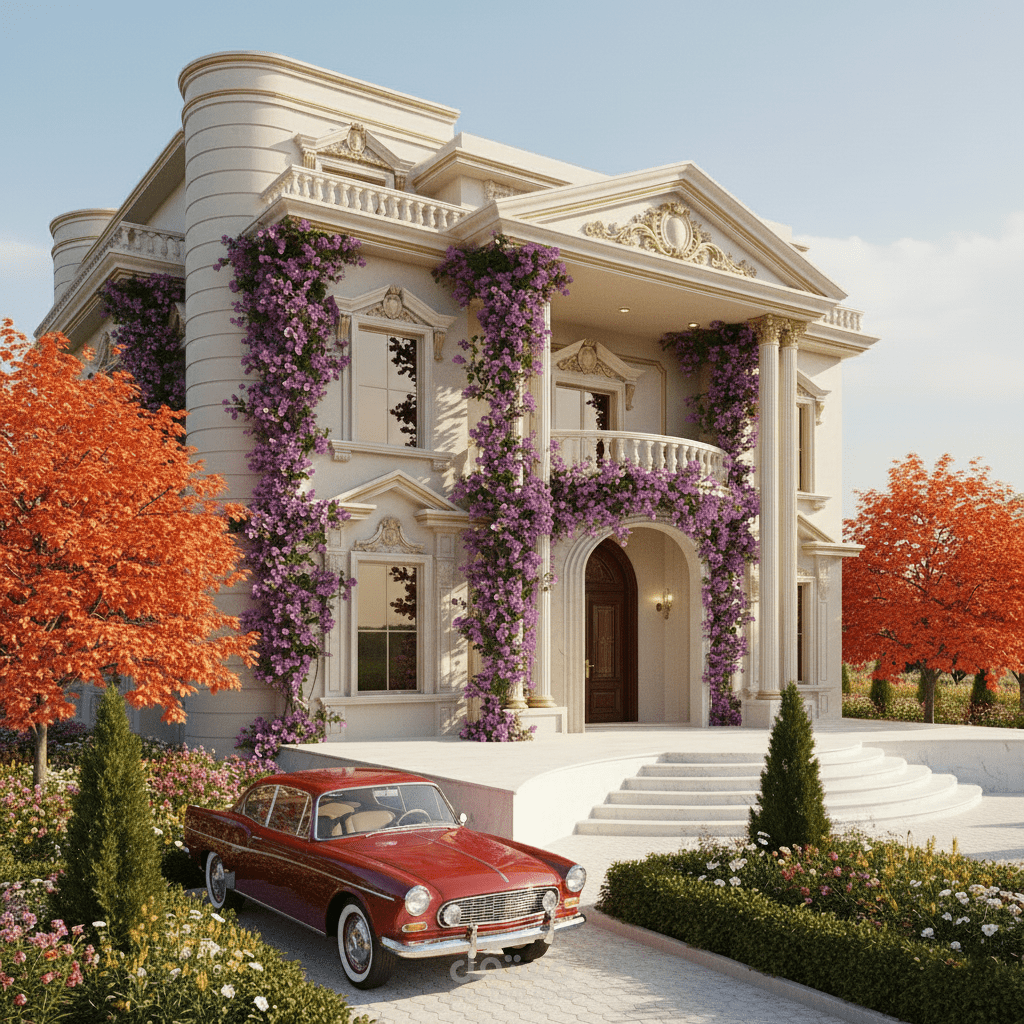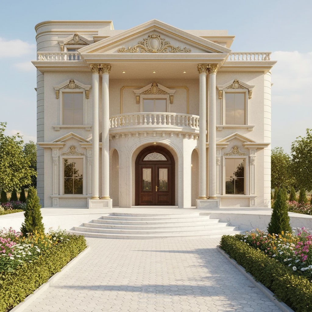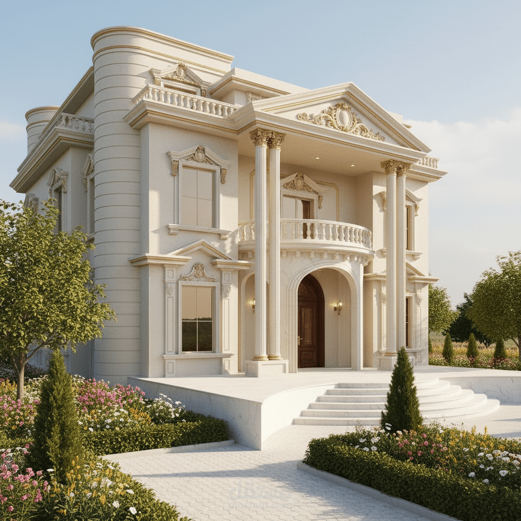 واجهة فيلا بتصميم كلاسيكي راقٍ يجمع بين الفخامة والتناسق، مع تفاصيل معمارية دقيقة مثل الأعمدة المزخرفة والكرانيش المنسابة.