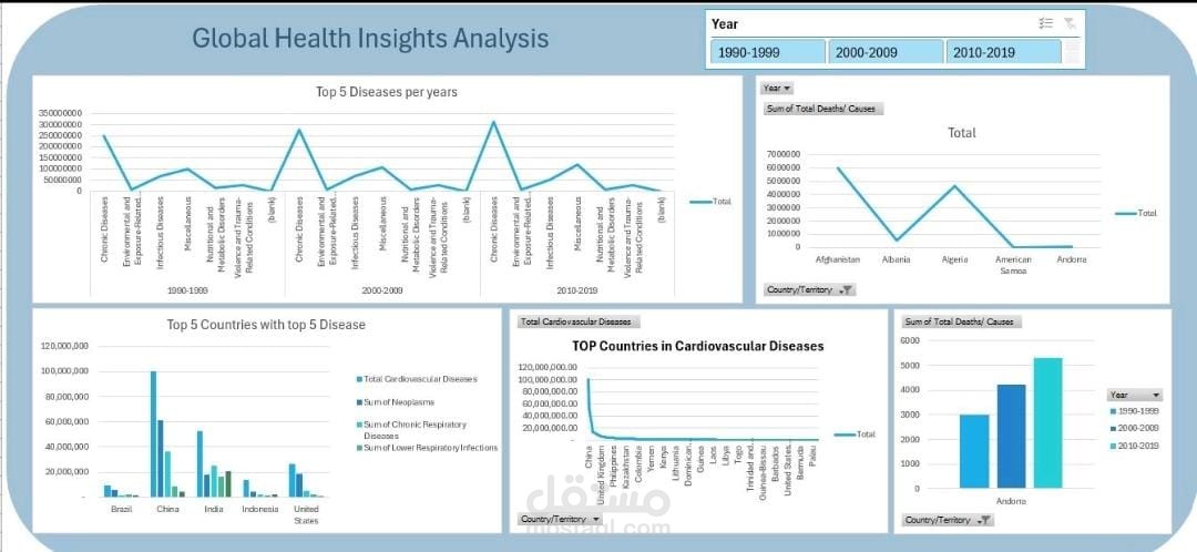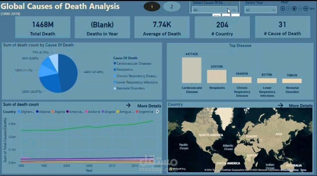 في هذا المشروع، قمت برحلة استكشافية لفهم أسباب الوفاة حول العالم باستخدام بيانات الصحة العالمية. بدأت من بيانات خام وحولتها إلى رؤى عملية تساعد على كشف العوامل المؤثرة في معدلات الوفيات عالميًا. لقد اعتمدت على مجموعة من الأدوات المتطورة مثل Python، Jupyter Notebook، Pandas، NumPy، Matplotlib، وSeaborn، بالإضافة إلى أدوات Excel وPower BI، لتقديم تحليلات دقيقة وسهلة الفهم. هذا المشروع يُظهر كيف يمكن للتقنيات الحديثة والتقليدية معًا أن تُحدث فرقًا في فهم التحديات الصحية بشكل علمي وعملي.