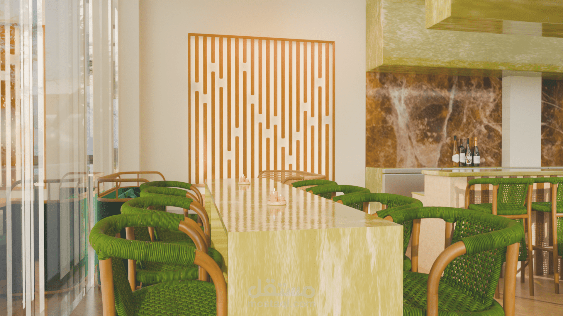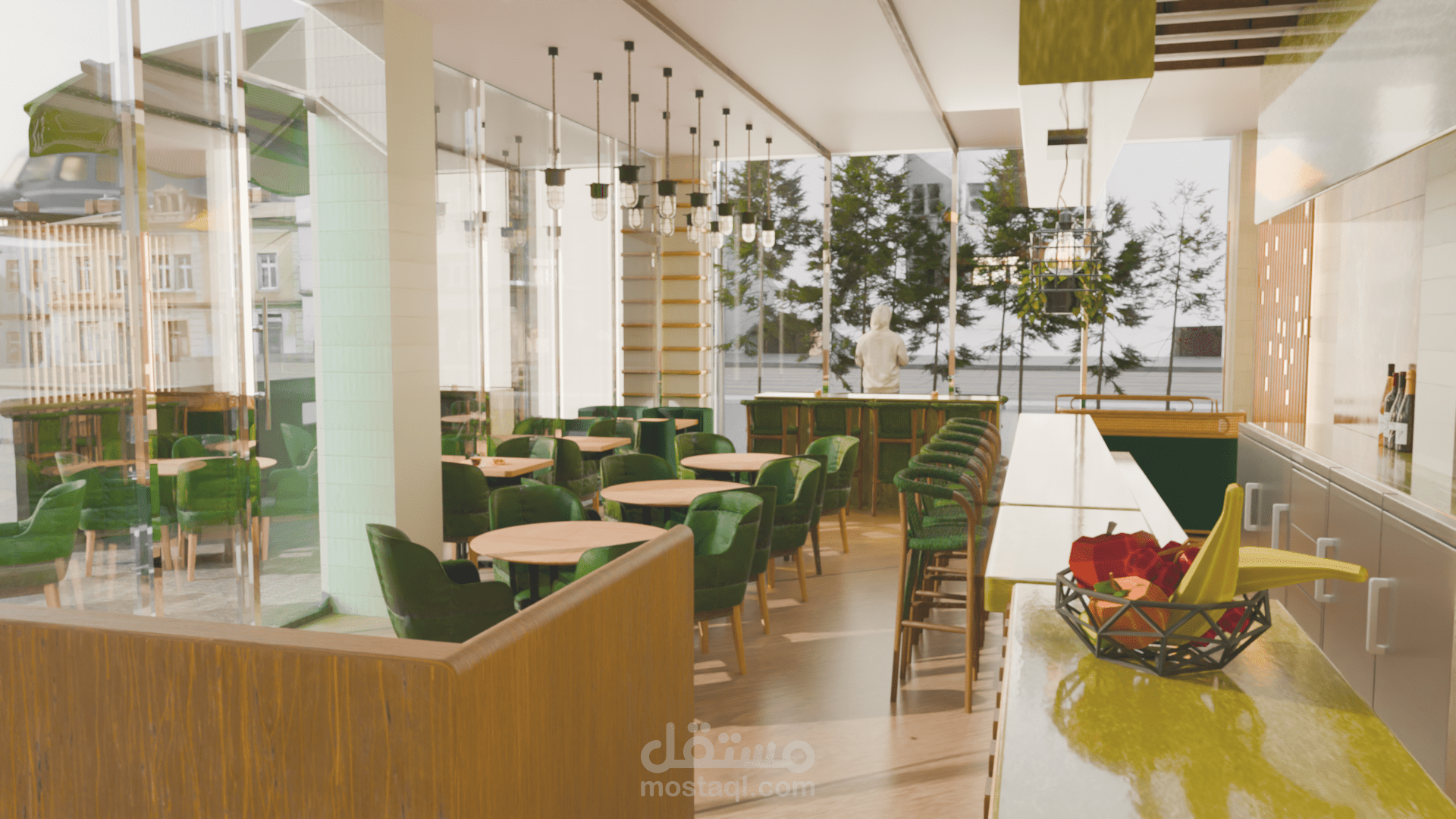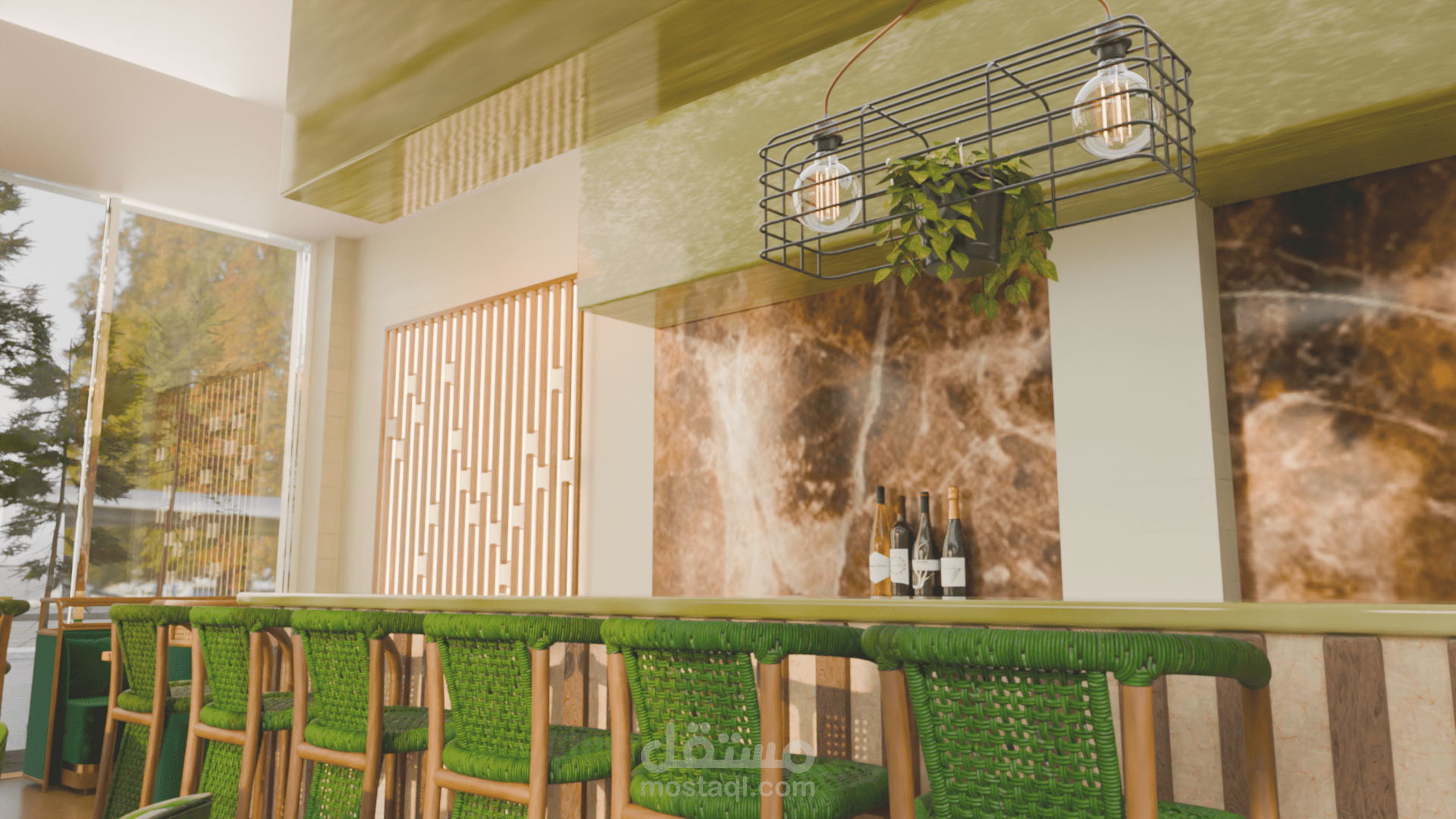 إضافة تفاصيل مثل الجدران الخضراء المزروعة، الطاولات الخشبية، والأثاث العصري بألوان مستوحاة من الطبيعة مثل الأخضر، البني، والأبيض.