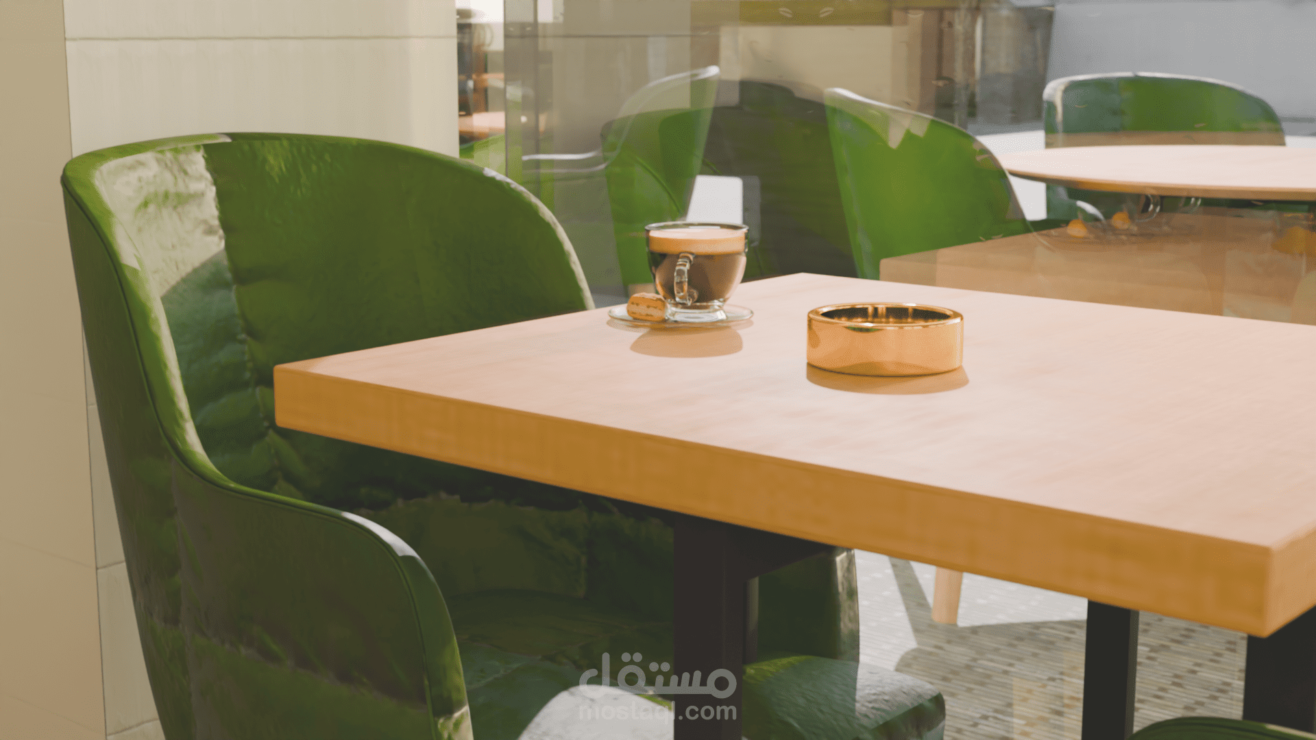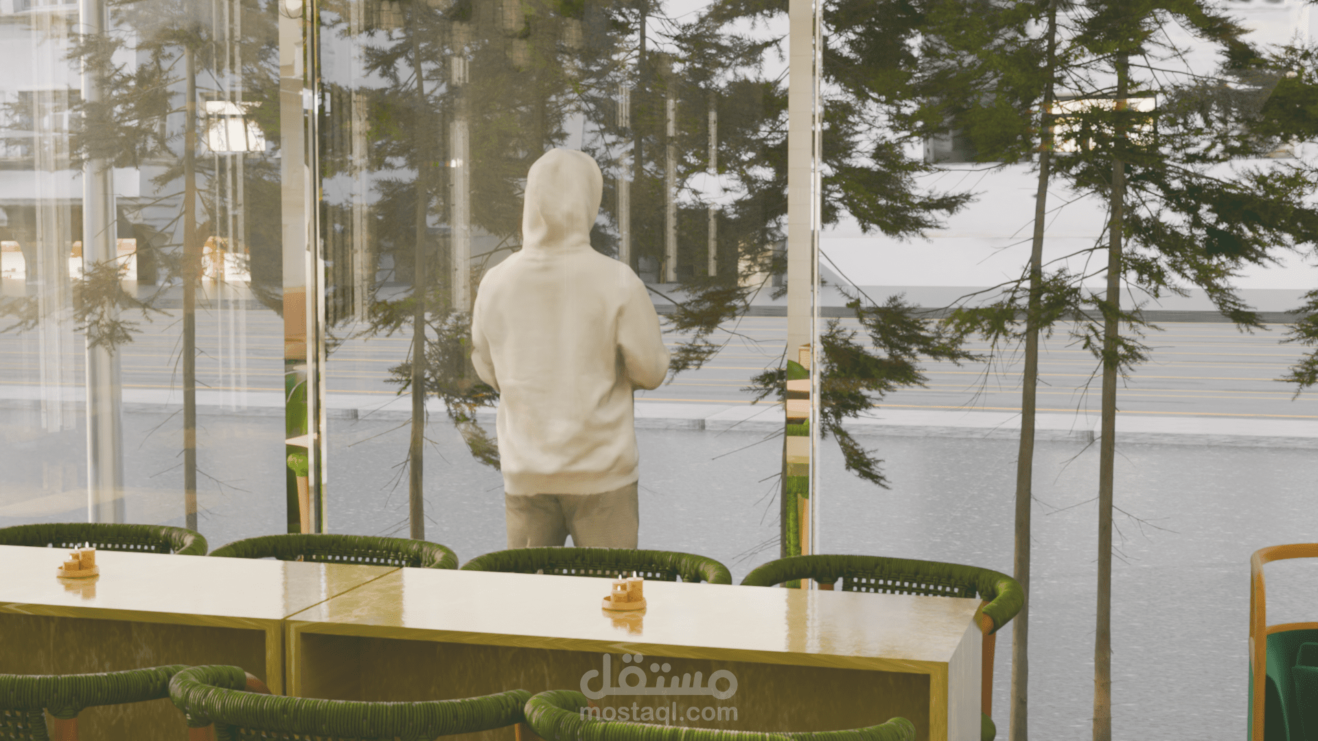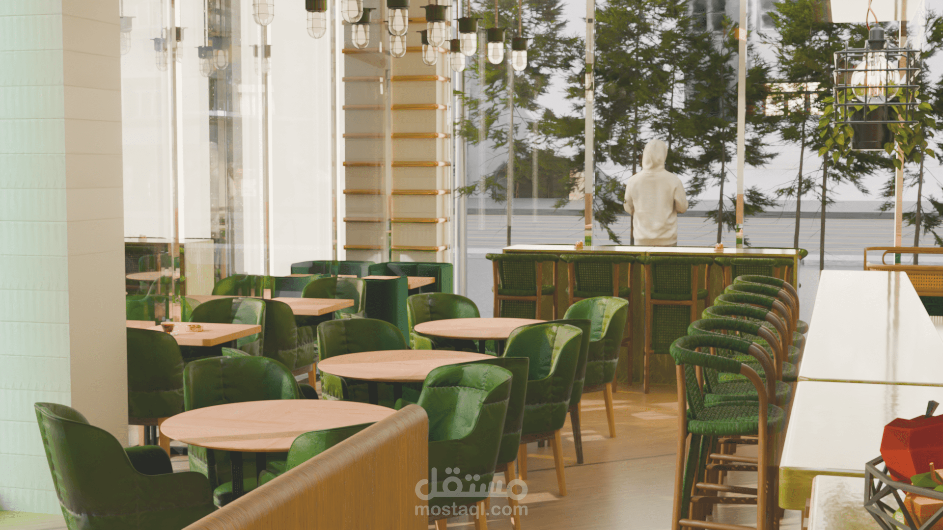 إعداد مشاهد ثلاثية الأبعاد تشمل مناطق الخدمة والجلوس، مع إظهار تدفق العملاء وأجواء المقهى الحميمية.
