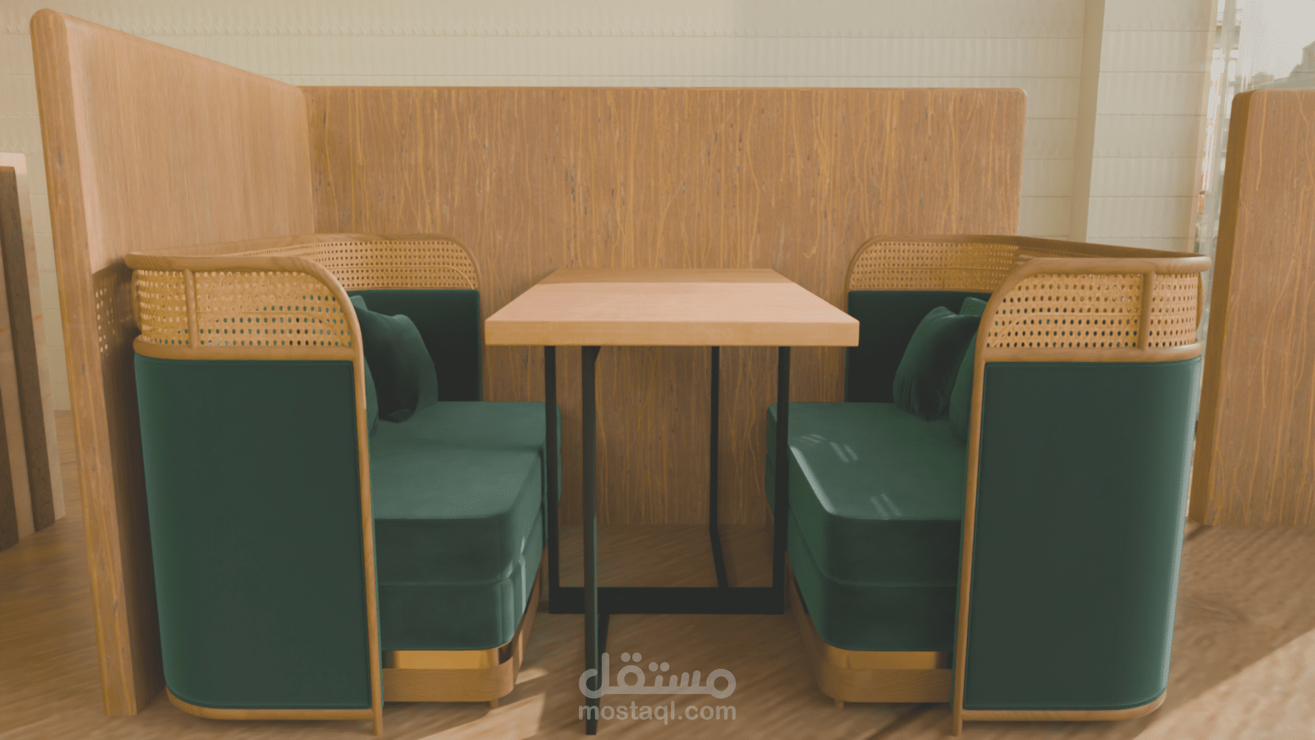 إنشاء نموذج ثلاثي الأبعاد للمقهى يعكس أجواءً مريحة باستخدام مواد طبيعية مثل الخشب والنباتات الخضراء.