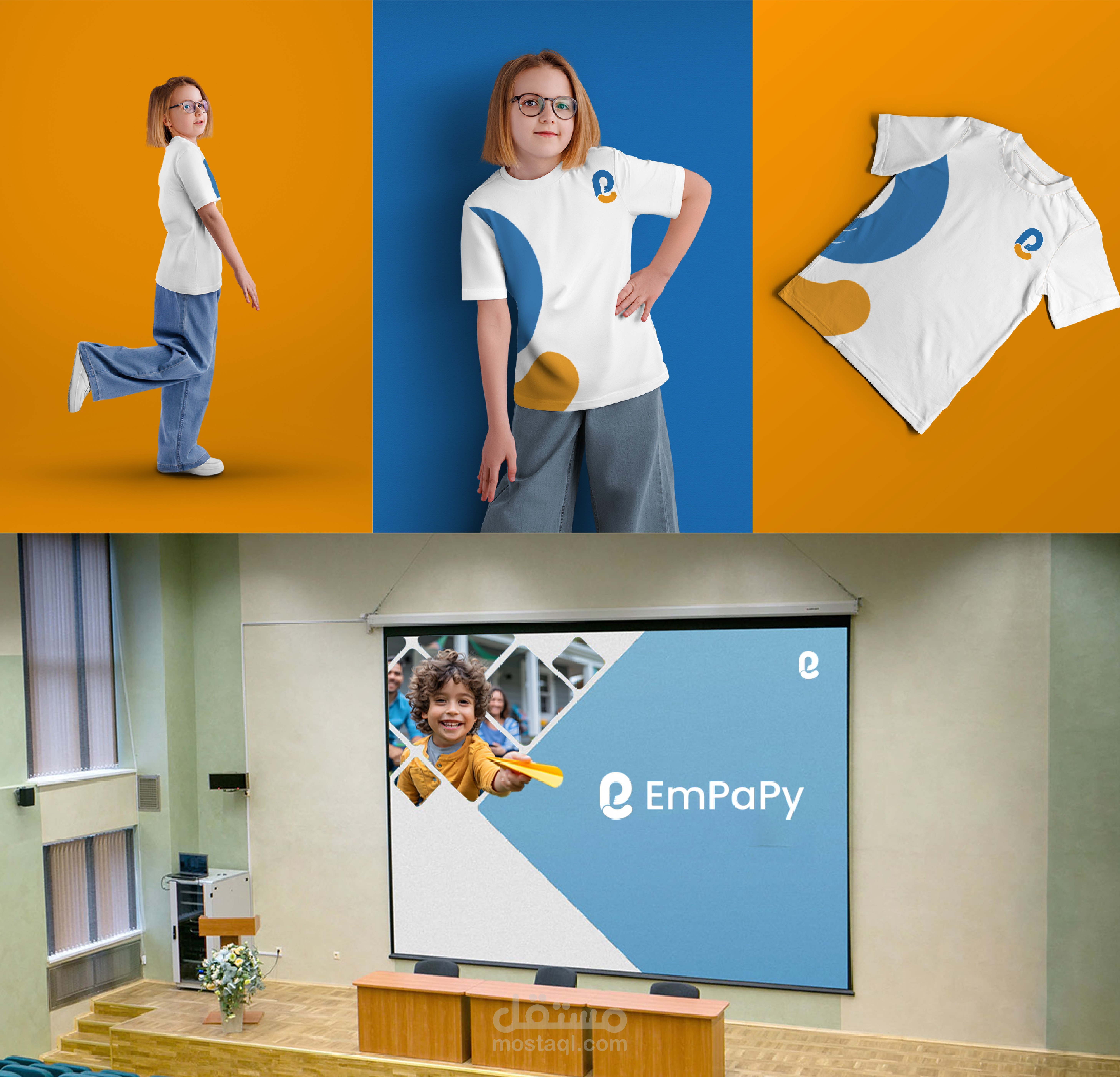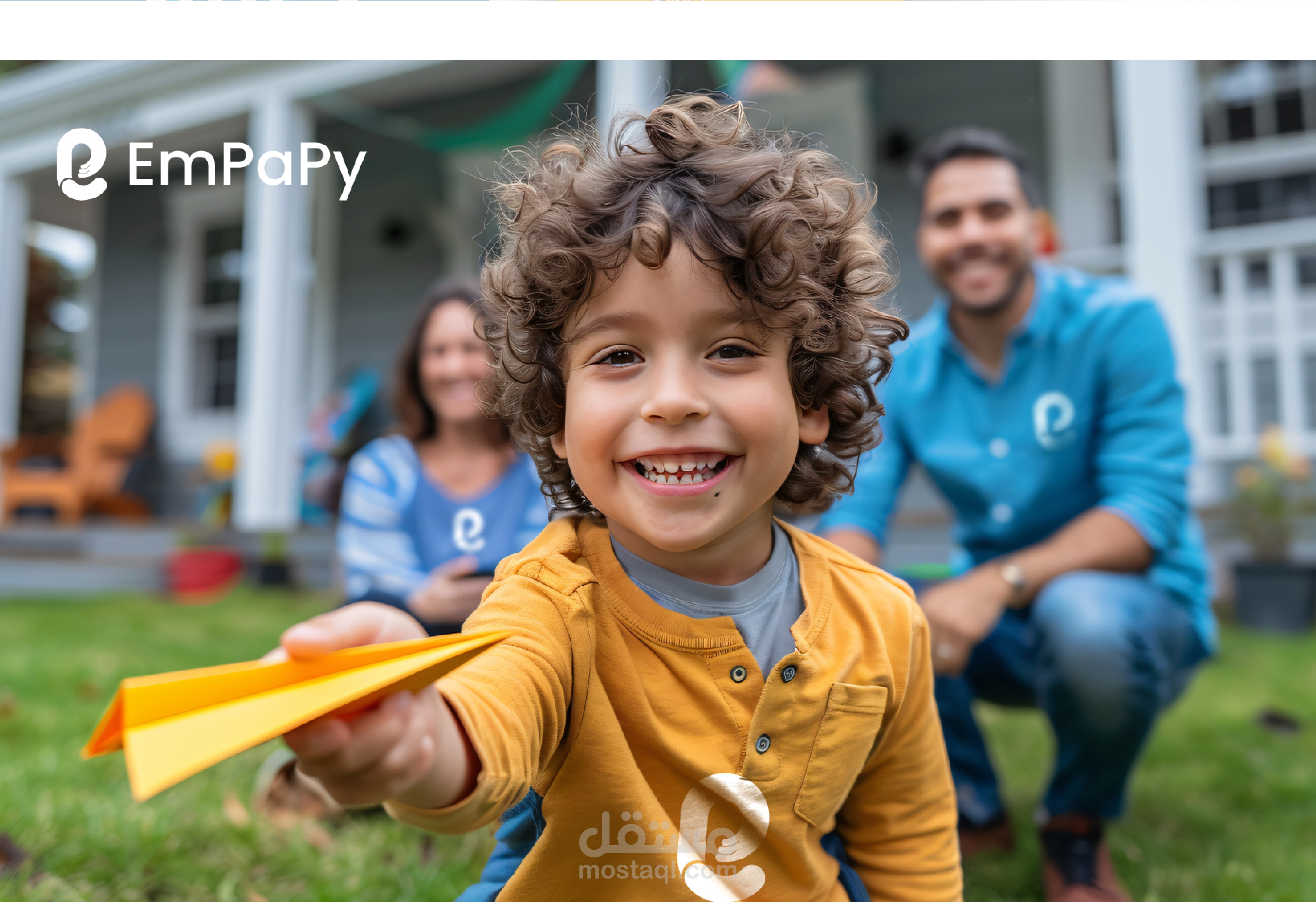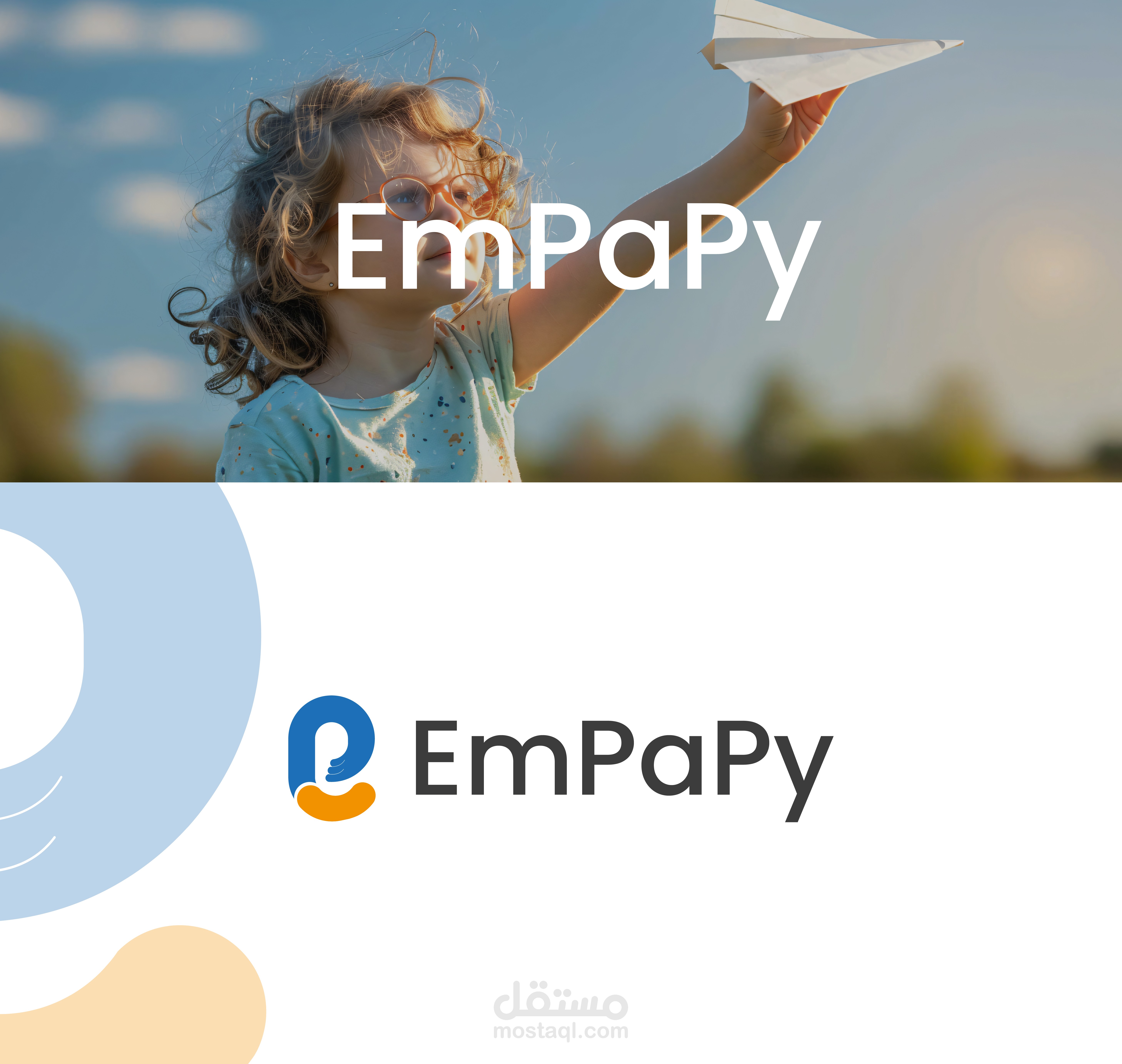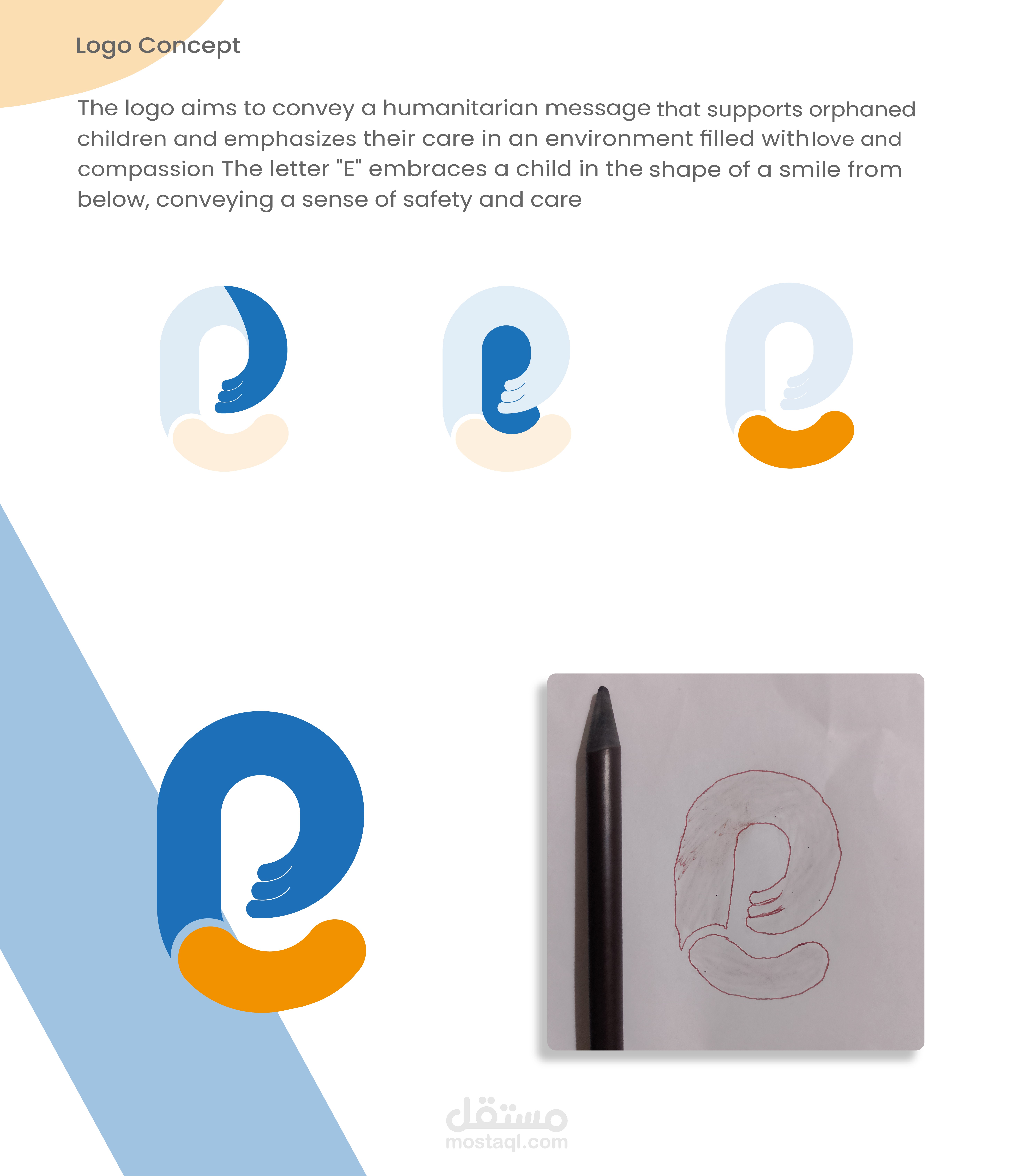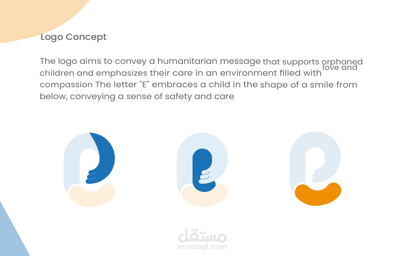 فكرة الشعار : حرف e علي شكل يد تحتضن طفل مع ابتسامه