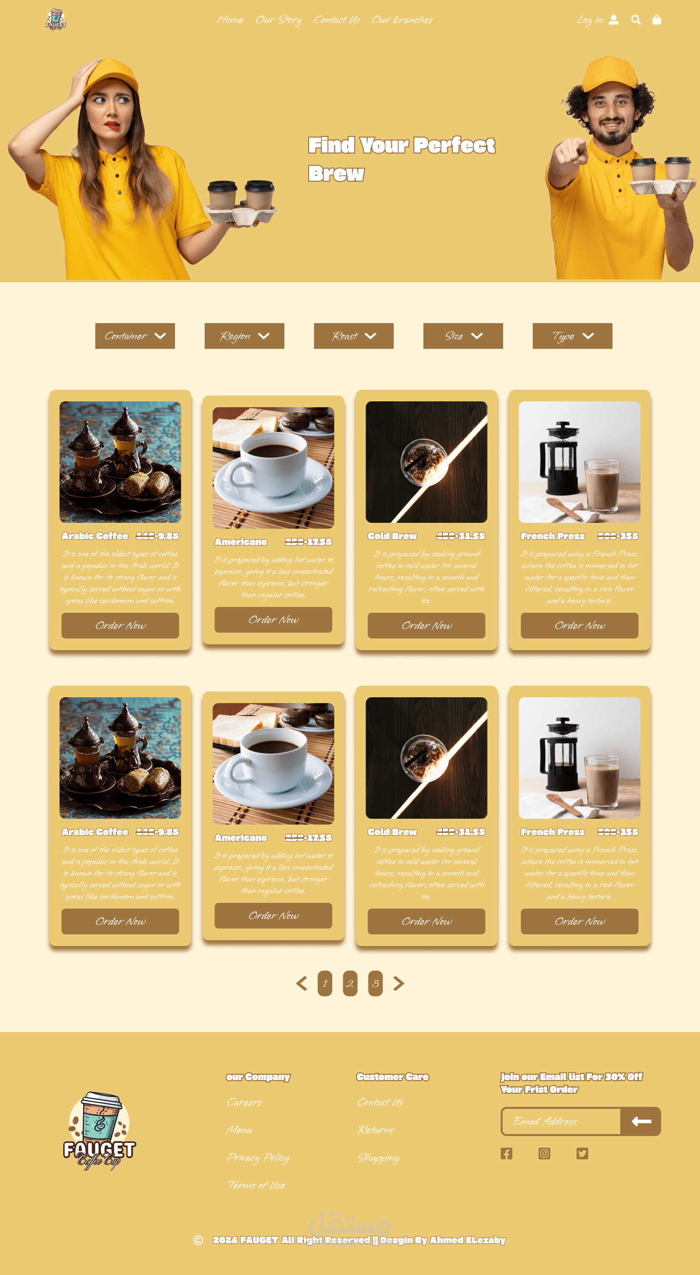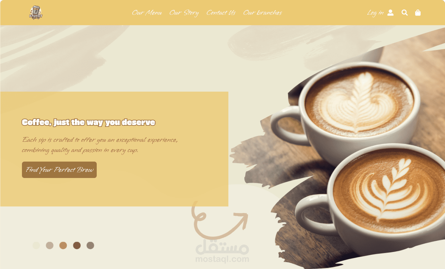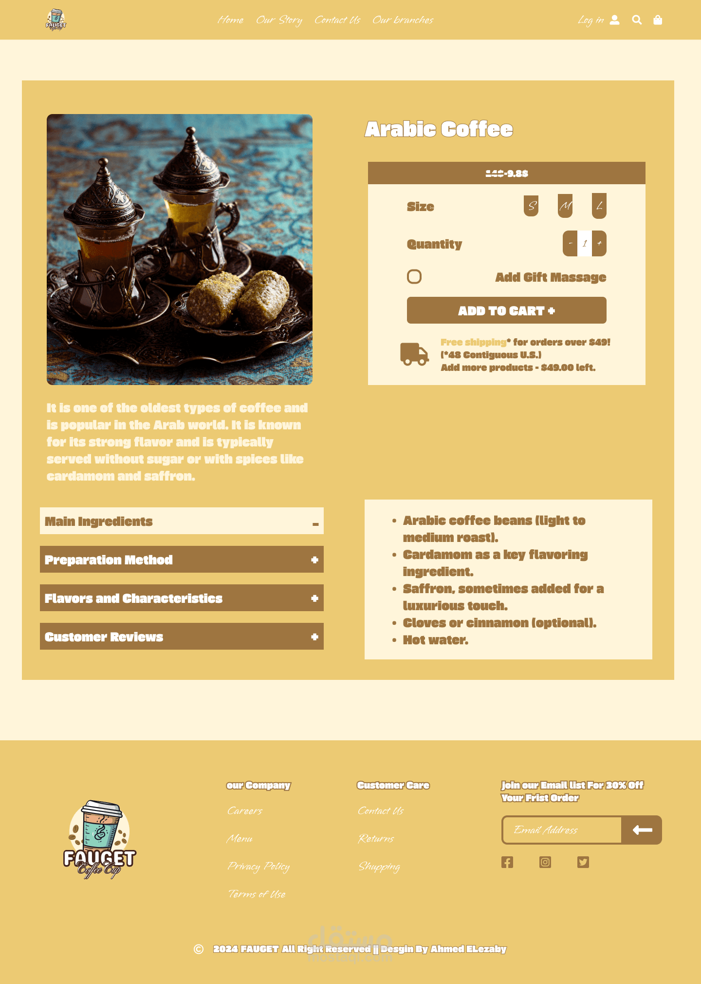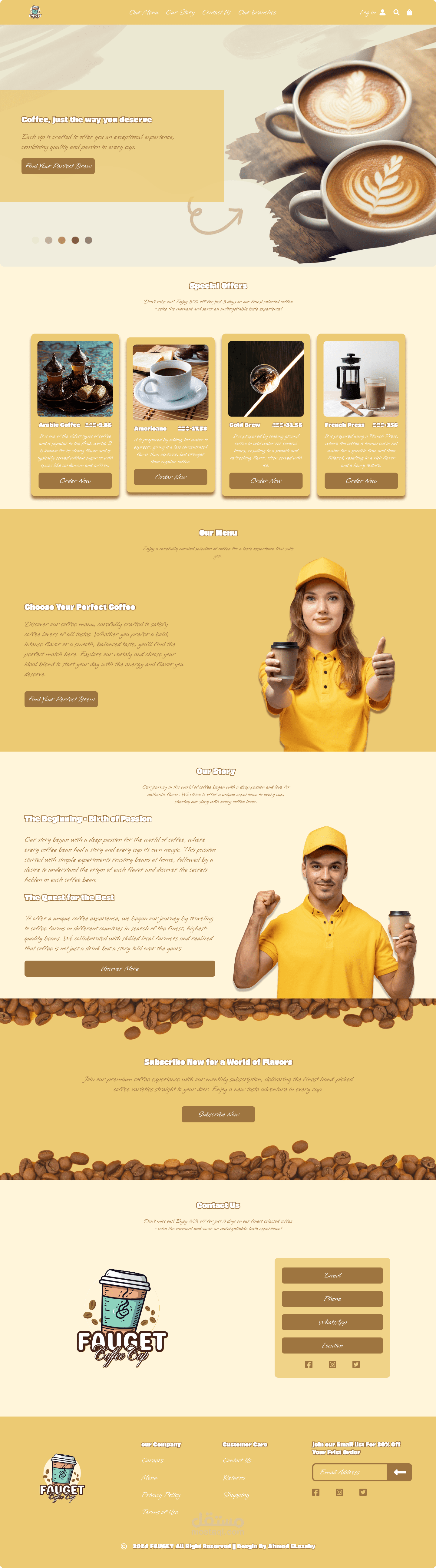 تم تصميم الصفحة الرئيسية لموقع إلكتروني لمقهى FAUCET Coffee Cup باستخدام أداة التصميم الاحترافية Figma، مع التركيز على إبراز هوية العلامة التجارية وتقديم تجربة مستخدم مريحة وجذابة.