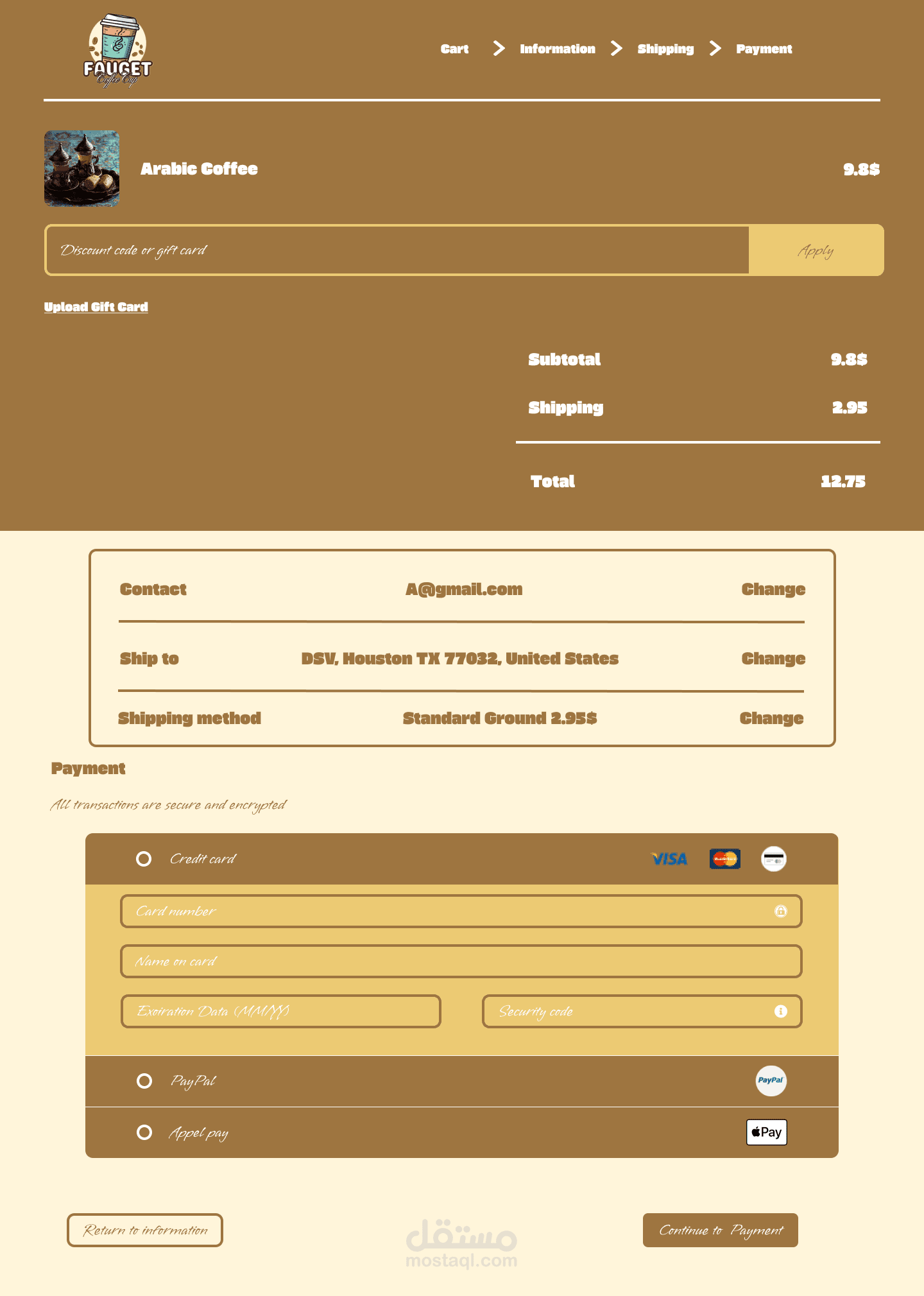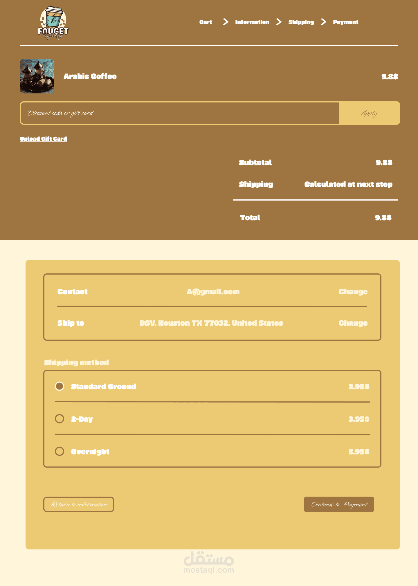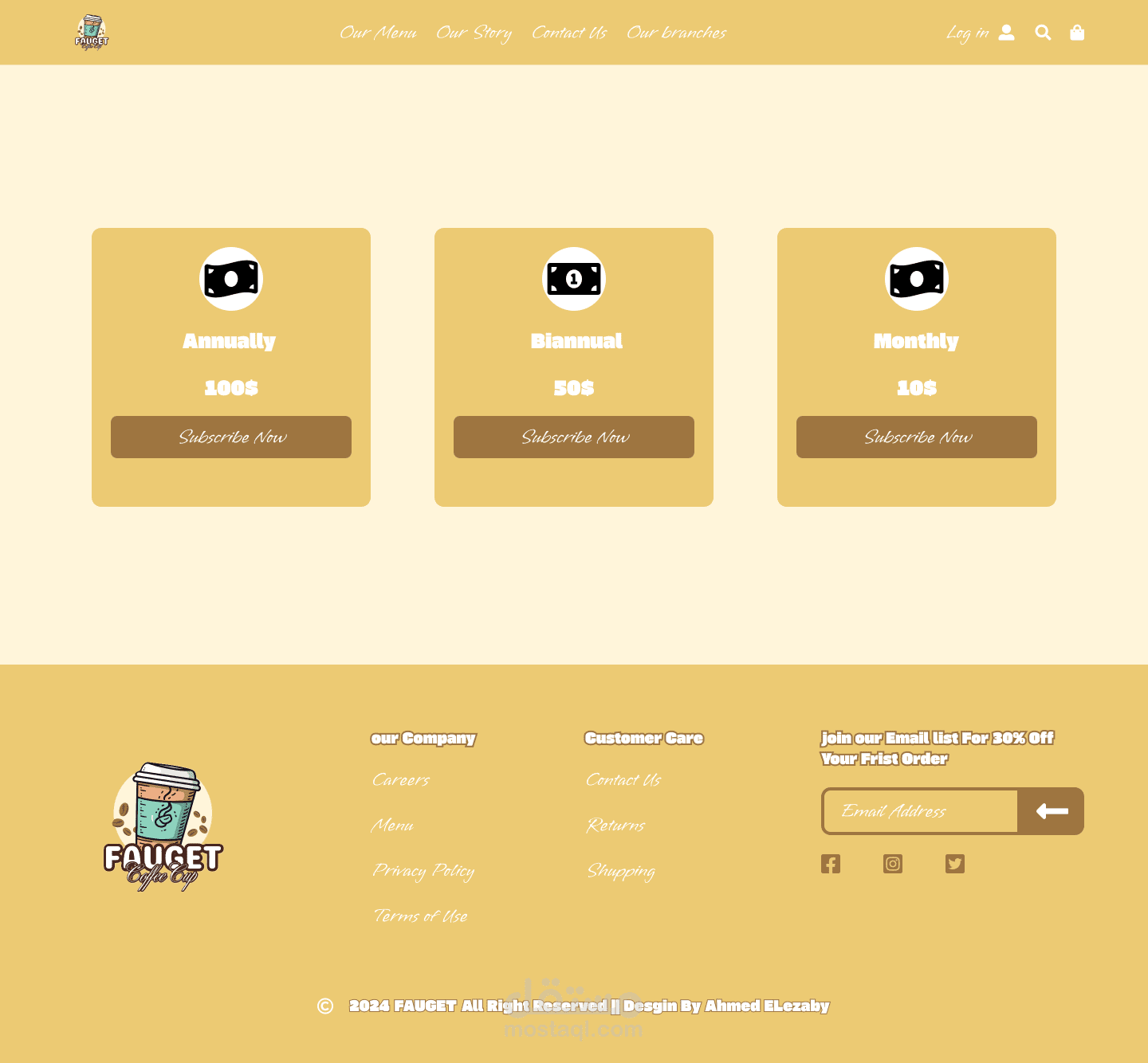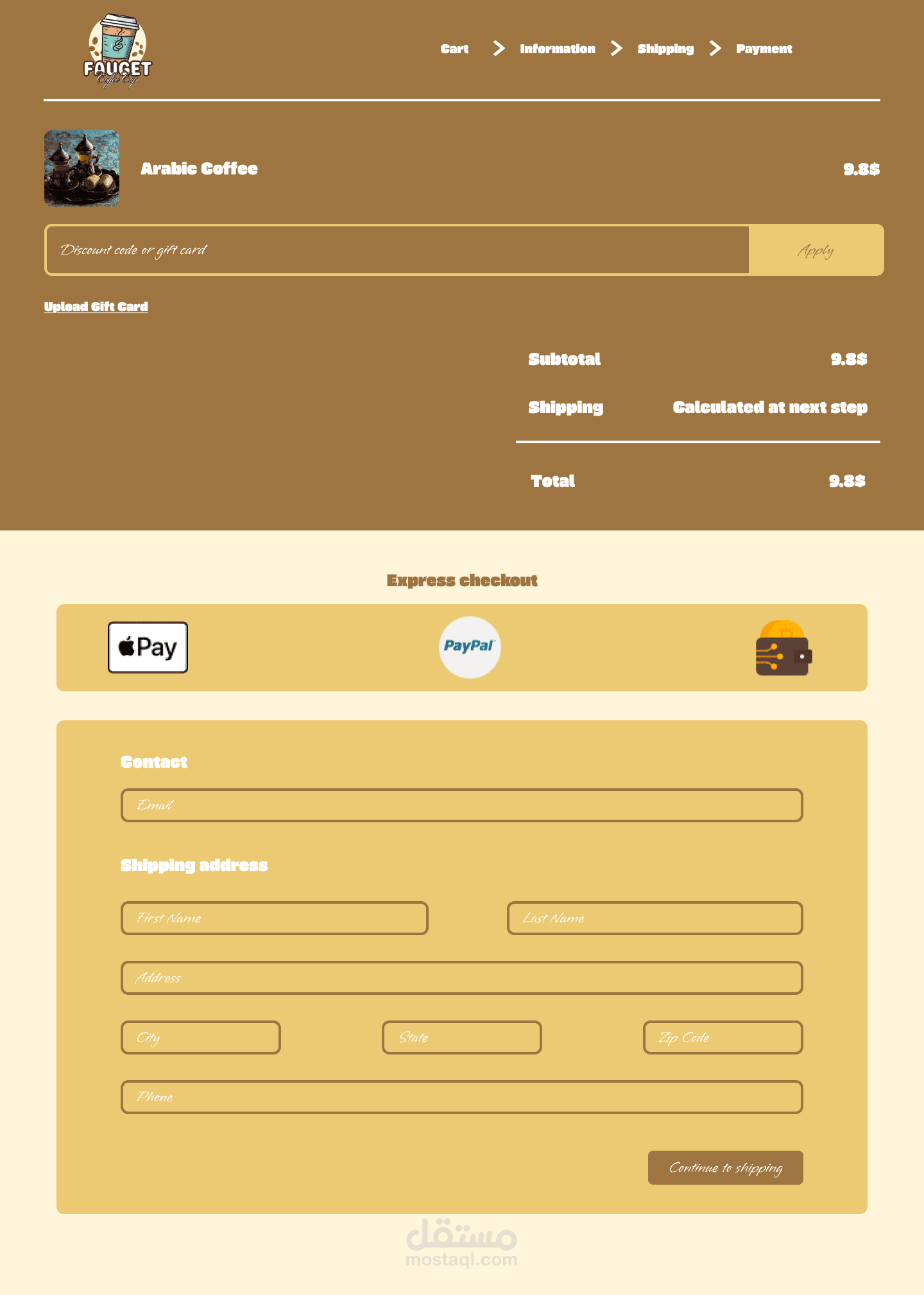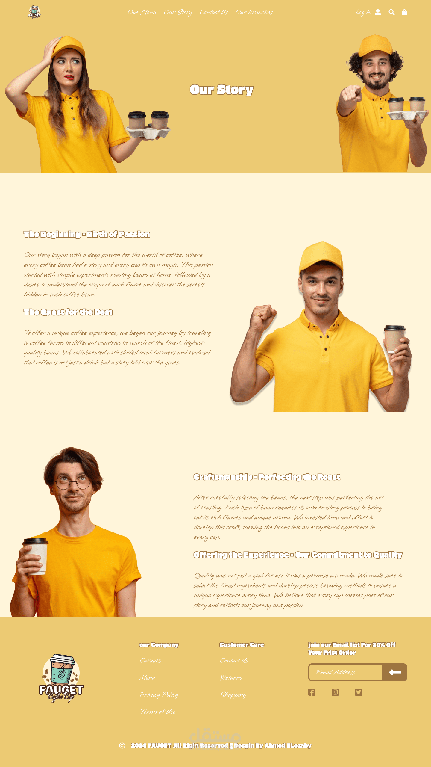 تم تصميم الصفحة الرئيسية لموقع إلكتروني لمقهى FAUCET Coffee Cup باستخدام أداة التصميم الاحترافية Figma، مع التركيز على إبراز هوية العلامة التجارية وتقديم تجربة مستخدم مريحة وجذابة.