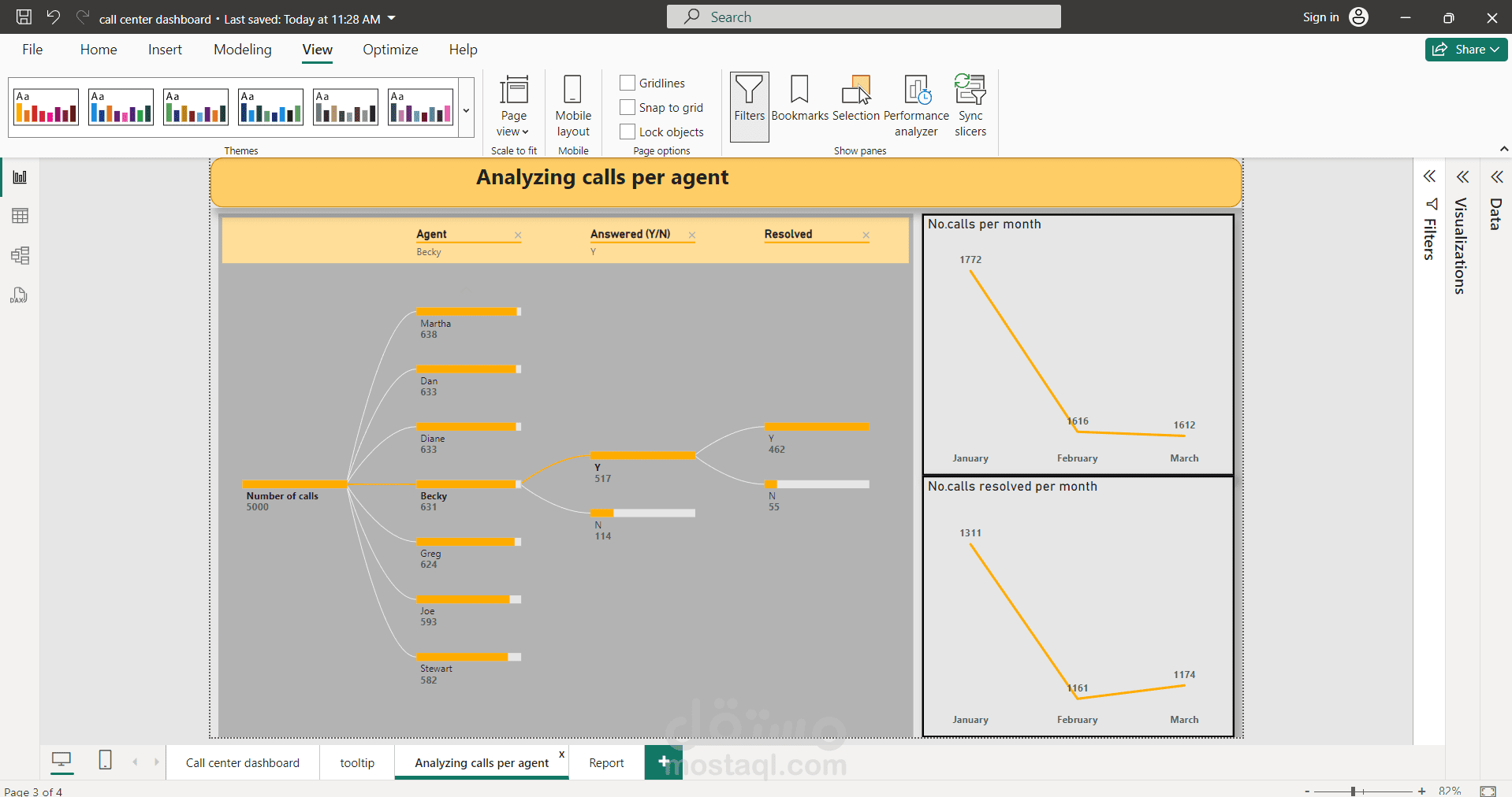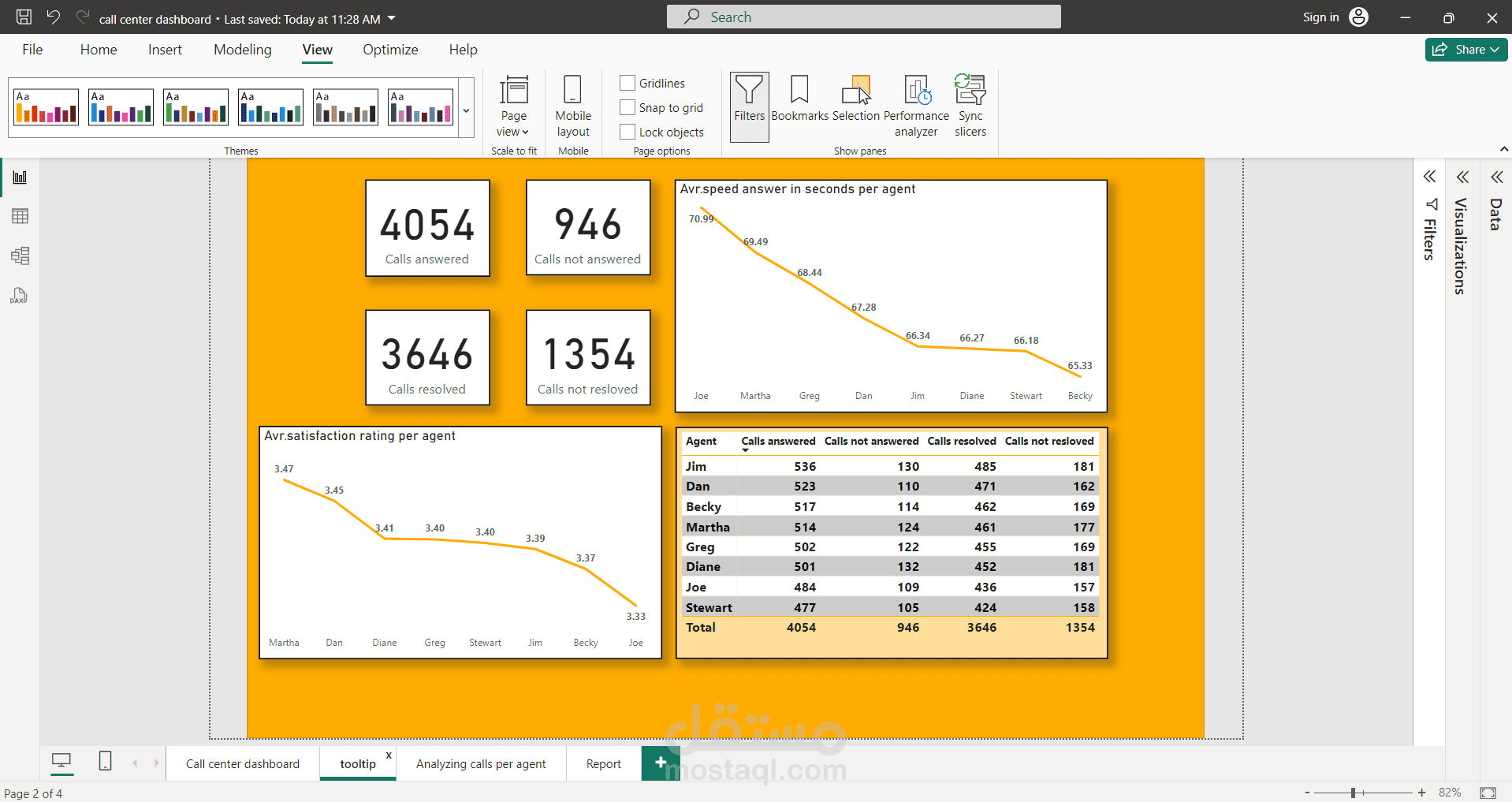 الصفحة الثالثة : تحليل تفصيلي للموظفين مشروح به عدد المكالمات التي تم تلقيها و عدد المكالمات التي تم حل مشكلتها للعملاء