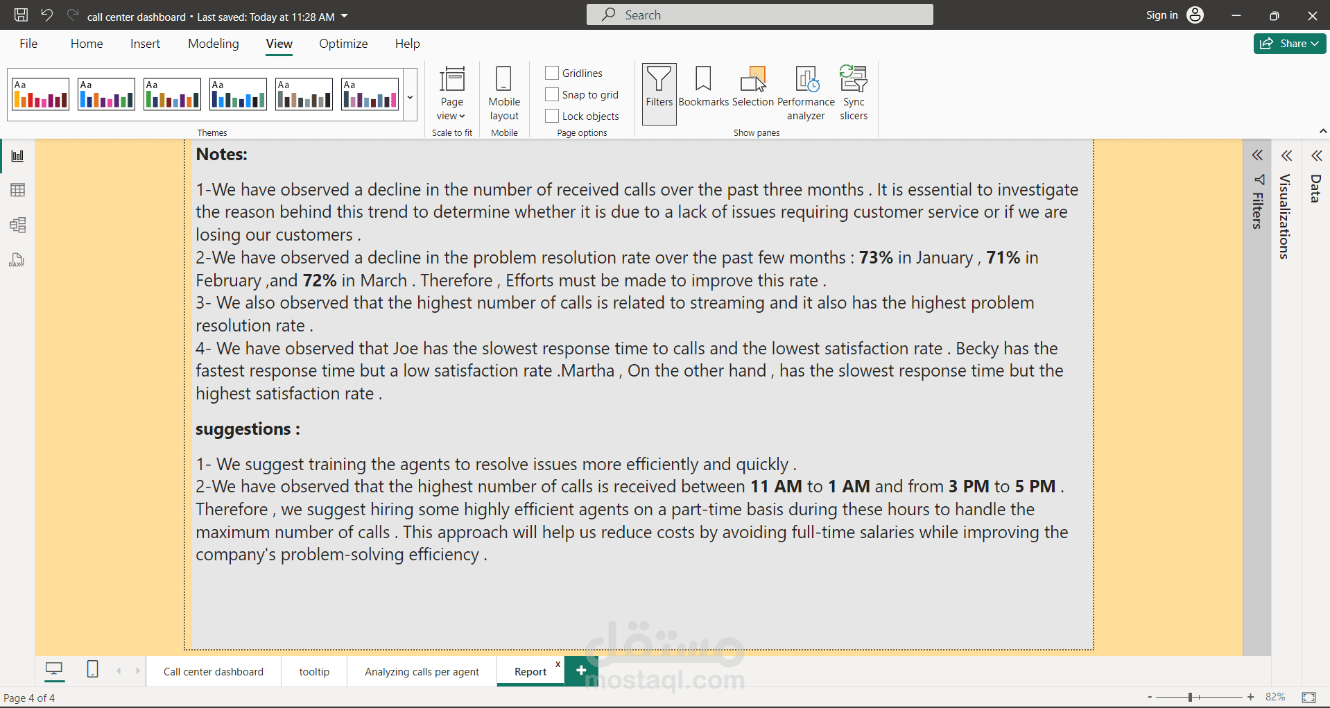 الصفحة الرابعة : تقرير تفصيل حول الداتا به بعض النقاط الايجابية و السلبية و الاقتراحات لتحسين آداء الشركة