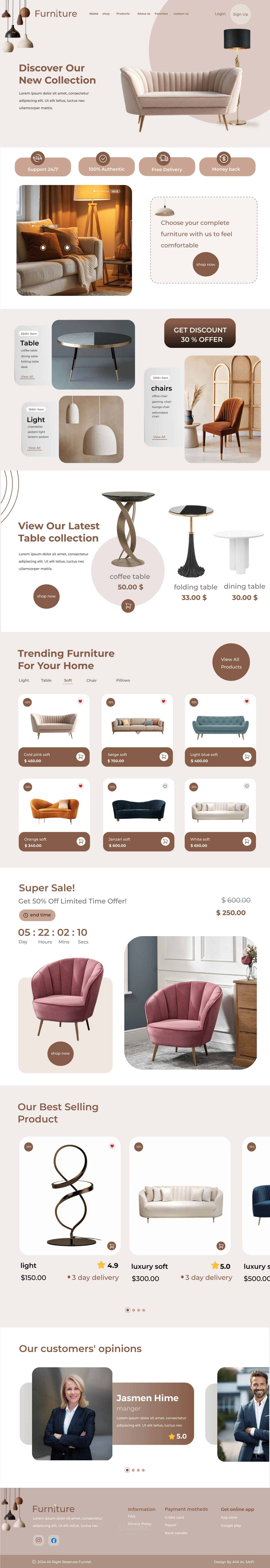 "furniture" هو متجر إلكتروني مبتكر لتسوق الأثاث العصري والمتنوع، يقدّم تجربة سهلة وسلسة للمستخدمين مع واجهات جذابة ووظائف تفاعلية تساعدهم على اختيار القطع المثالية لمنازلهم أو مكاتبهم.