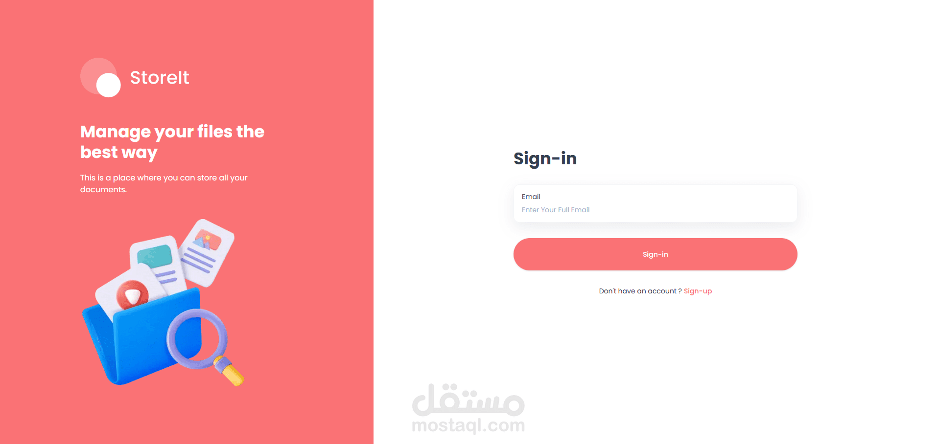 يوفر موقع Store It واجهة مستخدم عصرية وبسيطة تتيح للمستخدمين رفع ملفاتهم، تنظيمها، ومشاركتها بسهولة. تم التركيز على الأمان، السرعة، وسهولة الاستخدام لجعل الموقع وجهة موثوقة لتخزين الملفات.