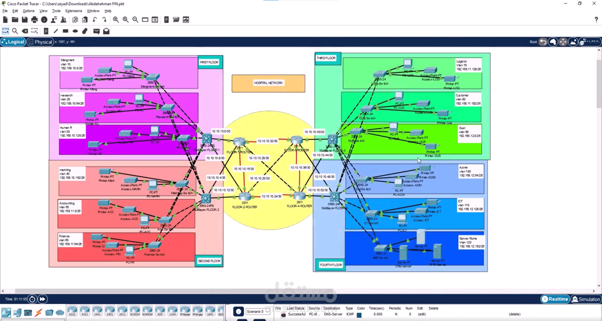 - Scalability: The network is built for future growth, with flexible VLAN and routing options to accommodate expanding branches, departments, and services.
