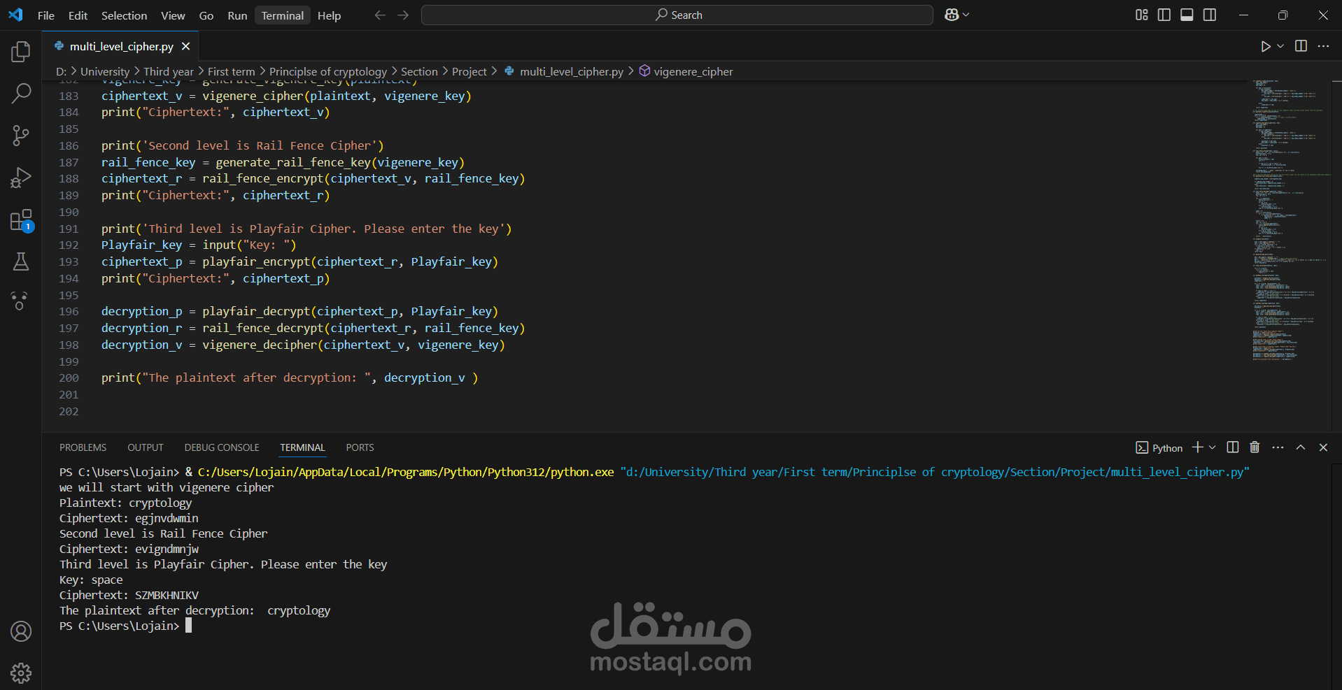 This project is a multilevel encryption / decryption python program that passes the plaintext through three different encryption techniques ,These techniques are Vigenère cipher, Rail fence cipher, and Playfair cipher, Displays the ciphertext, Then decrypts the cipher text through three stages to get back the original plain text
