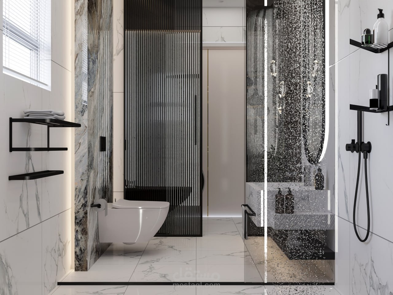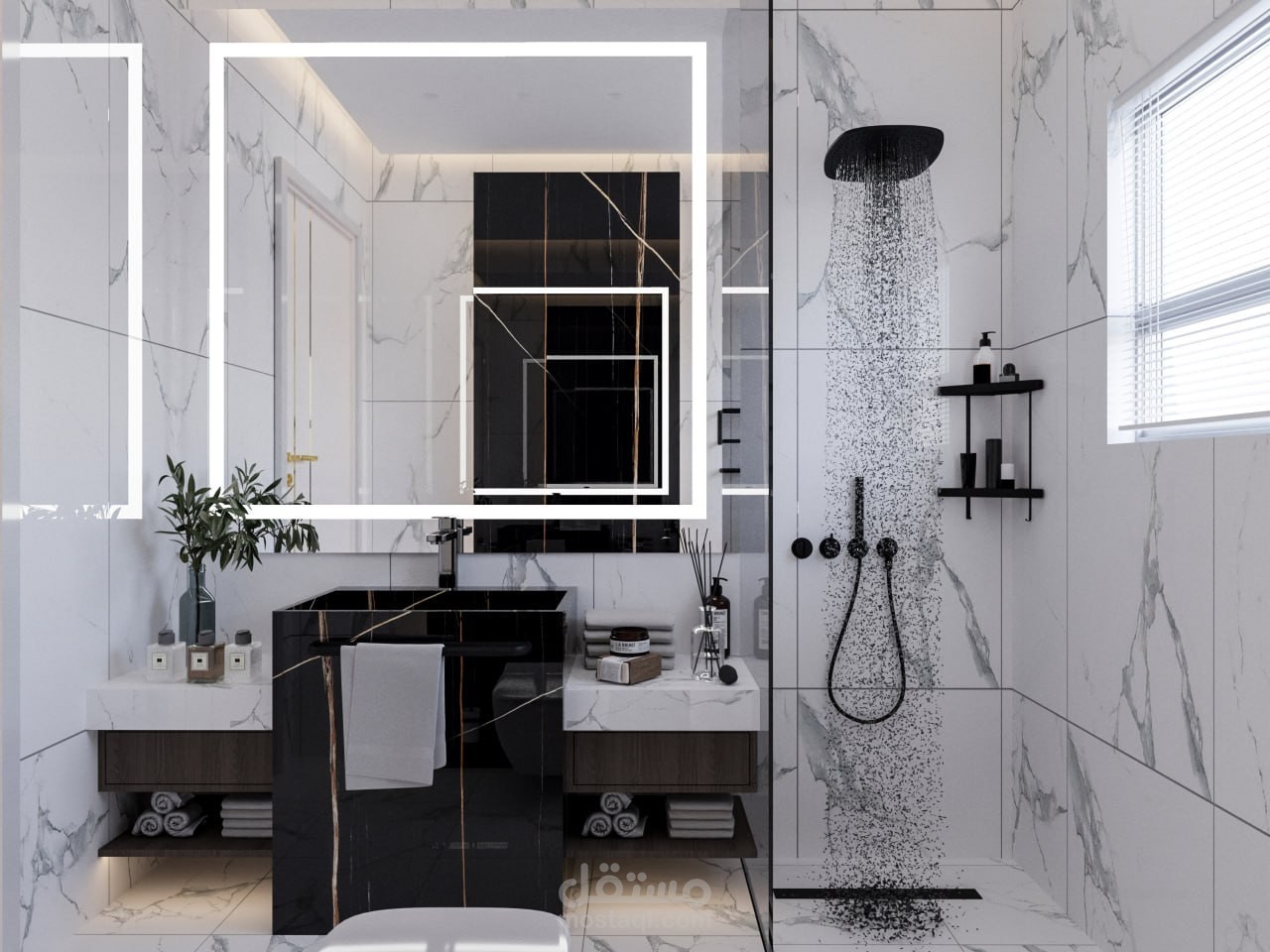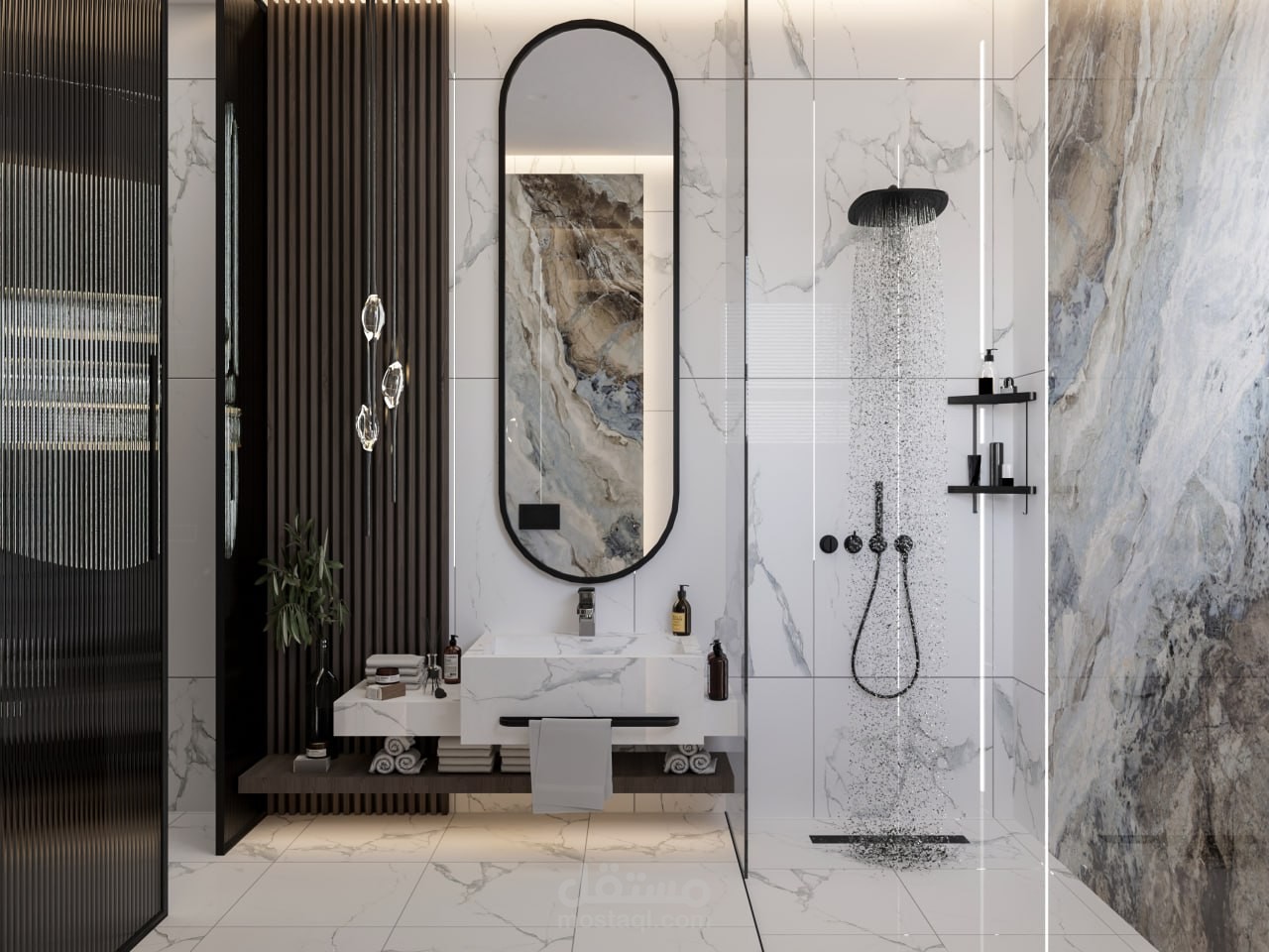 حمام رئيسي لأحد الفلل قمت بتصميمه بعد دراسة عدة نقاط