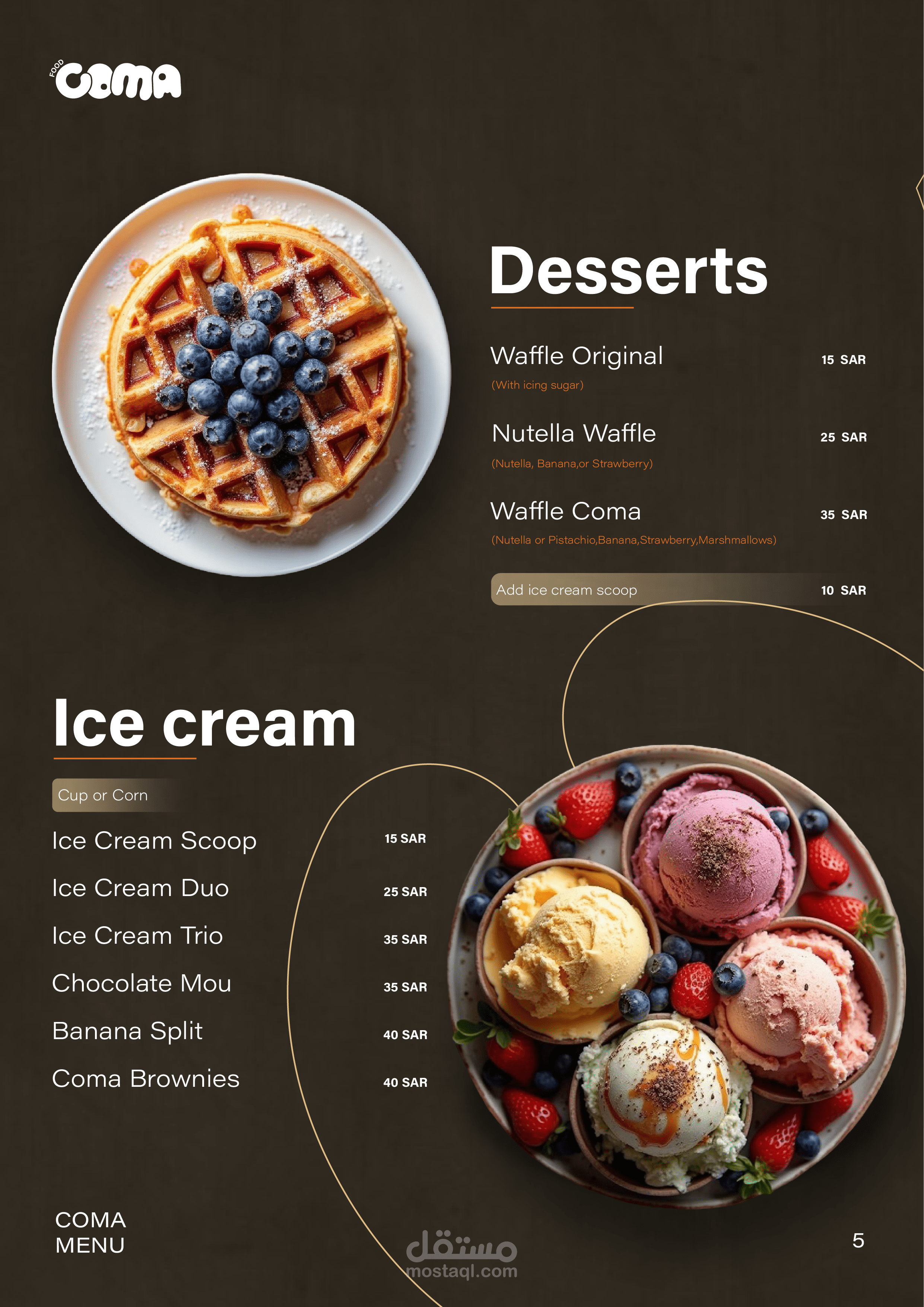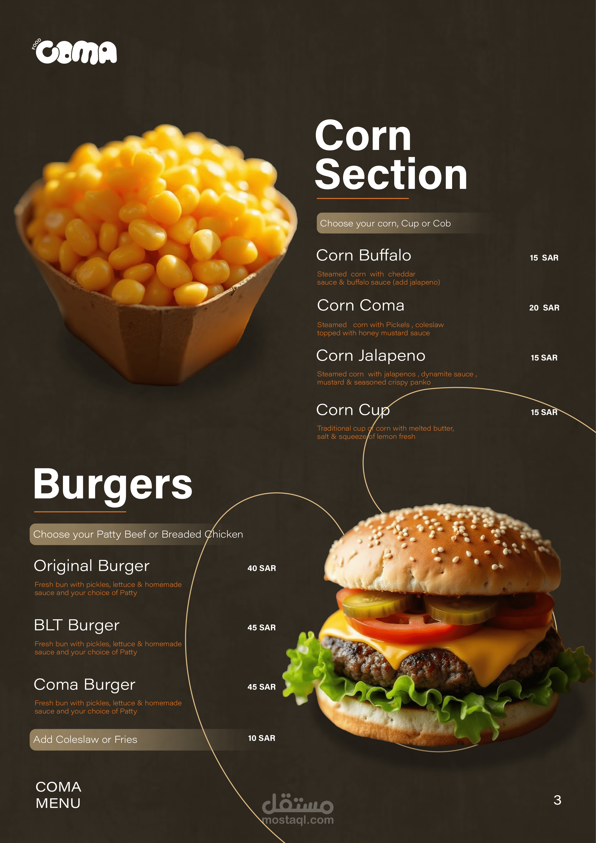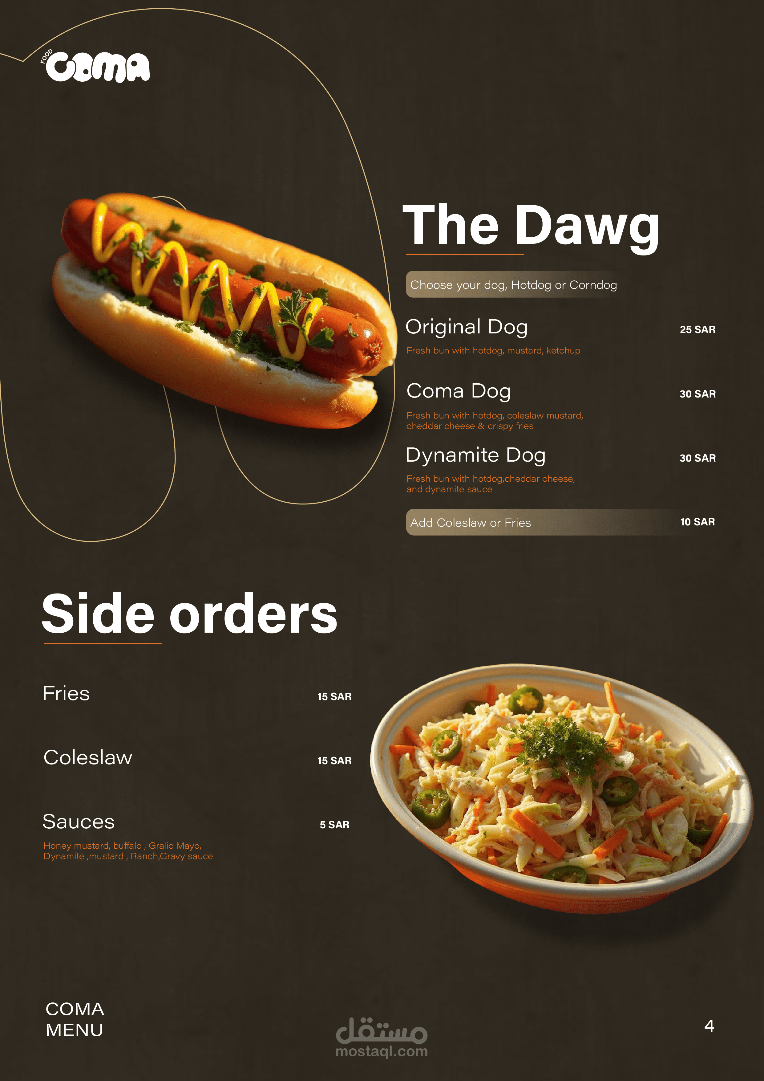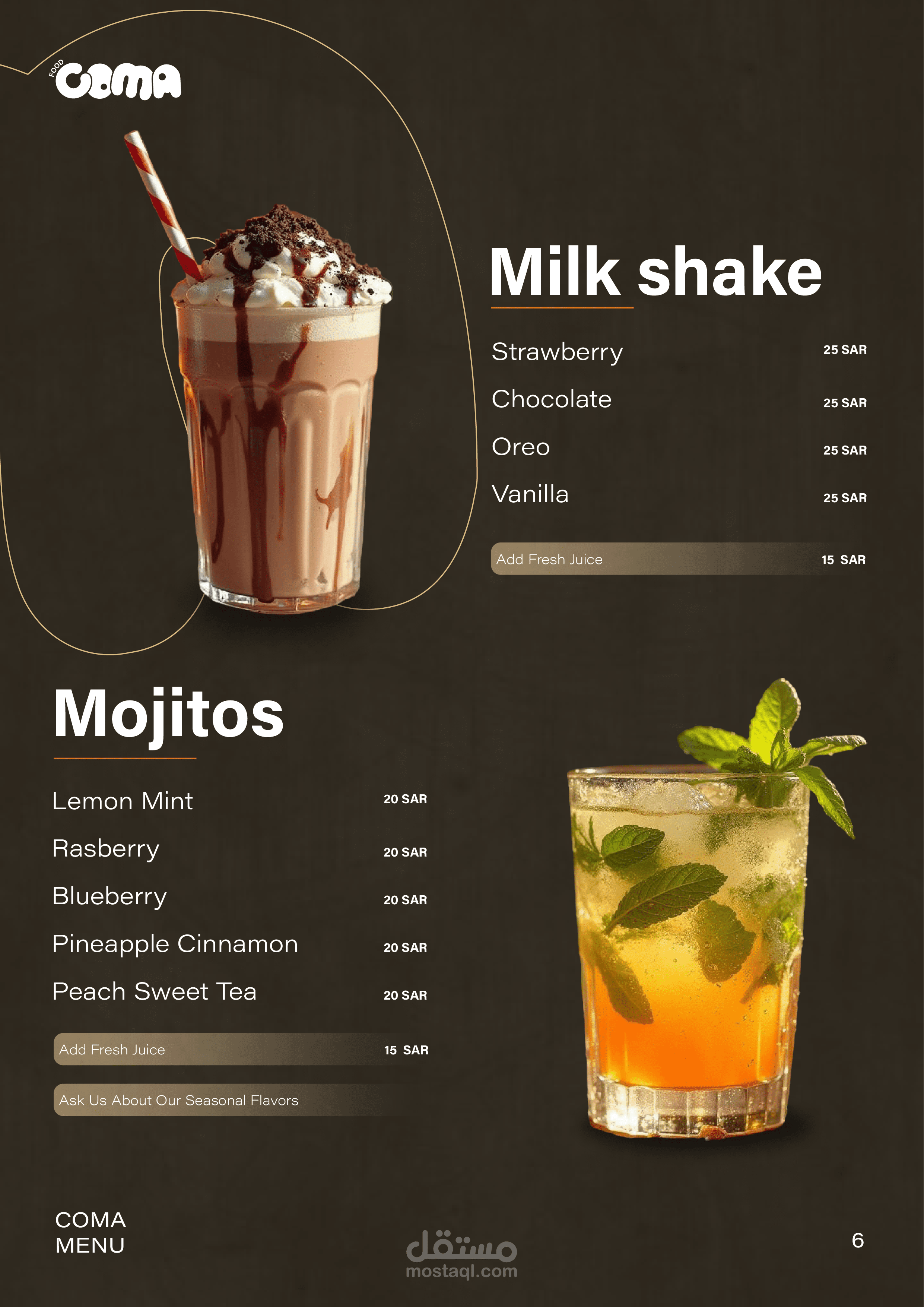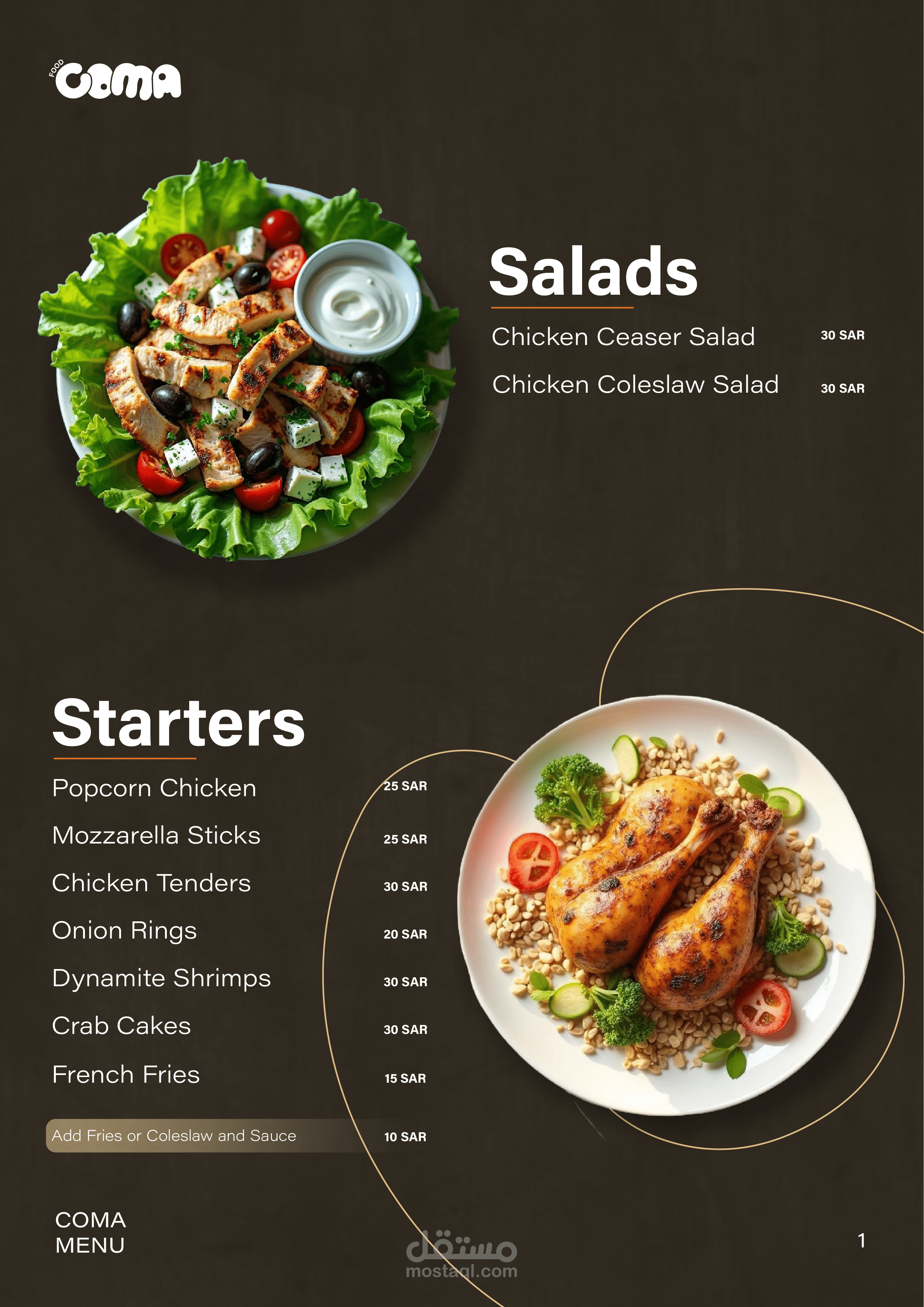 The menu design for COMA Restaurant in Saudi Arabia seamlessly blends elegance with authenticity, capturing the restaurant's identity in a captivating and innovative way. Featuring a modern aesthetic, the design reflects the rich flavors offered, with carefully chosen colors and typography that evoke the warmth of Arabian hospitality and the diversity of the cuisine. The layout is clean and organized, ensuring effortless navigation for guests, while creative touches add a unique flair that stimulates appetite and leaves a lasting impression. This menu is not just a list of dishes; it’s an artistic experience that invites guests to savor every bite.