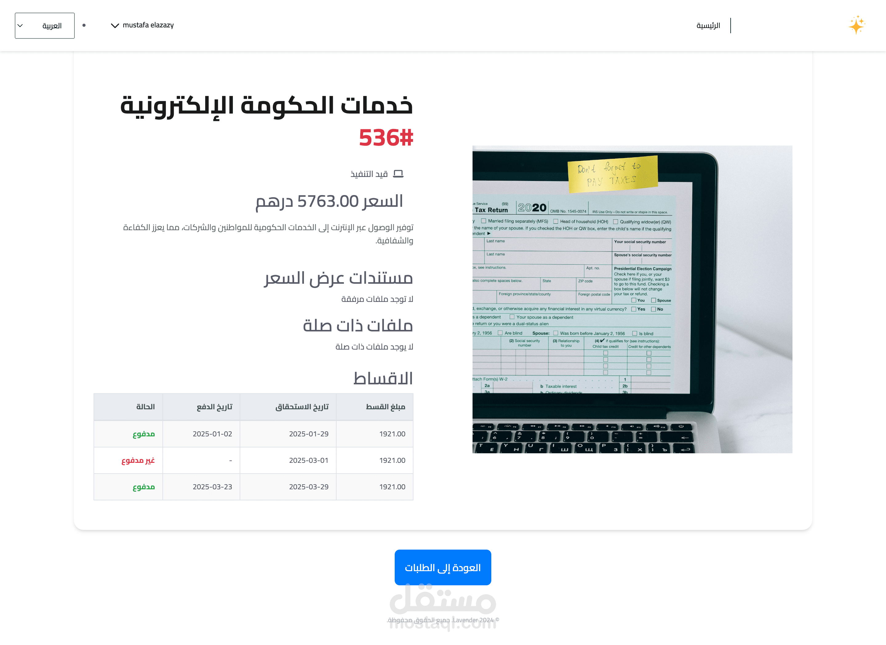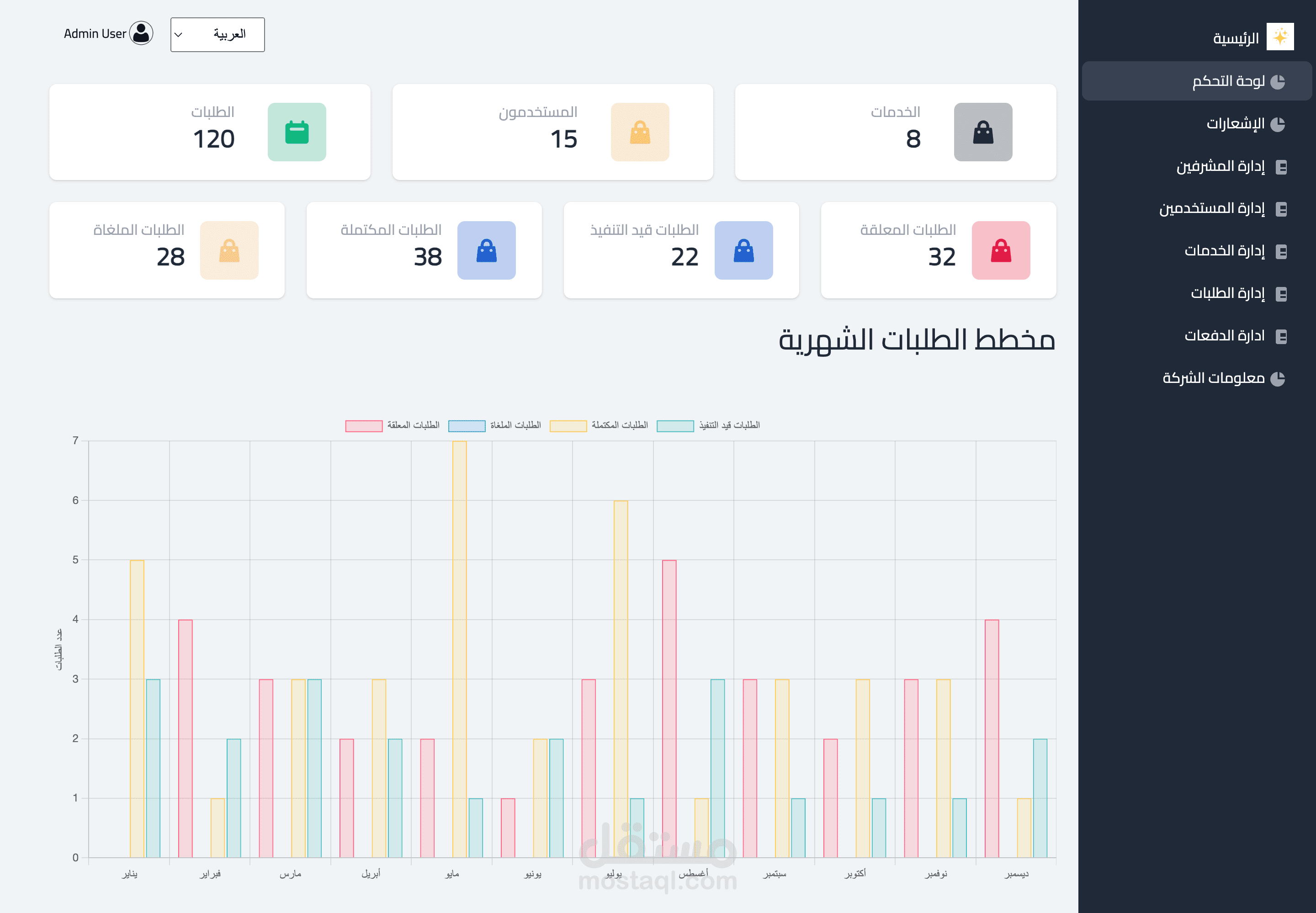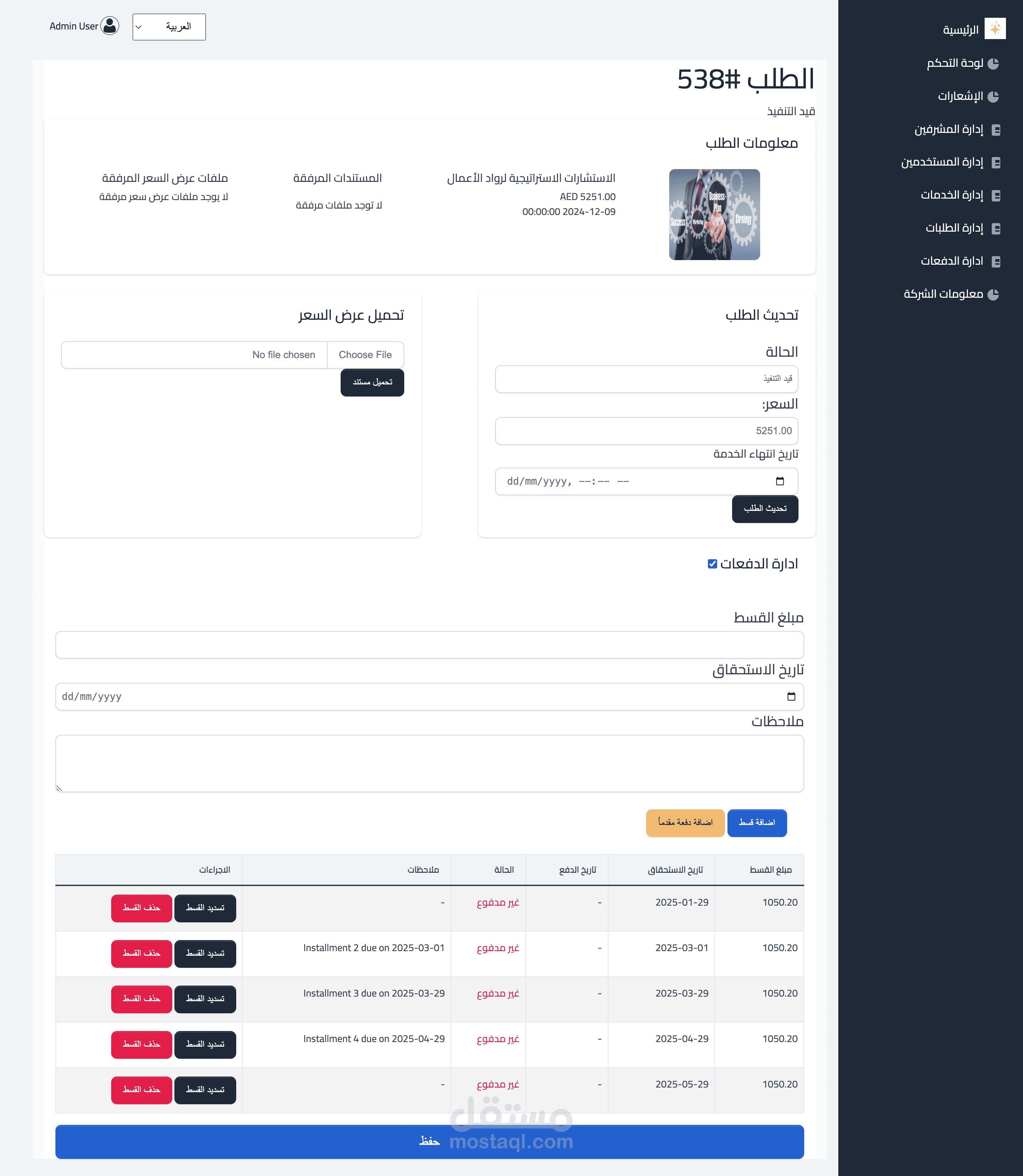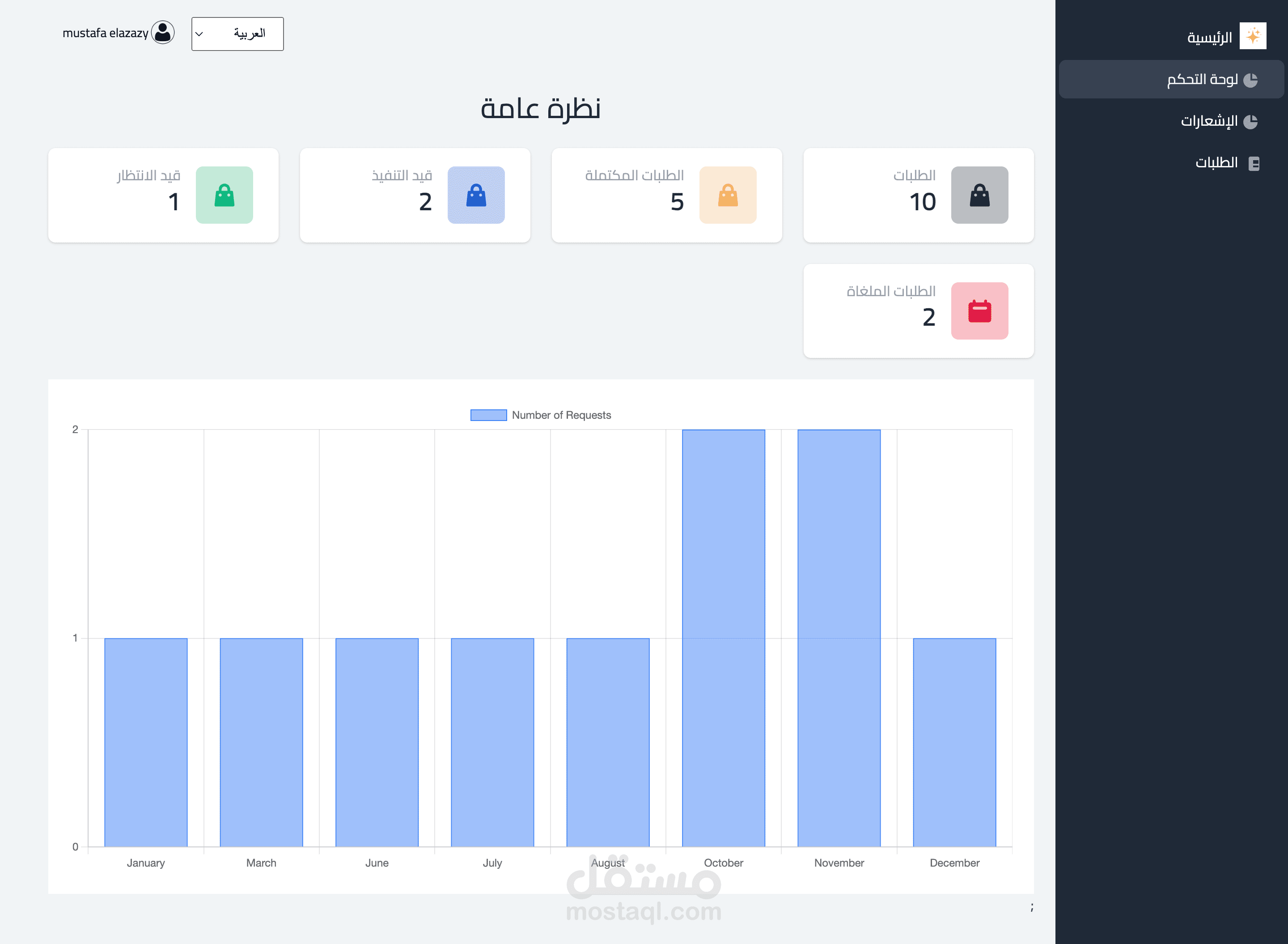 متابعة حالة الطلب (قيد الانتظار، قيد التنفيذ، مكتمل).