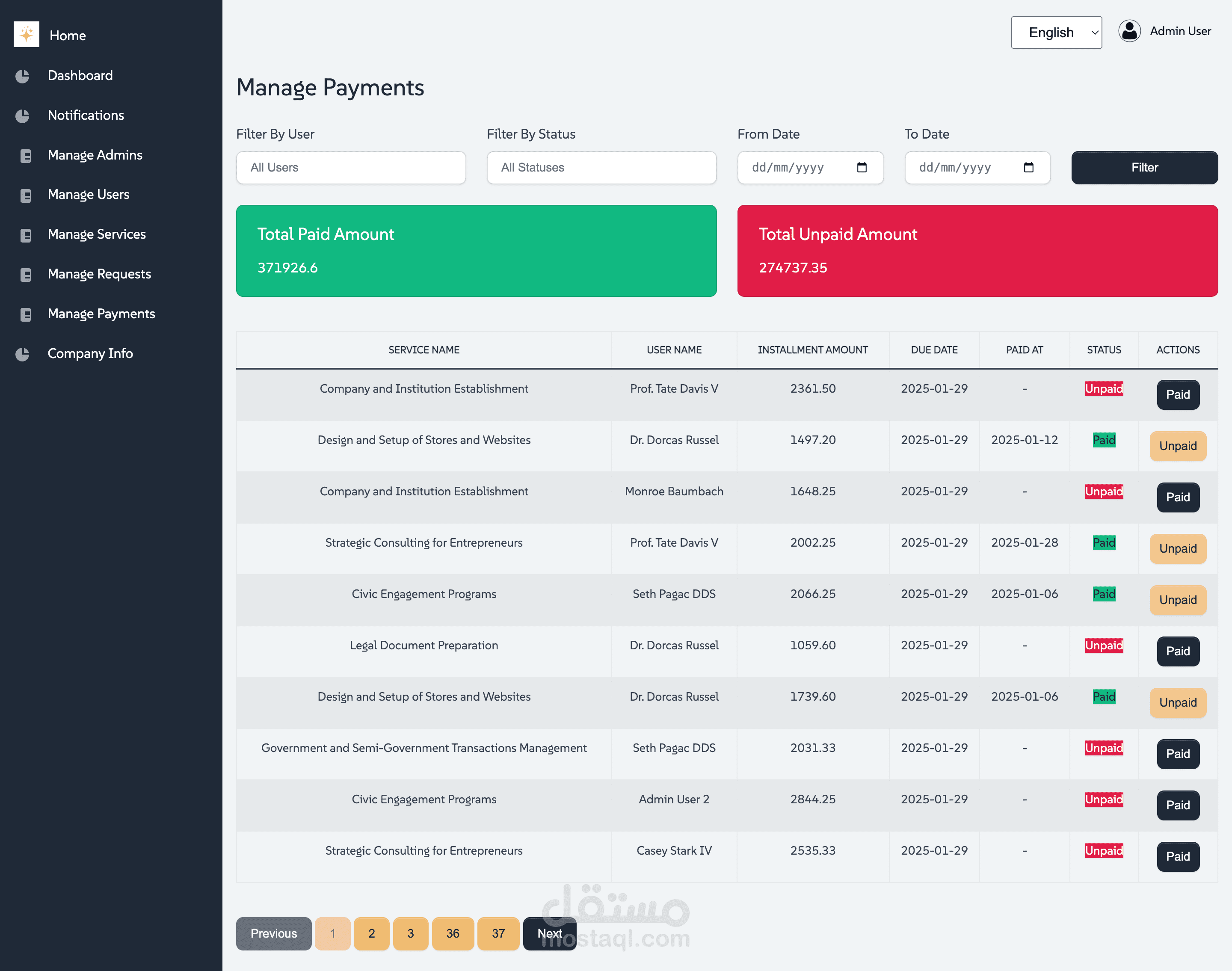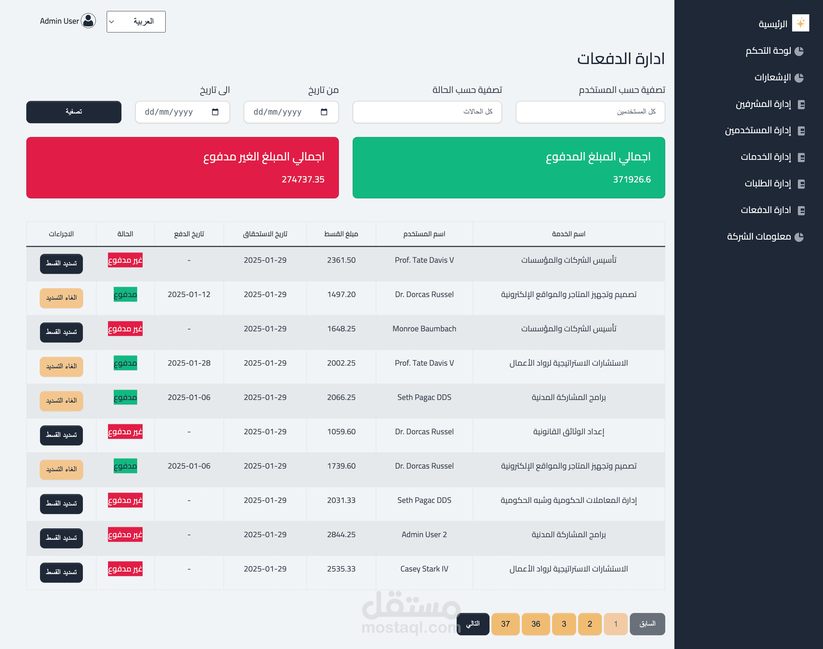 التصفية والبحث: لتسهيل العثور على الخدمات أو الطلبات.