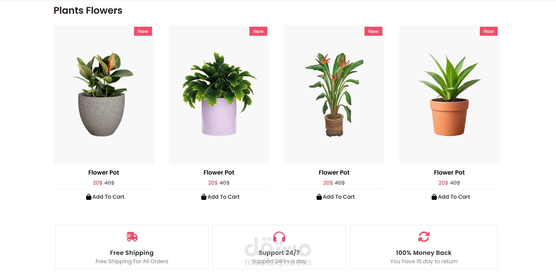 - قسم للخدمات مثل الشحن المجاني، الدعم على مدار الساعة، وضمان استرداد الأموال.