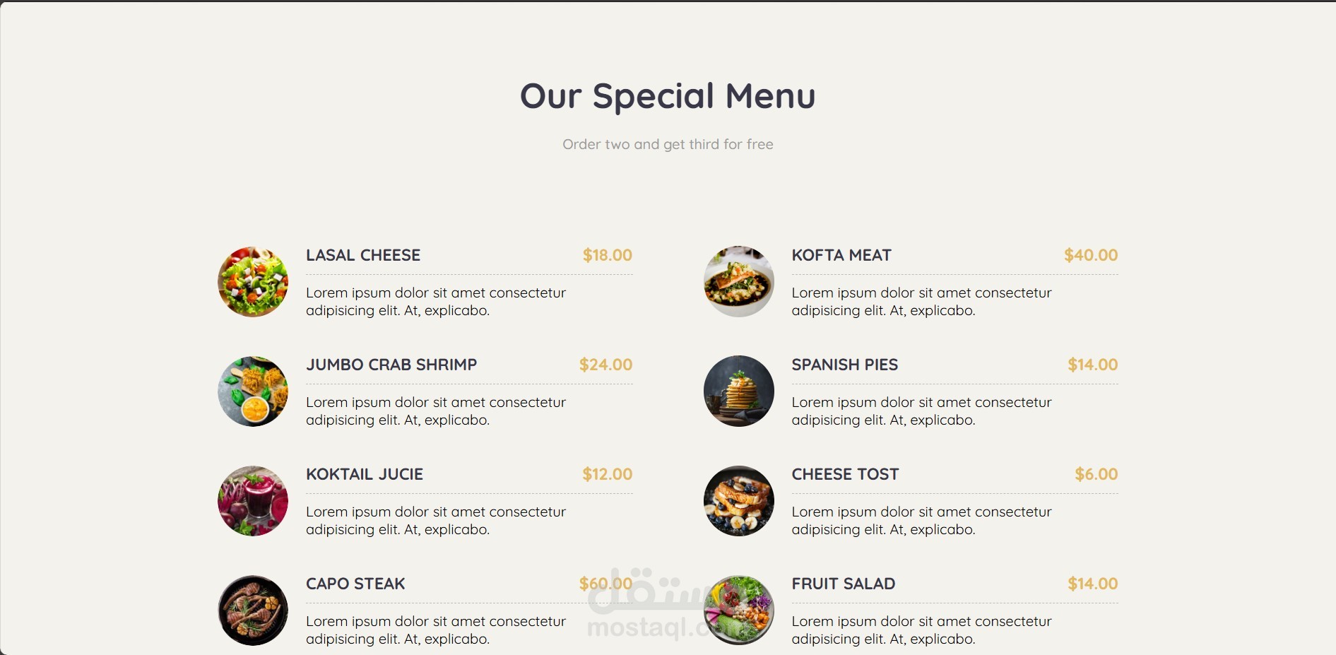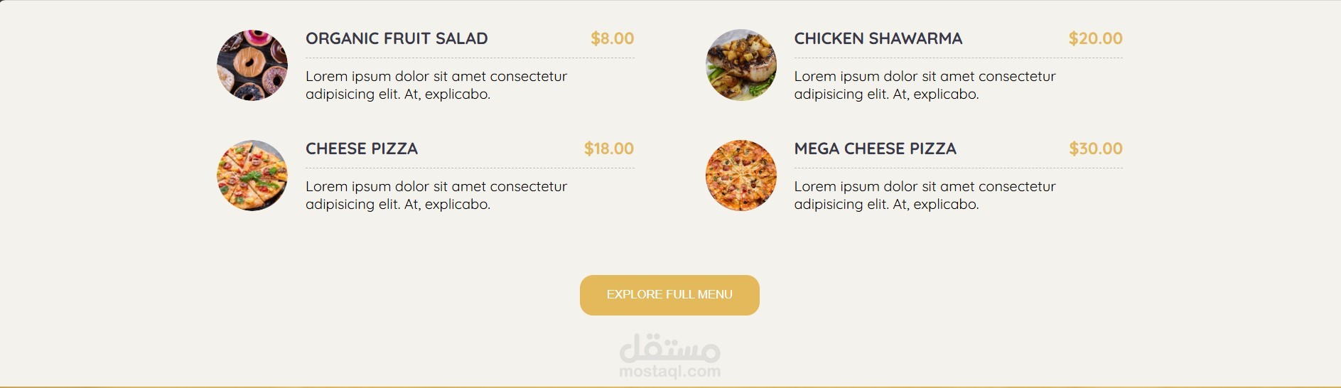 عرض العناصر: يتضمن هذا القسم عرضاً لعناصر مختلفة يمكن للمستخدمين الاطلاع عليها. كل عنصر يعرض صورة دائرية بالإضافة إلى عنوان فرعي ووصف قصير له.