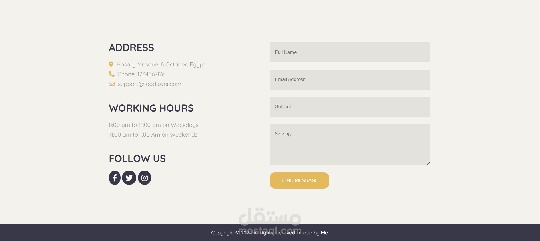 نموذج الاتصال: يتيح للمستخدمين إرسال رسائل مباشرة من خلال النموذج الموجود في القسم. يحتوي على حقول لتعبئة البيانات مثل الاسم والبريد الإلكتروني، بالإضافة إلى مساحة للنص.