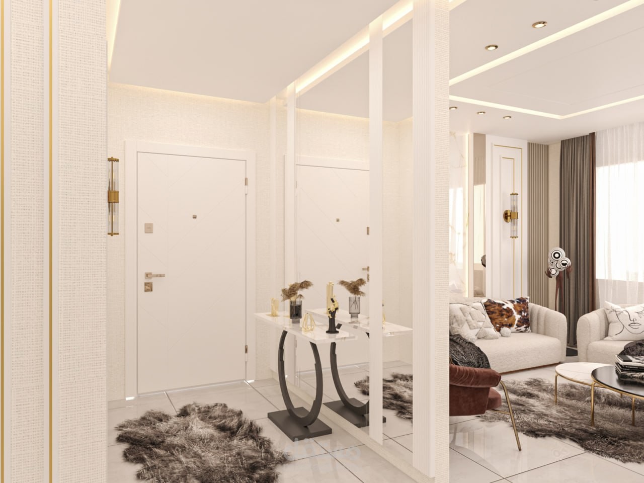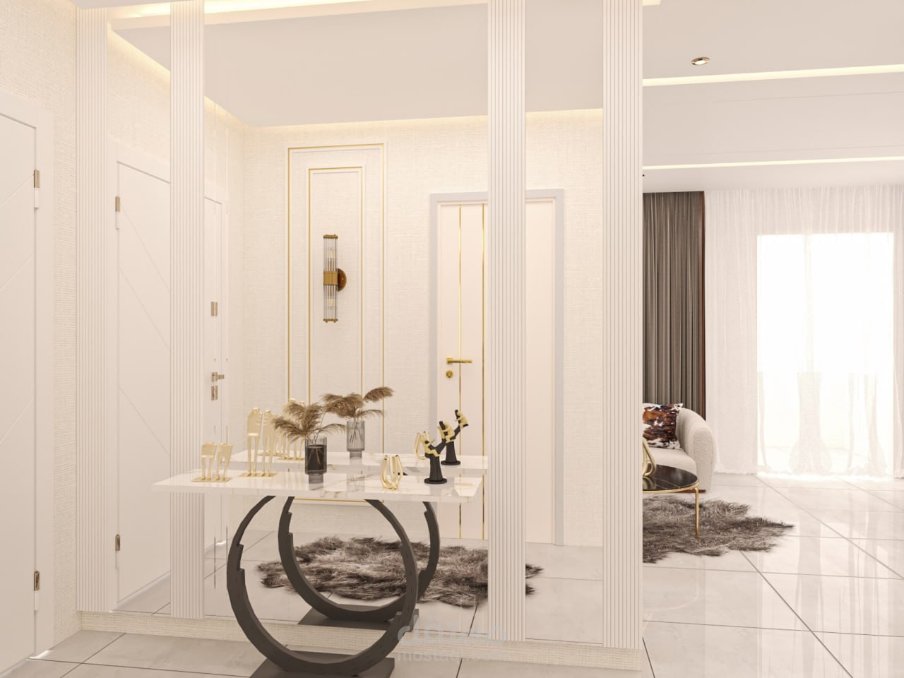 يشمل التصميم مدخل الشقة مع صالة المعيشة والمطبخ ومنطقة الطعام