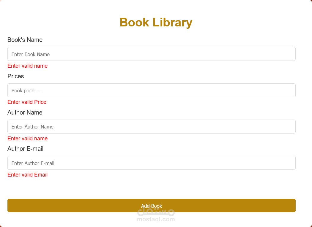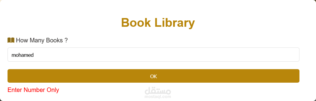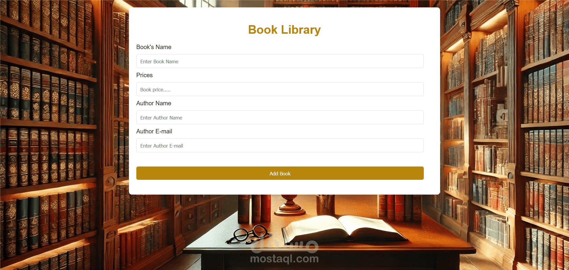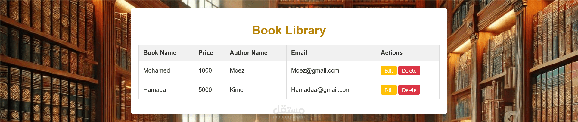 a library project that take from user how many books he want to add to database ,then take from him inputs like(book Name, price ,Author Name and email) then validate on each input then (display data in a table ) that have an action column which has(edit or delete) a edit action can edit the input that user entered from second stage or can cancel edit and delete delete entire row from saved inputs