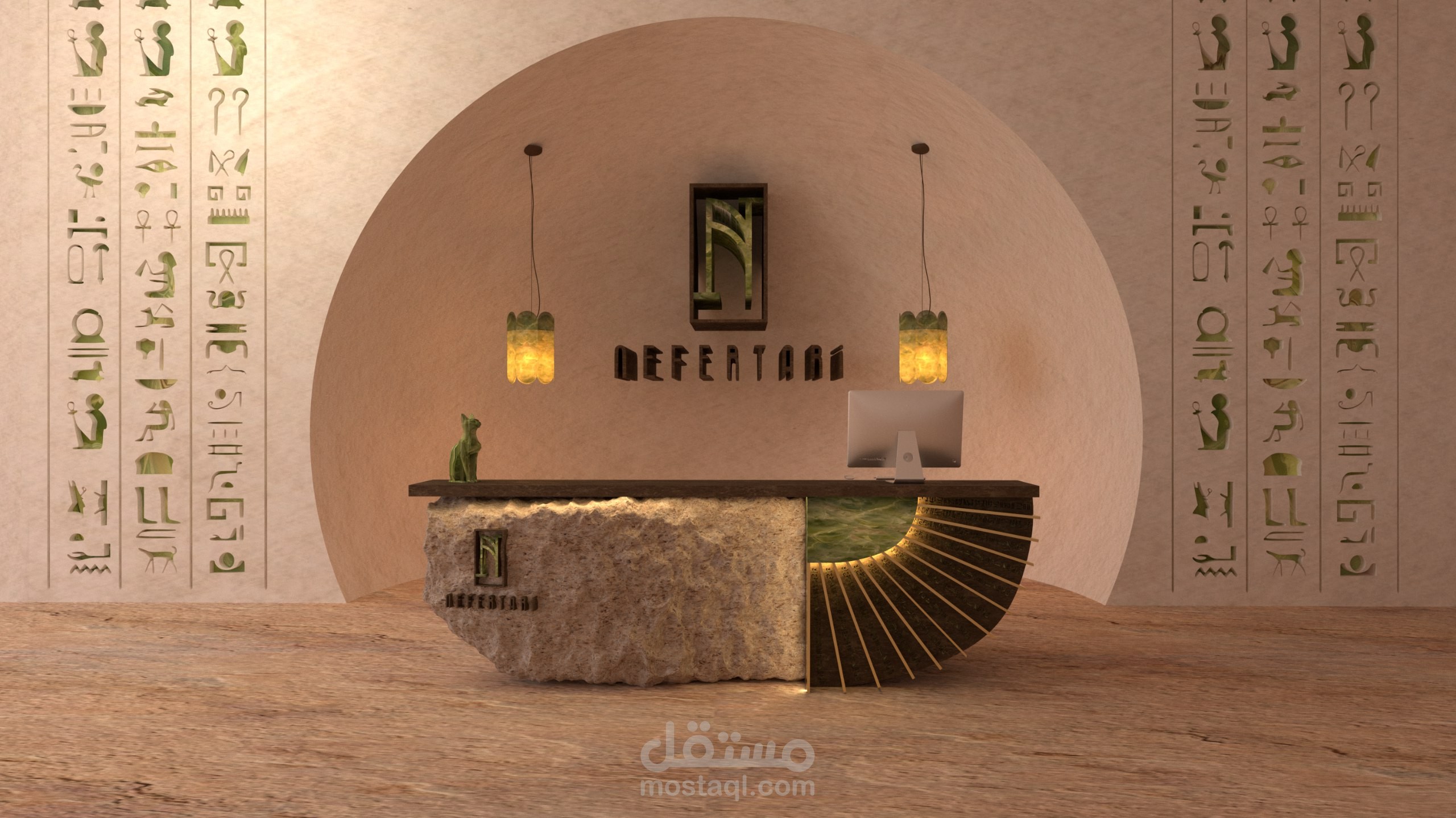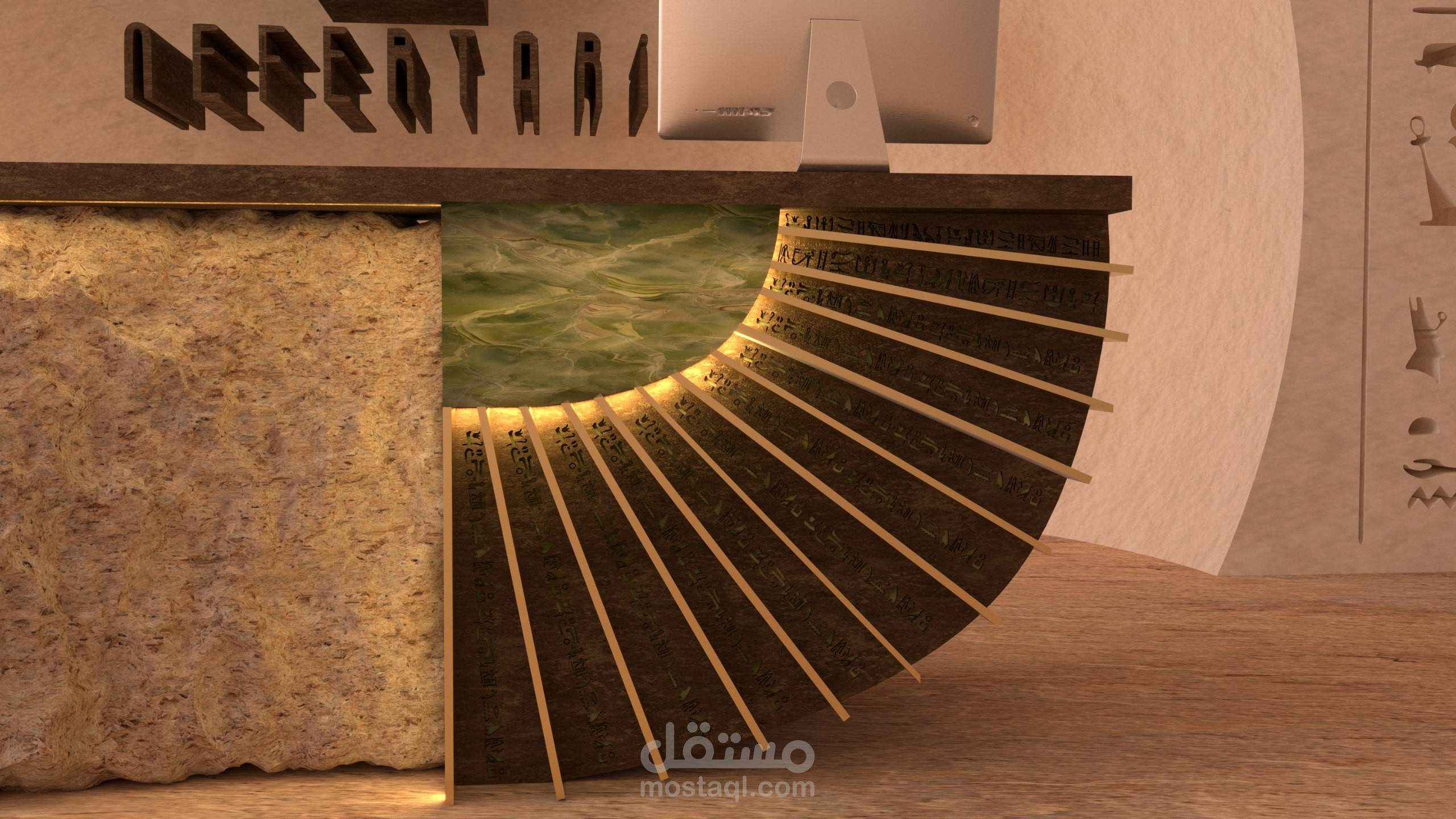A hotel reception desk design inspired by ancient Egyptian civilization, utilizing flooring materials and colors drawn from the rich palette of Egyptian heritage.