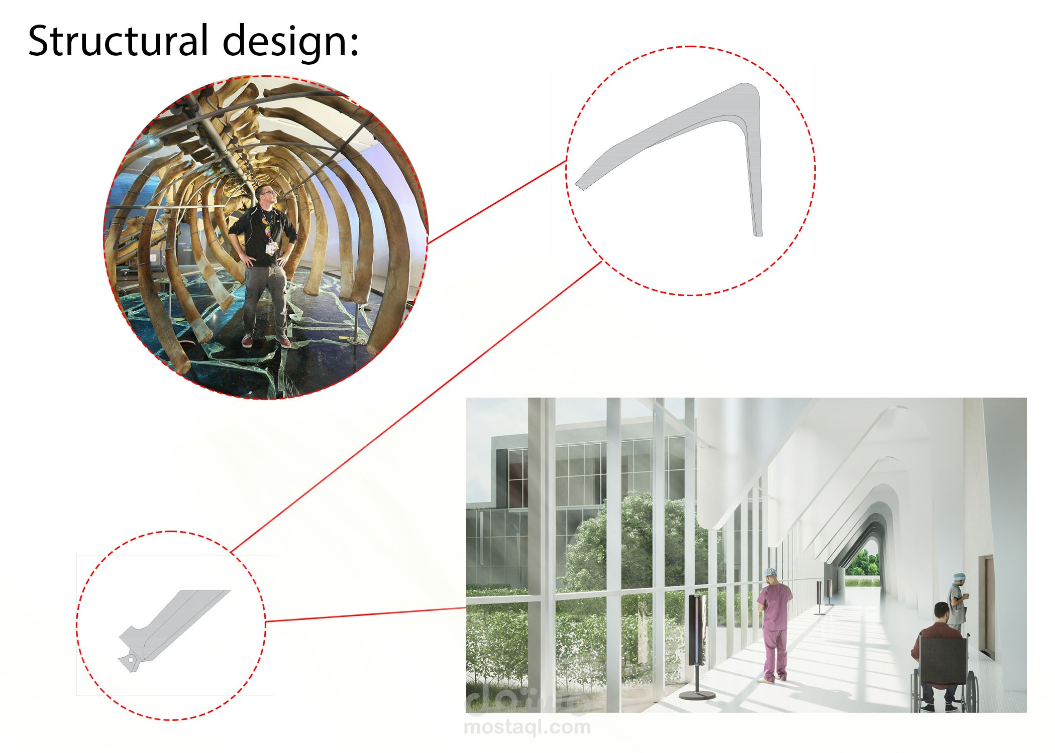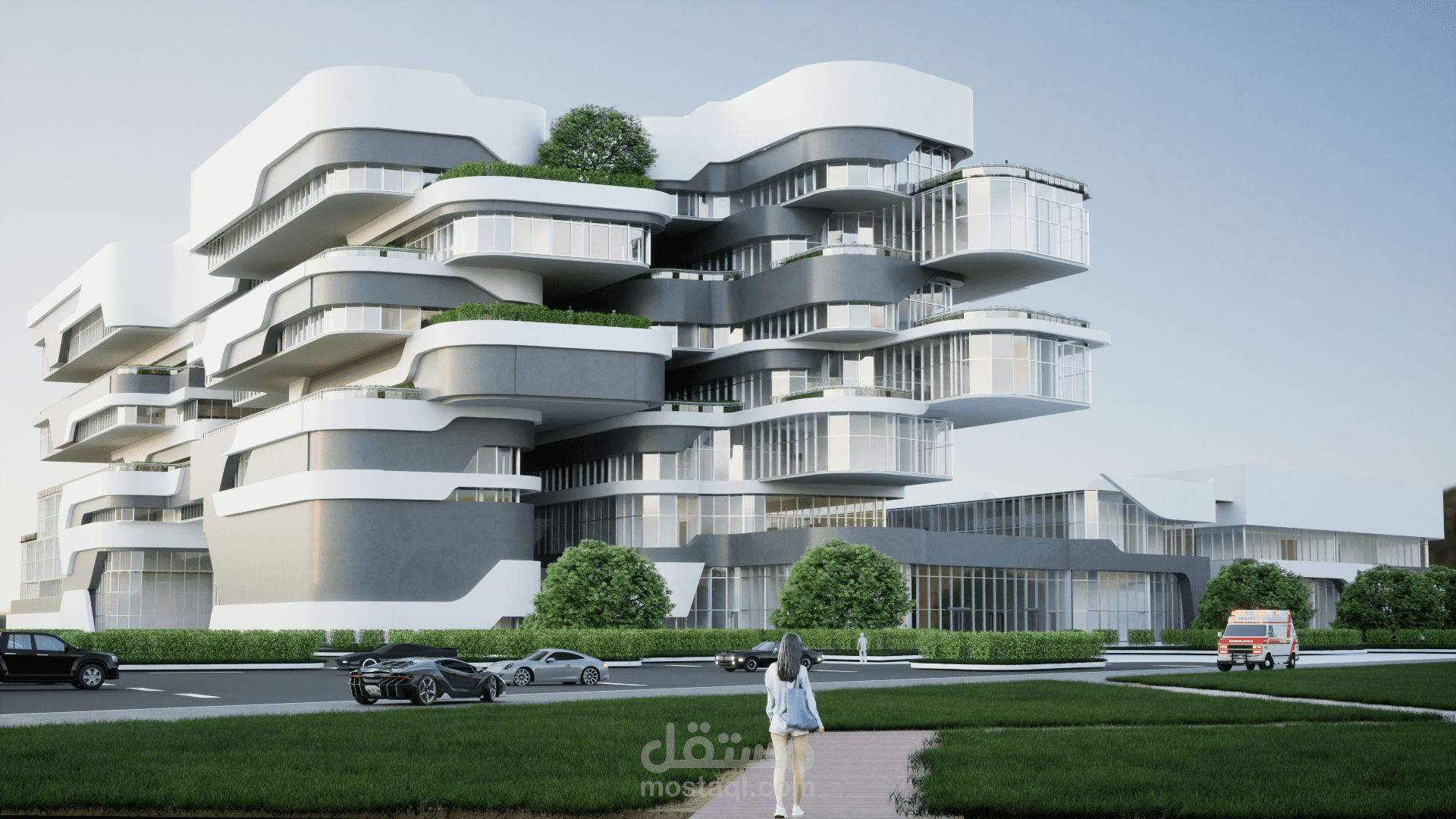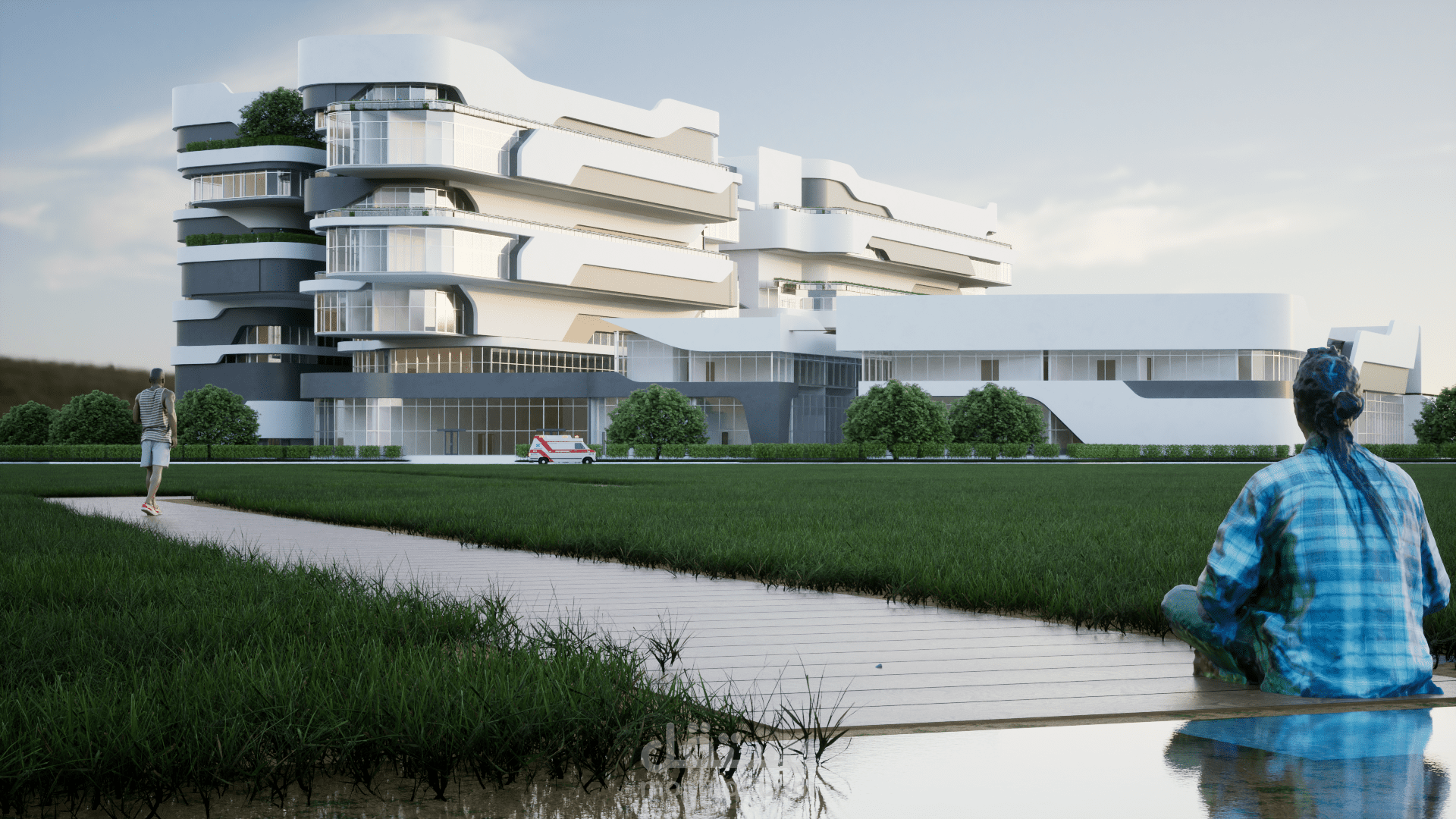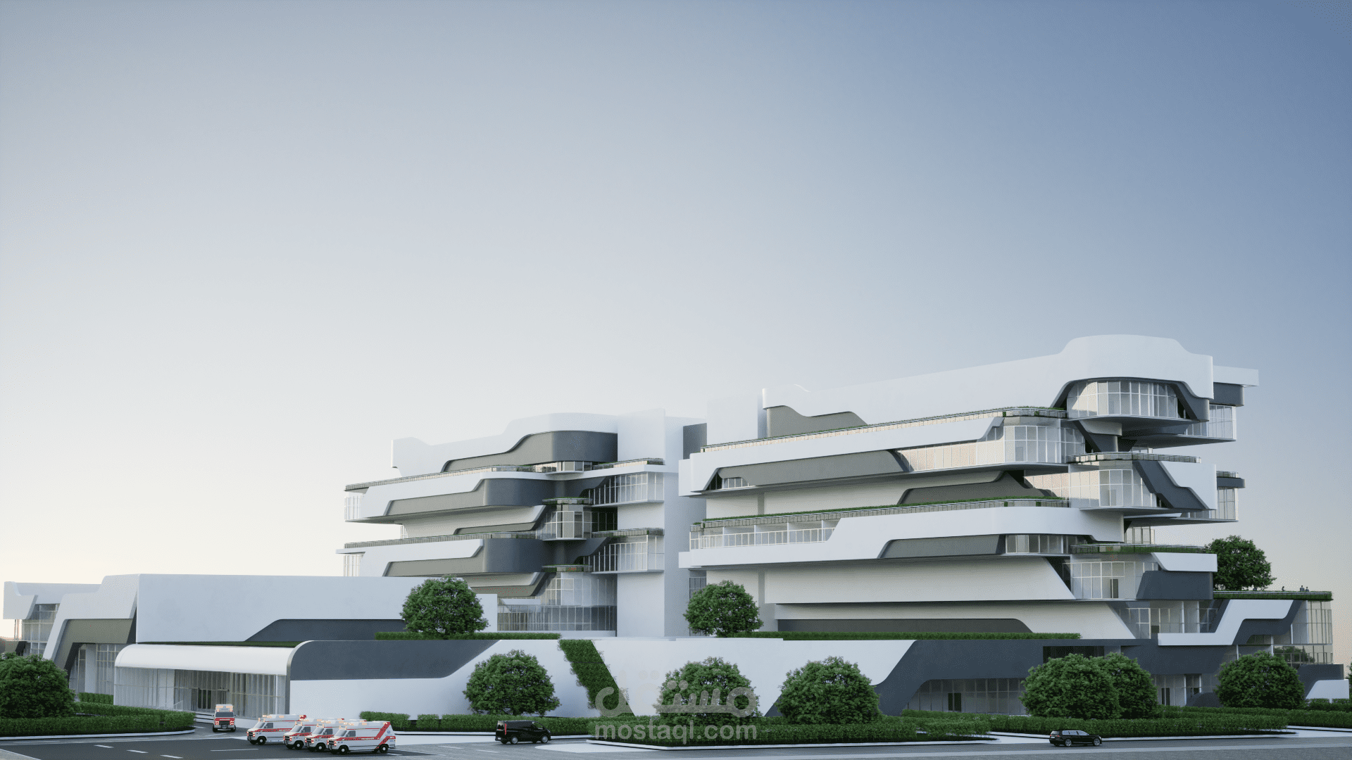 مستشفة عامة تحتوي على جميع الاقسام الخاصة بل مستشفى الفكرة التصميمية هي تجريد للقفص الصدري للحوت ومبنى مستدام في نفس الوقت يحقق جميع معايير الاستدامة من توفير للطاقة توجيه صحيح تهوية طبيعية وغيرها من الامور المهمة في الاستدامة وحاصل على جائزة تقدير في مسابقة الابنية المستدامة سنة 2024