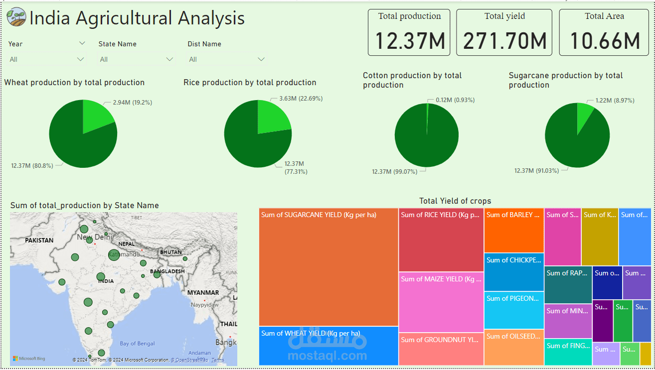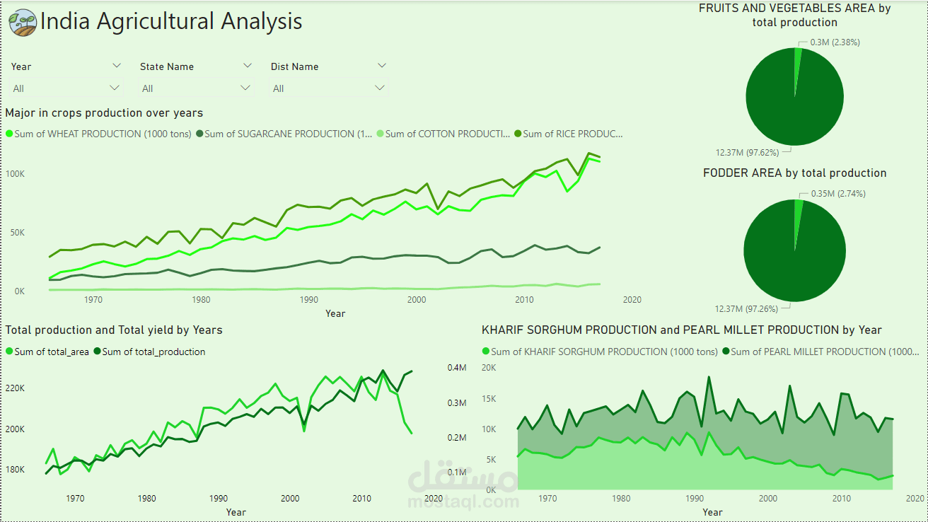 This project aims to conduct a comprehensive analysis of Indian agriculture, focusing on district-wise and year-wise data. The dataset provides detailed information on various crops, their areas, production, and yields across different districts and years. The goal is to leverage Power BI to create interactive visualizations that uncover trends, patterns, and disparities in agricultural practices, enabling stakeholders to make informed decisions for sustainable farming and resource allocation.