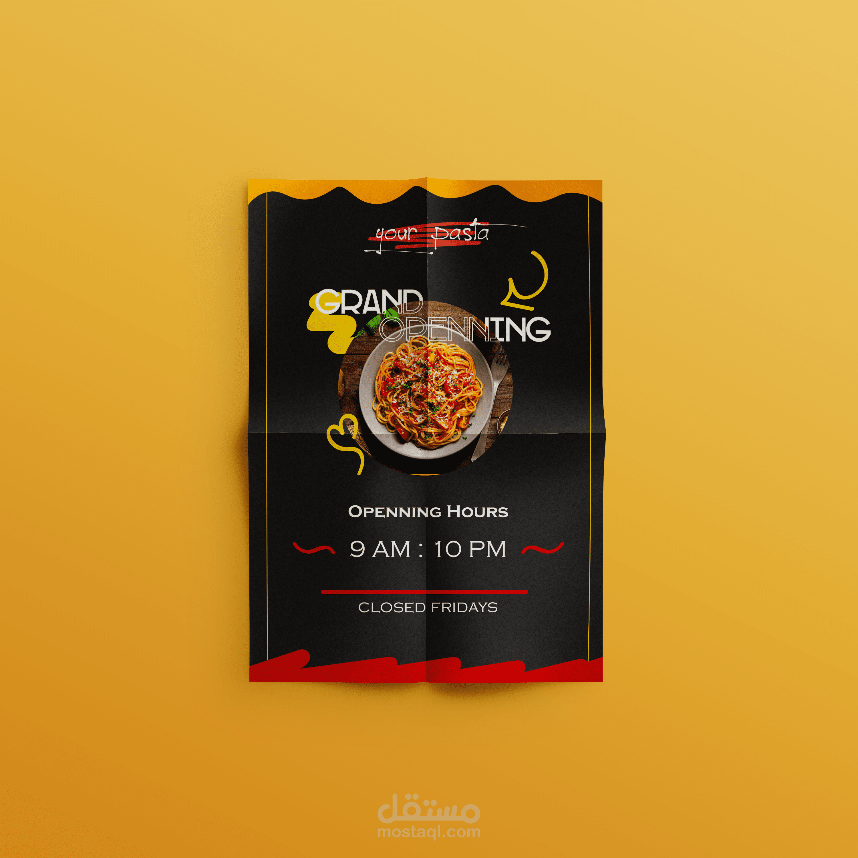 هذا الفلاير تم تصميمه خصيصًا للافتتاح الكبير لمطعم "Your Pasta". يتميز التصميم بموازنة الألوان الجريئة مع الخطوط النظيفة لخلق تخطيط ملفت للنظر يوضح الغرض من الإعلان بشكل فوري.