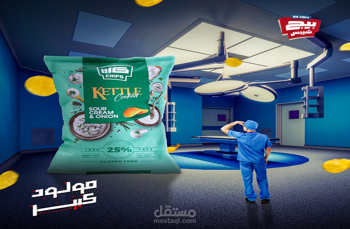 هذا المشروع عبارة عن تصميم إعلان لشركة بيج شيبس للترويج لمنتجهم الجديد بنكهات طبيعية وصحية. استلهمت الفكرة من مفهوم " مولود كبير "