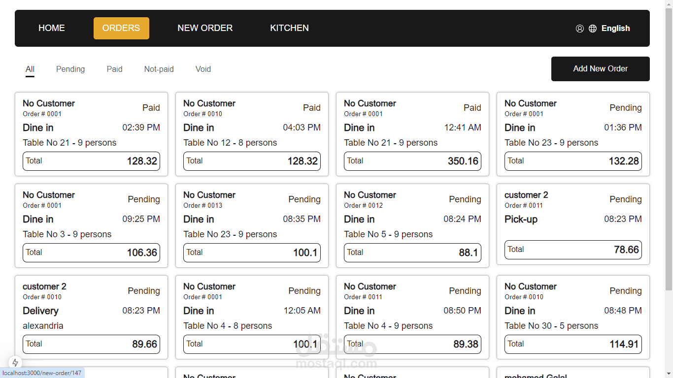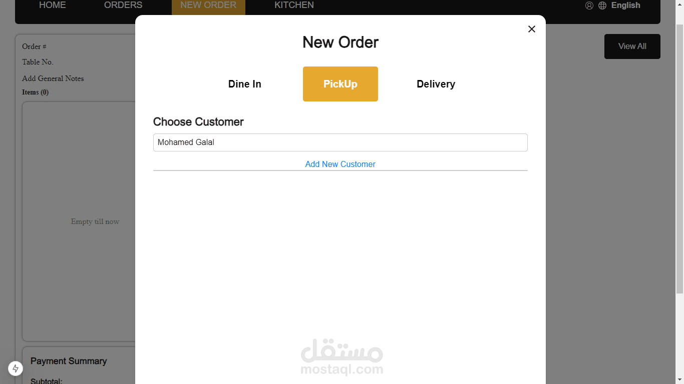 نظام إدارة طلبات المطاعم الذي يهدف إلى تحسين عملية الطلبات لخدمات الطعام داخل المطعم، والاستلام، والتوصيل. تم بناء هذا النظام باستخدام أحدث التقنيات في الويب لضمان تجربة سلسة وفعالة لكل من موظفي المطعم والعملاء.