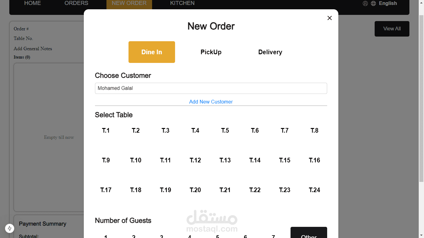 إدارة معلومات العملاء، بما في ذلك تخصيص الطاولات وعدد الضيوف (للطلبات داخل المطعم فقط). وفي حالة التوصيل، يُطلب اسم العميل وعنوانه.