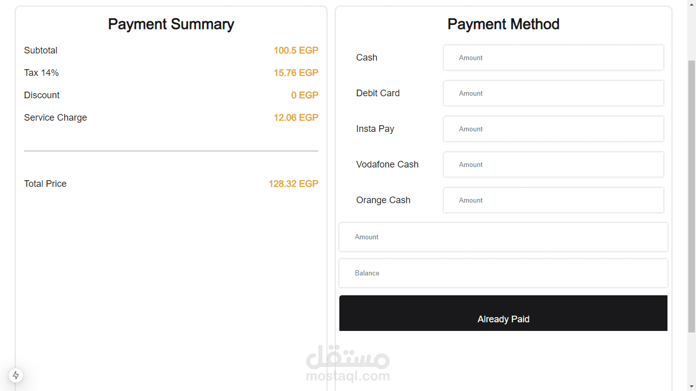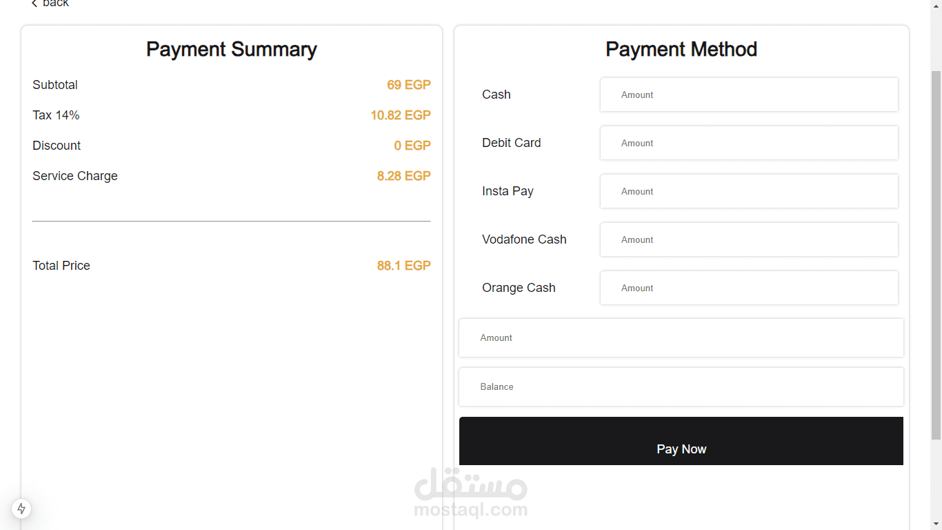 معالجة المدفوعات وإظهار الإجمالي والضرائب ورسوم الخدمة.
