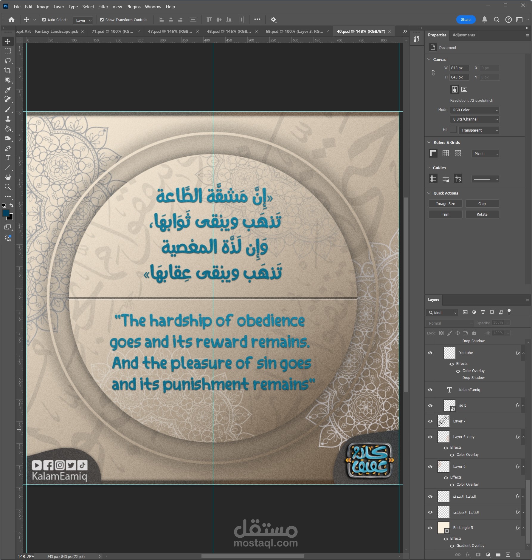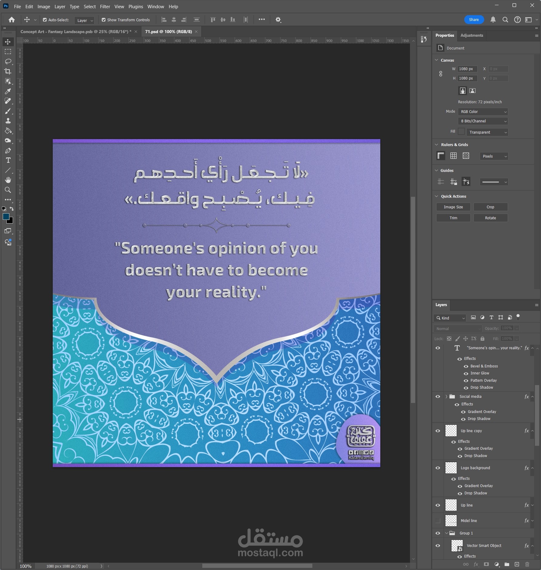 انتقلت إلى Photoshop لإضافة الحيوية والتفاصيل الدقيقة. قمت بدمج الخلفيات المناسبة لكل تصميم، باستخدام Textures وGradients لمنح الصور عمقًا وجاذبية. كما أضفت عناصر بصرية خفيفة مثل الظلال والتوهجات لإبراز الاقتباسات بشكل أنيق.