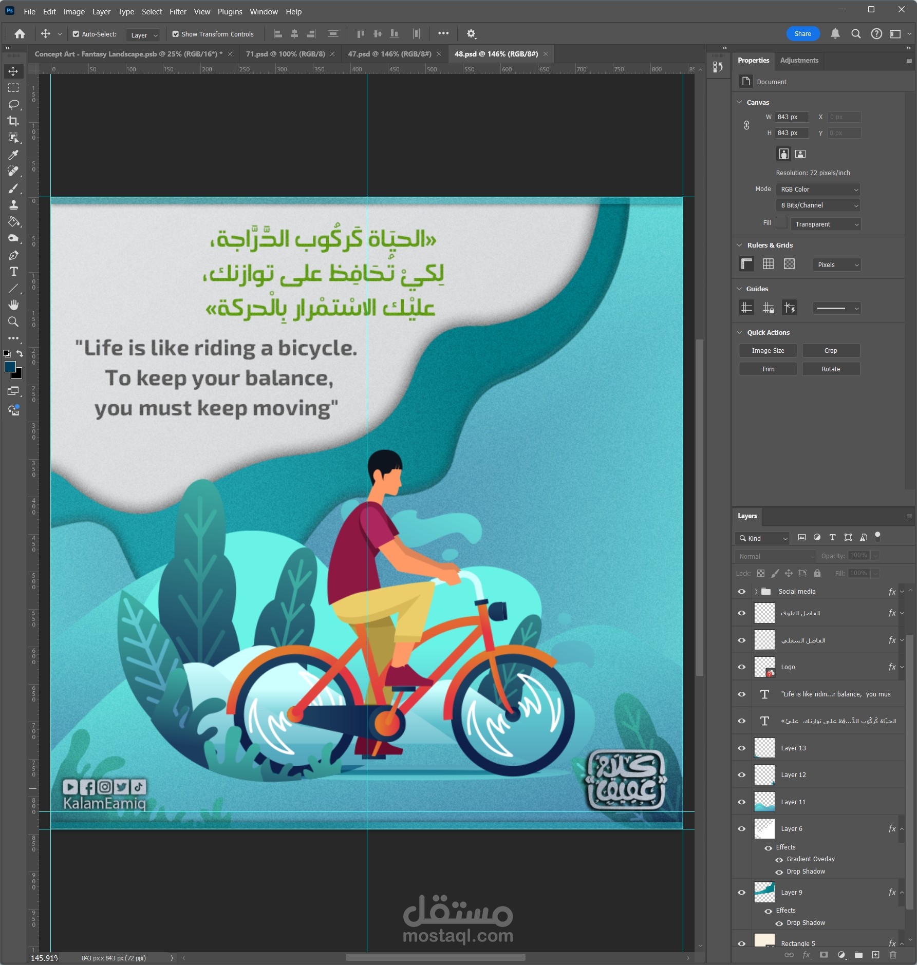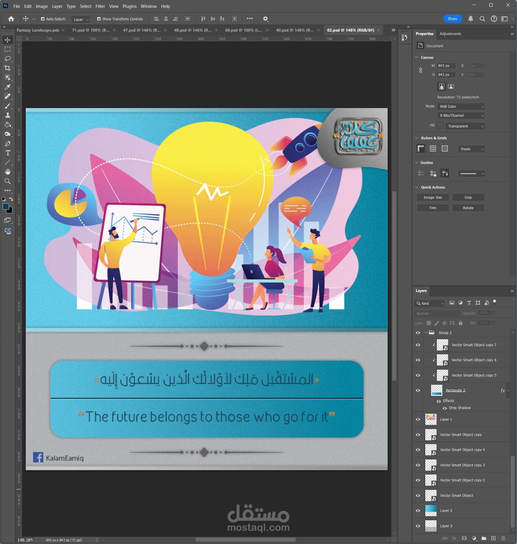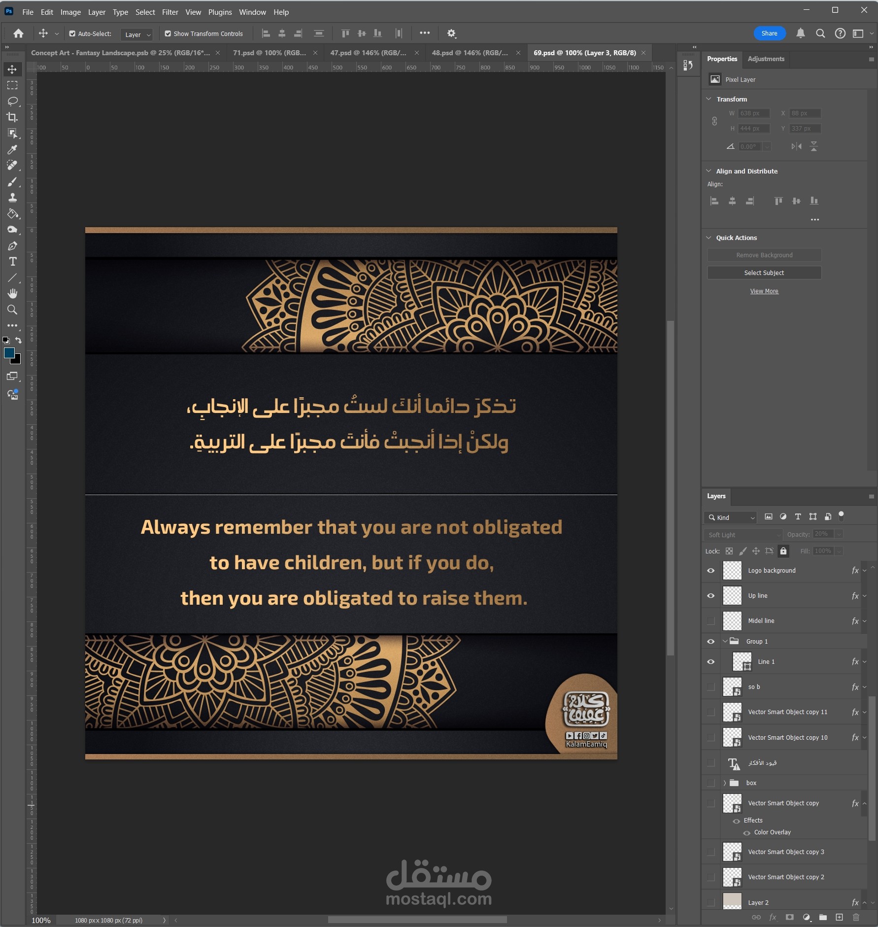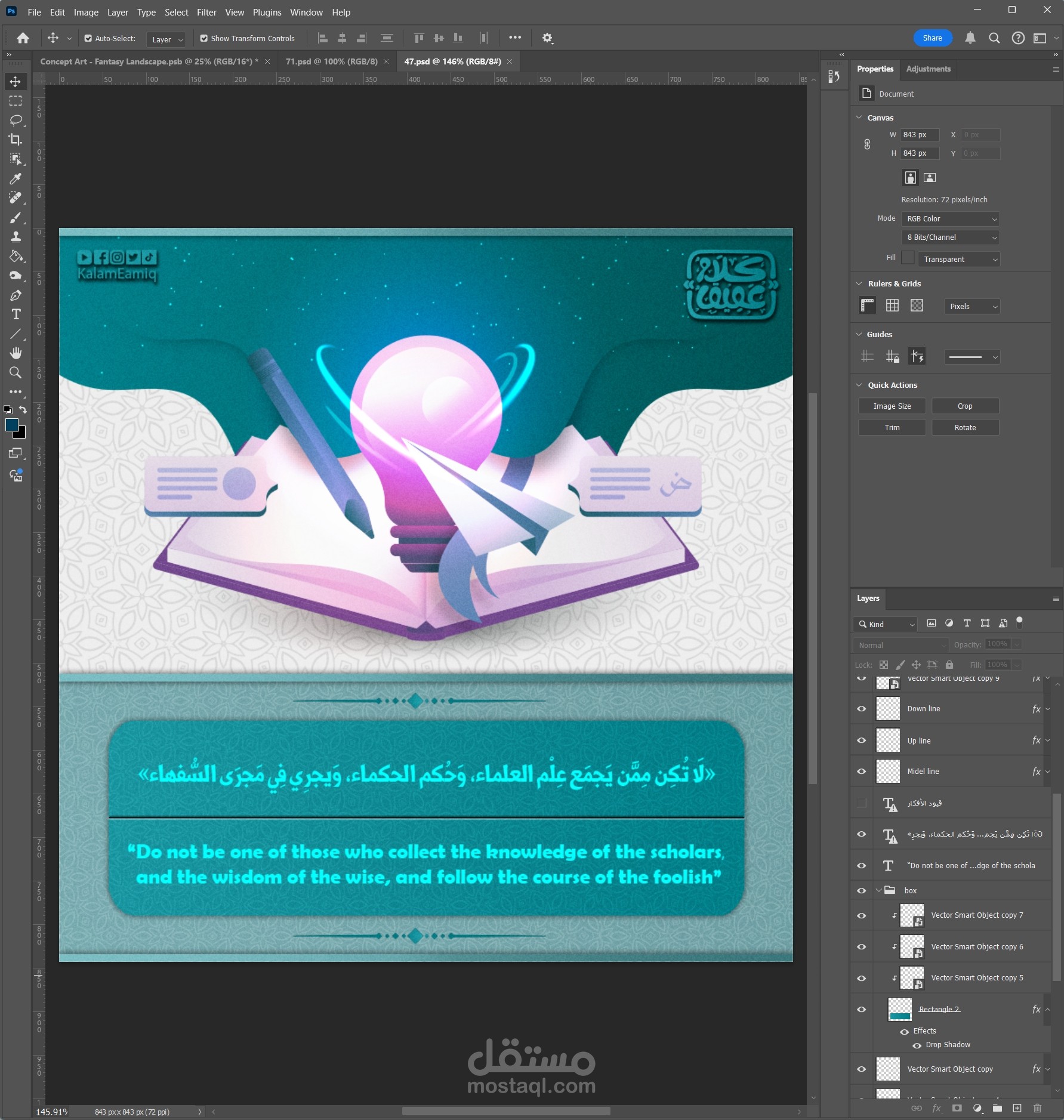 في Illustrator، بدأت برسم العناصر الأساسية للتصميم، مع تحديد الخطوط والأشكال التي تناسب كل اقتباس. اعتمدت على Typography لابتكار تنسيقات نصية مميزة تتناغم مع محتوى الاقتباس، مع ضبط الأحجام والتموضع لتحقيق توازن بصري.