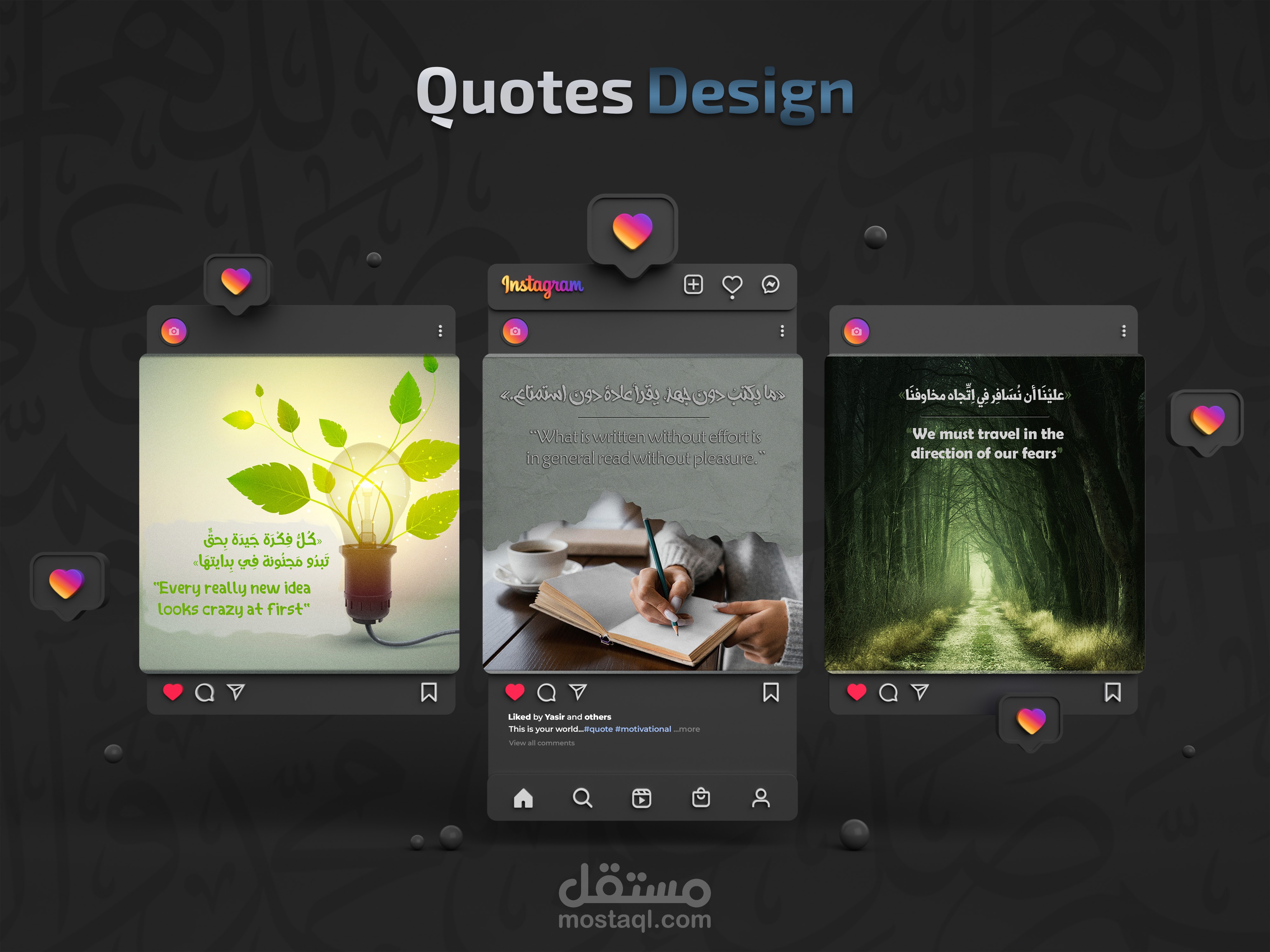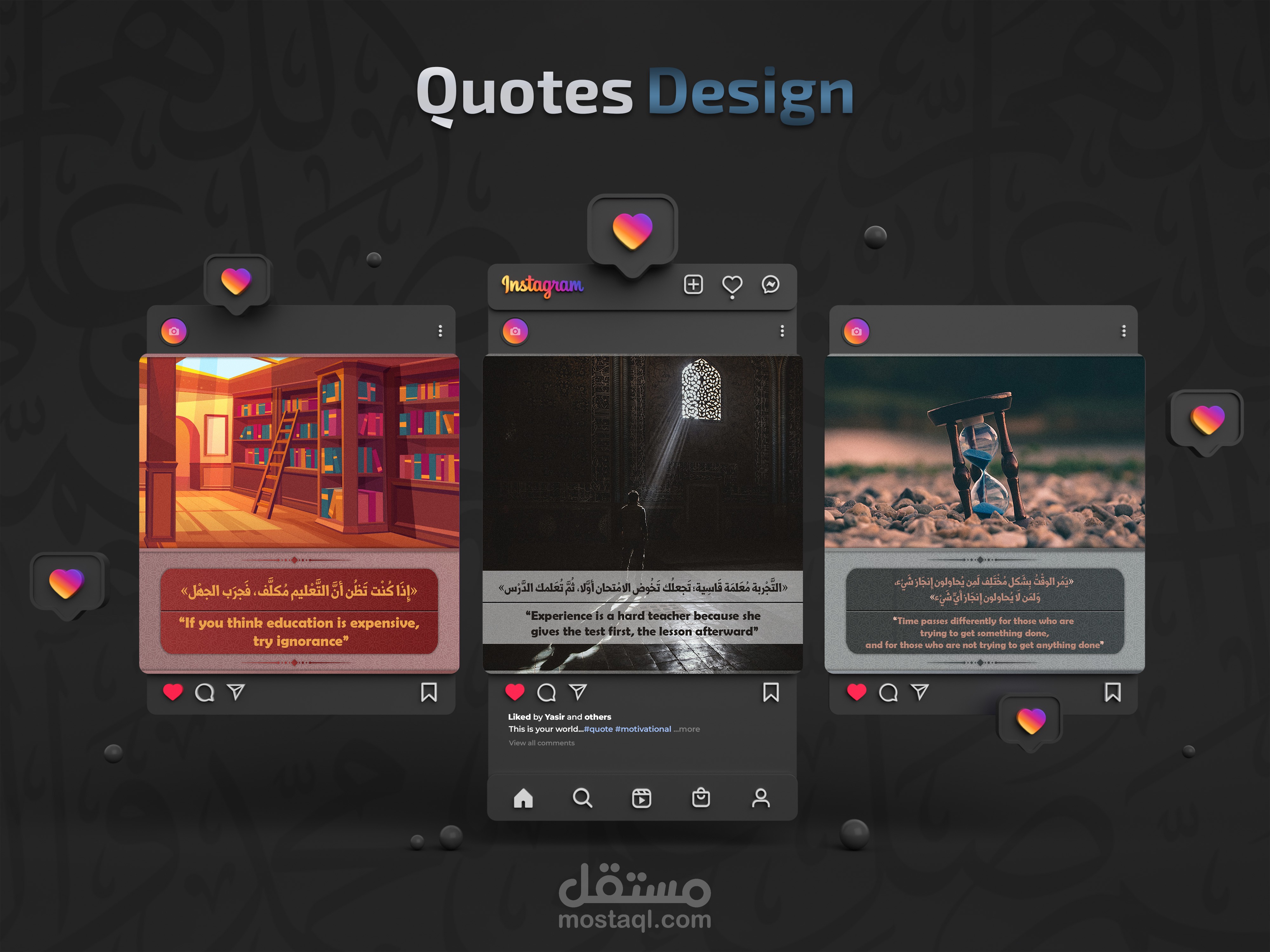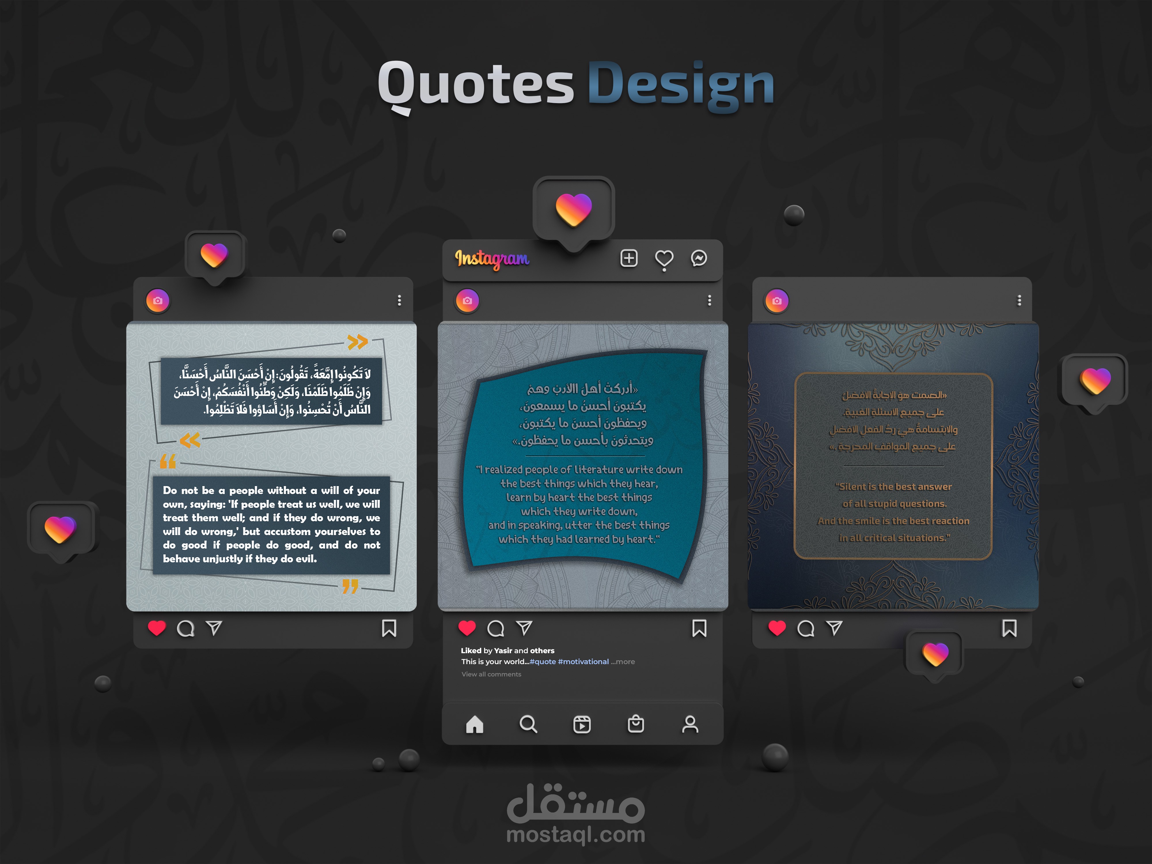 قمت بتصميم مجموعة صور تحمل اقتباسات عميقة وحكمًا ملهمة، تجمع بين قوة الكلمات وجمال التصميم. باستخدام أدوات Adobe Photoshop وAdobe Illustrator، صنعت لوحات رقمية أنيقة وجذابة، موجهة لإلهام القلوب على منصات التواصل الاجتماعي.