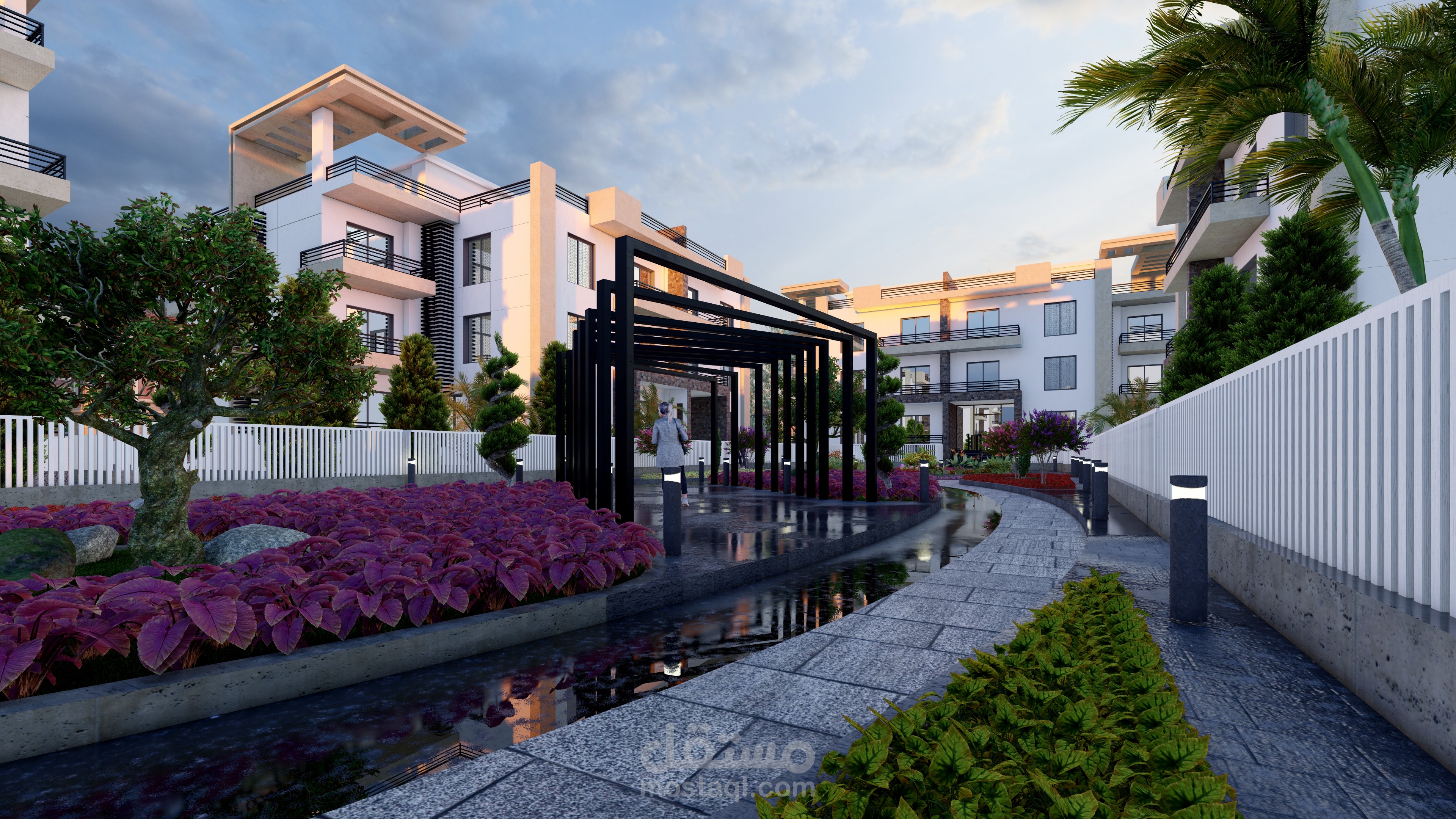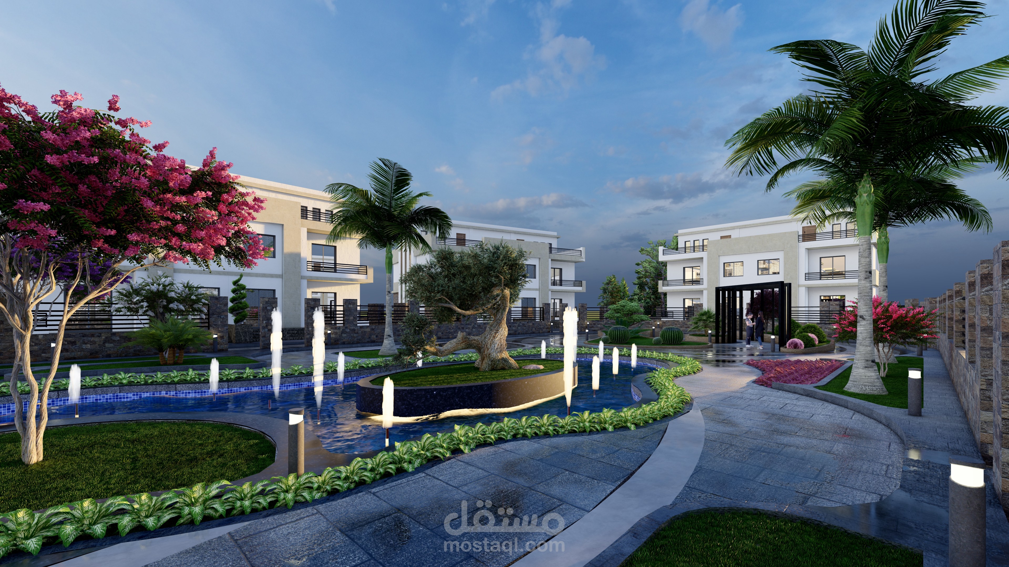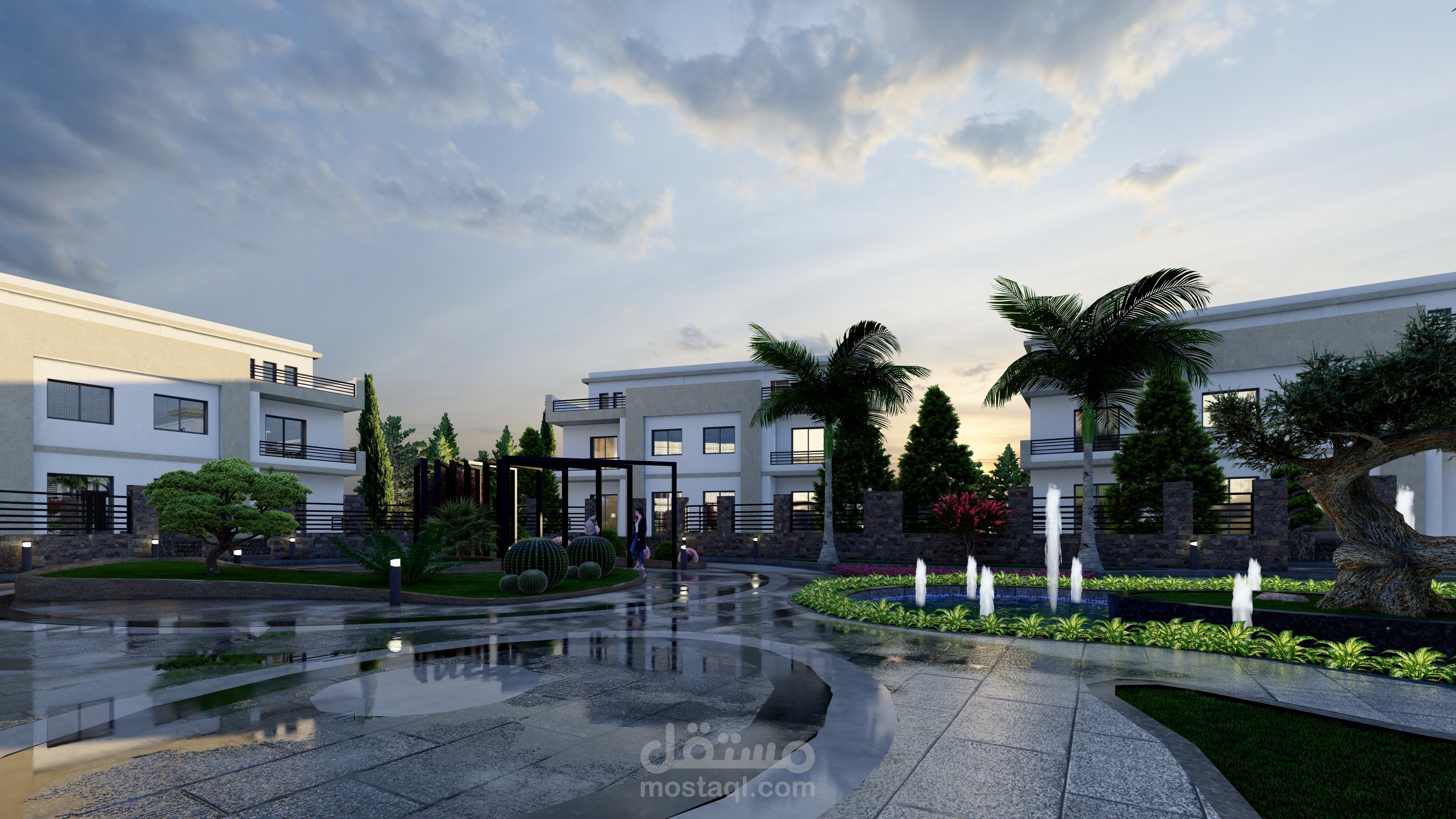 * الموقع العام للكمبوند ويشمل علي مساحات خضراء ونافوره بين الفيلات