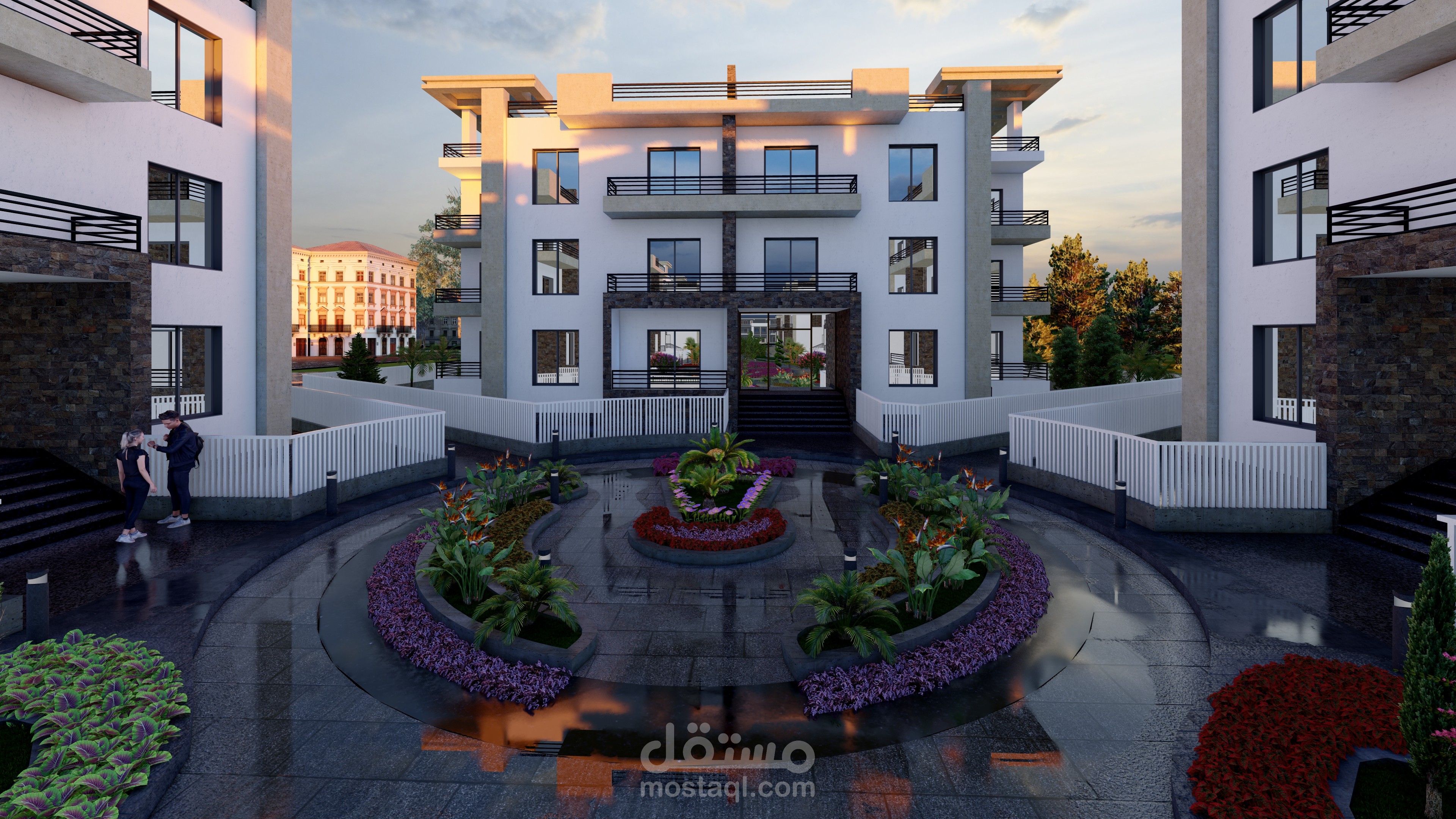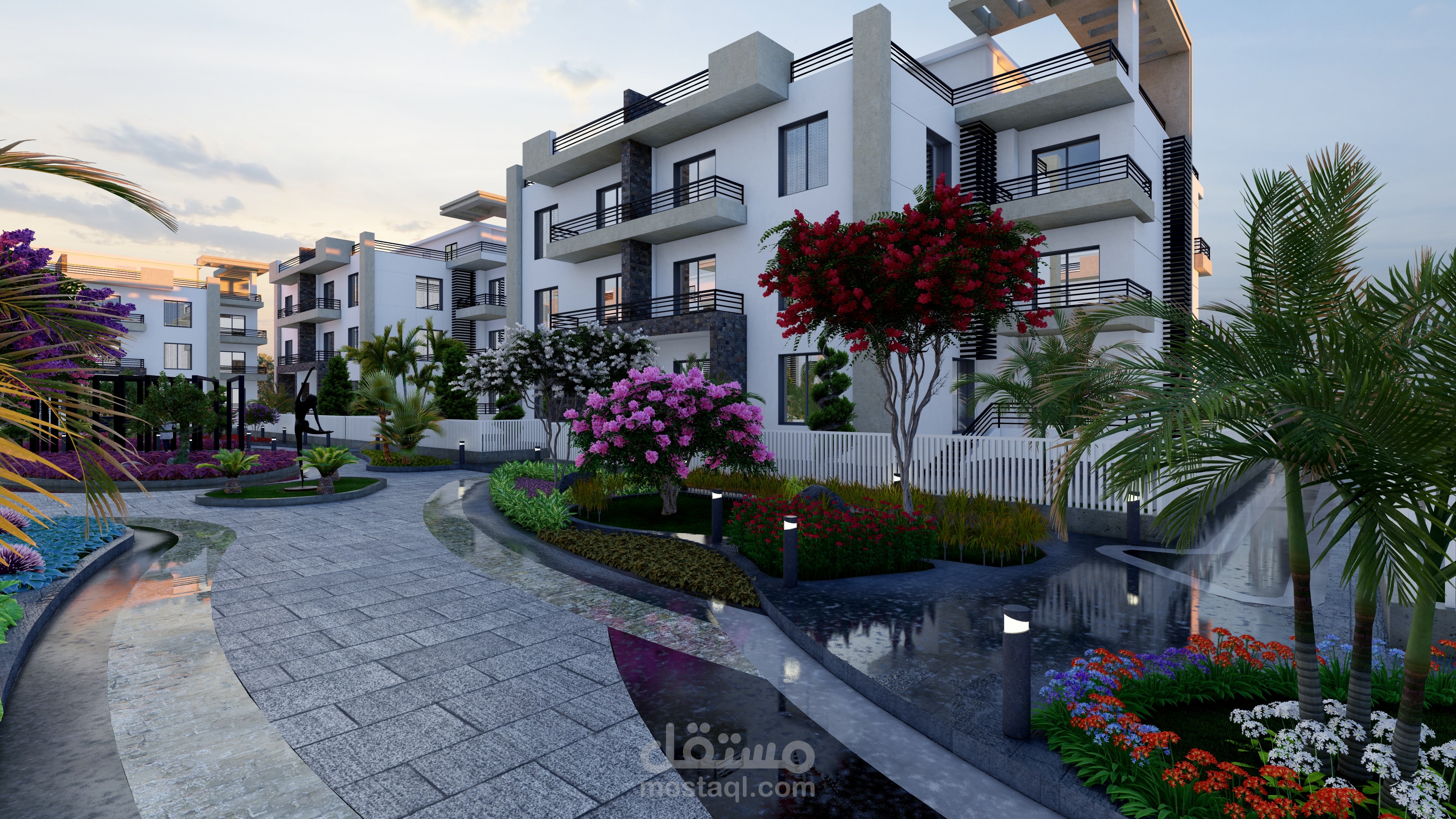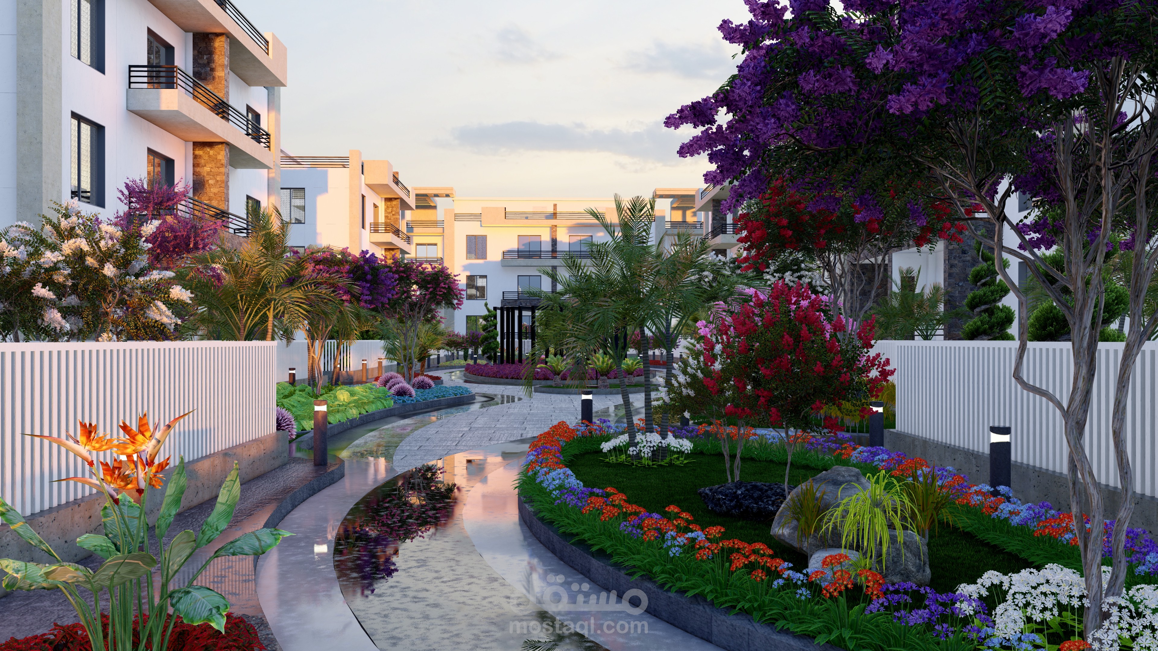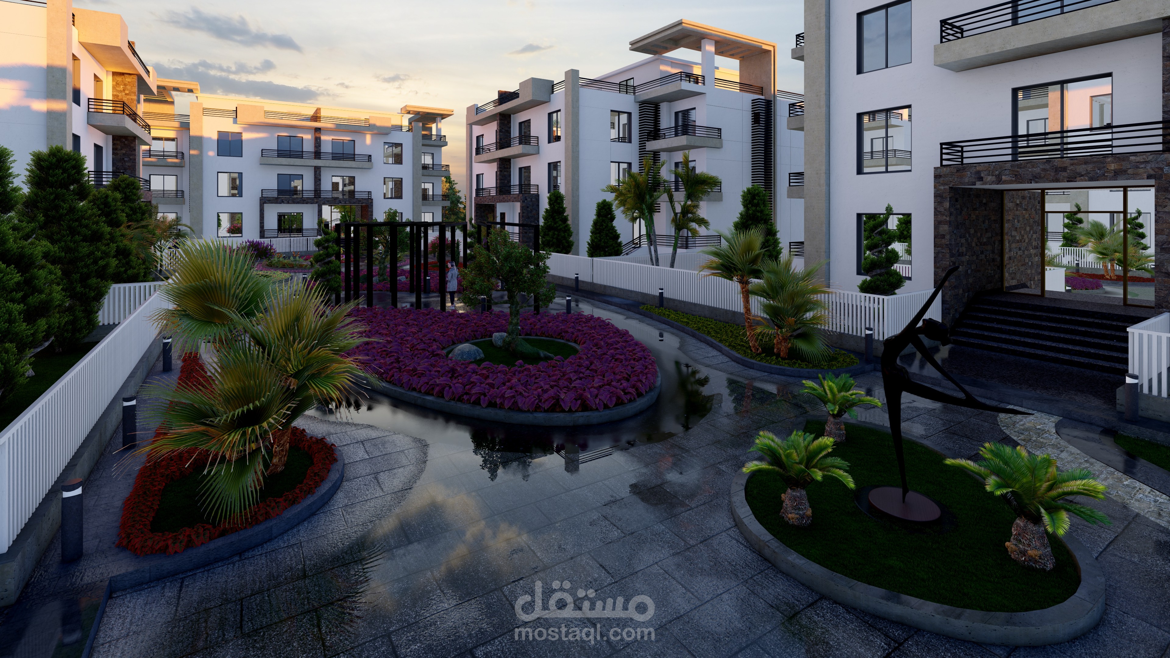 * الموقع العام للكمبوند ويشمل علي مساحات خضراء ونافوره بين الفيلات