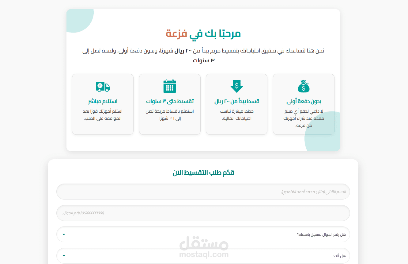 تصميم موقع "فزعة" لطلب التقسيط بخدمات عصرية ومميزات احترافية.