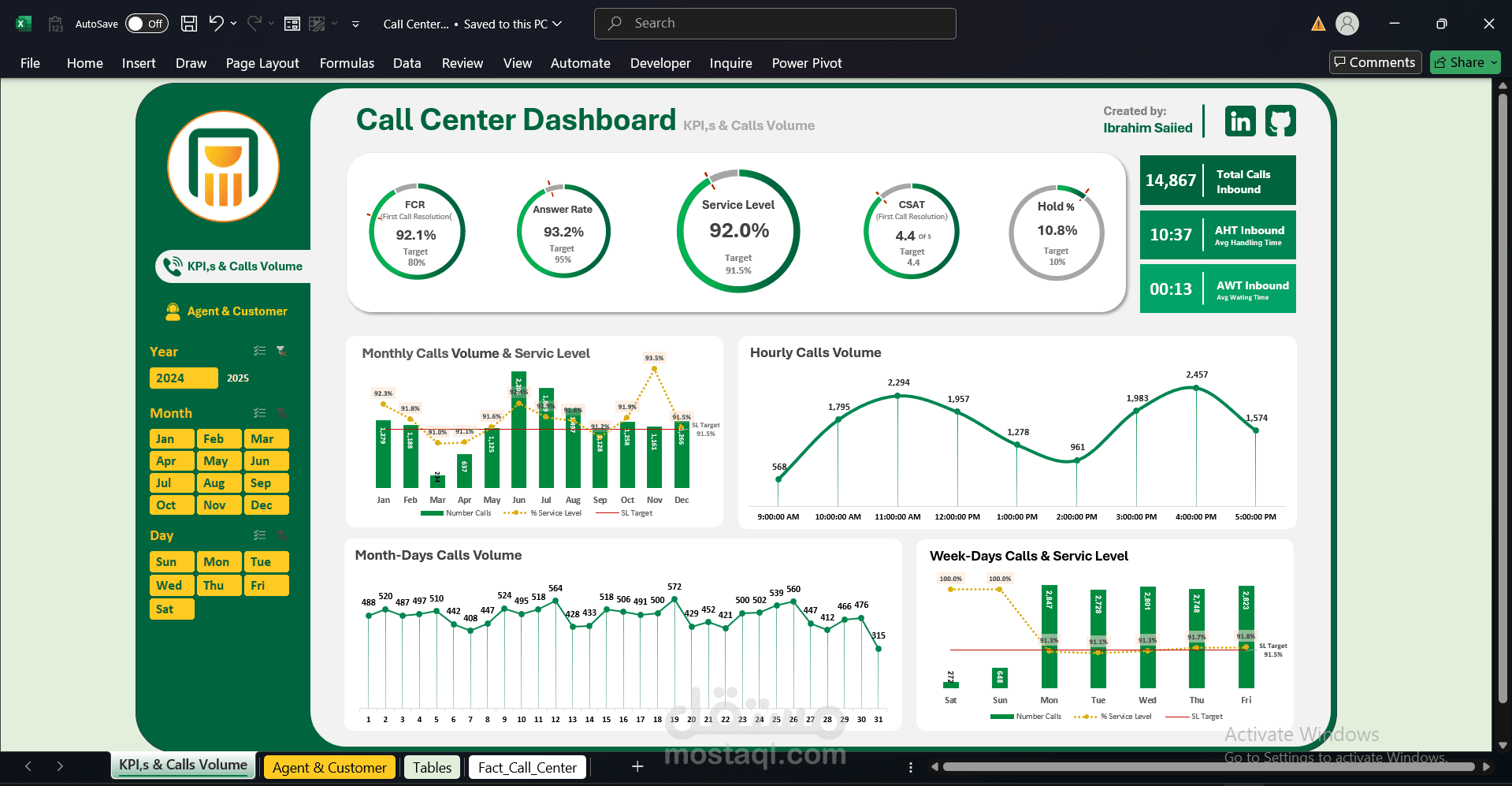 في هذا المشروع قمت بتجميع وتنظيف بيانات أداء مركز الاتصال باستخدام Power Query وPower Pivot، ثم بناء نموذج بيانات ديناميكي يسمح بحساب مؤشرات الأداء الرئيسية مثل مستوى الخدمة (Service Level) و رضا العملاء (CSAT) بدقة.