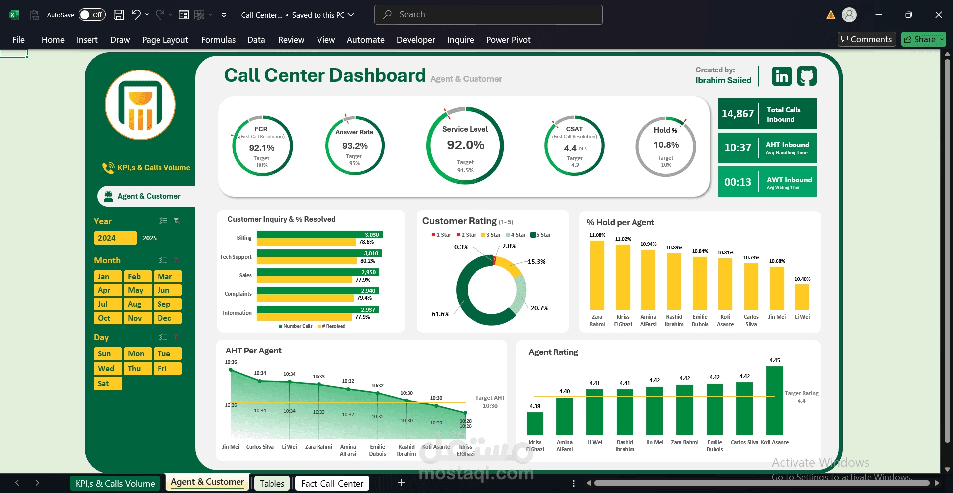 صممت لوحة تحكم تفاعلية بالكامل في Excel تعرض أداء الفرق في الوقت الفعلي وتكشف الفجوات في الأداء، مما ساعد الإدارة على تحسين توزيع الموظفين خلال ساعات الذروة وتحديد مجالات التدريب اللازمة للوكلاء.