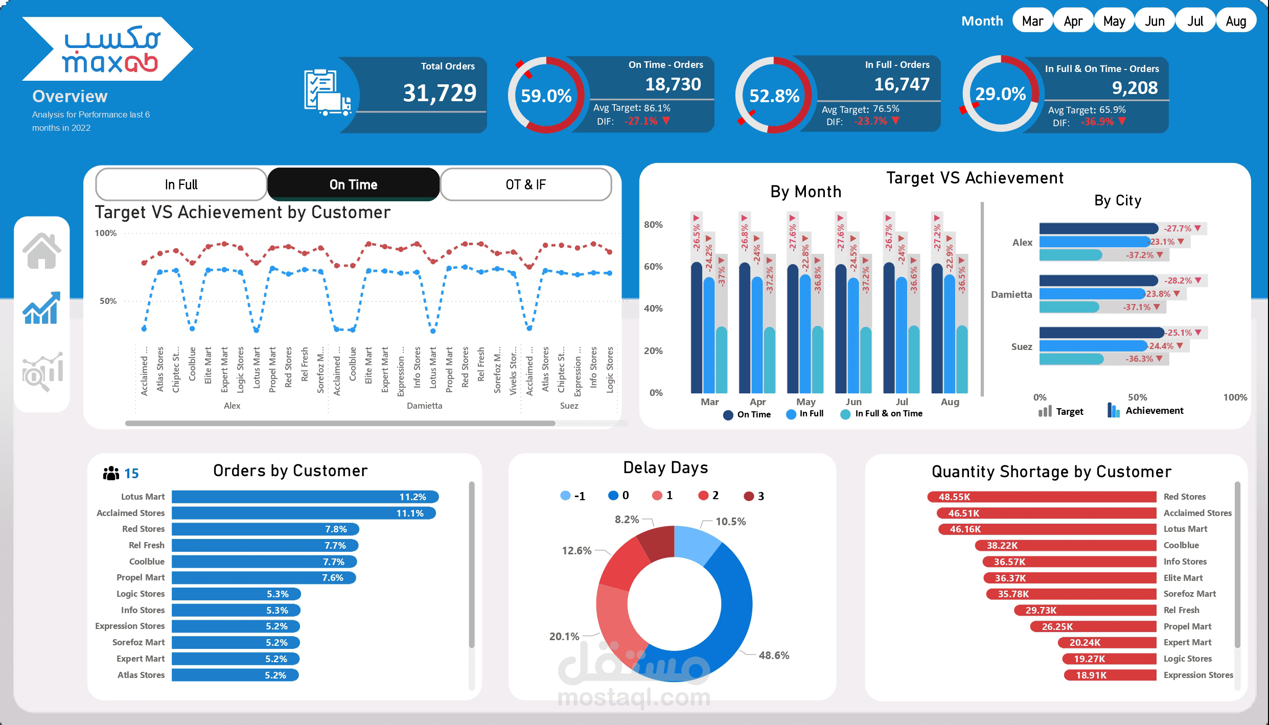في هذا المشروع قمت بتحويل بيانات سلسلة الإمداد غير المهيكلة إلى نموذج بيانات متكامل باستخدام Power Query وPower BI، بحيث يمكن تتبع مؤشرات الأداء الرئيسية مثل الالتزام بالمواعيد (OT) وتوفر المنتجات (IF) ونسبة التسليم الكاملة في الموعد (OTIF) على مستوى المدن والعملاء.