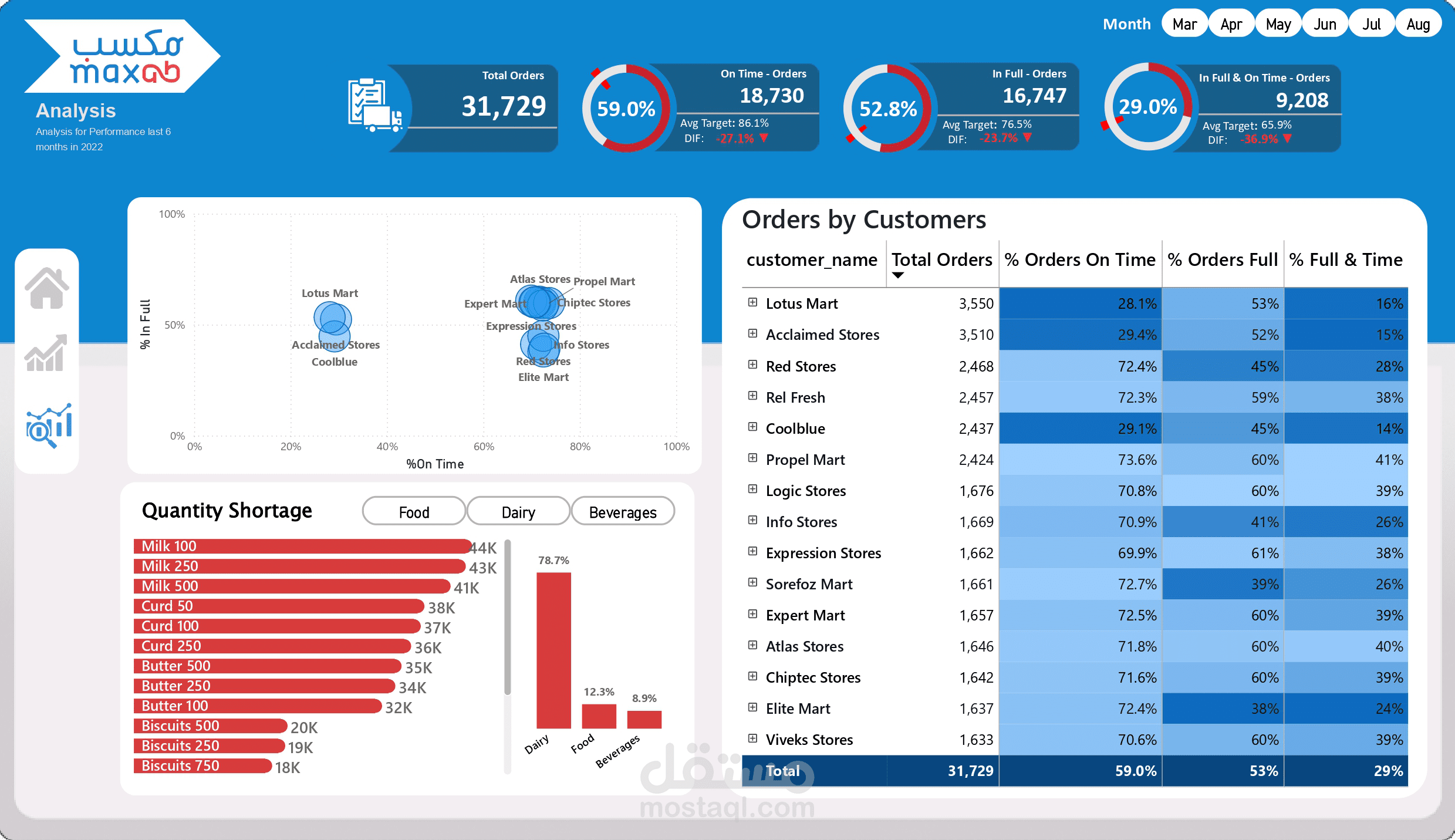 صممت لوحة تحكم تفاعلية تعرض أداء عمليات التسليم، حالات النقص في المخزون، والفجوات الخاصة بكل عميل بشكل واضح وسهل التحليل.
