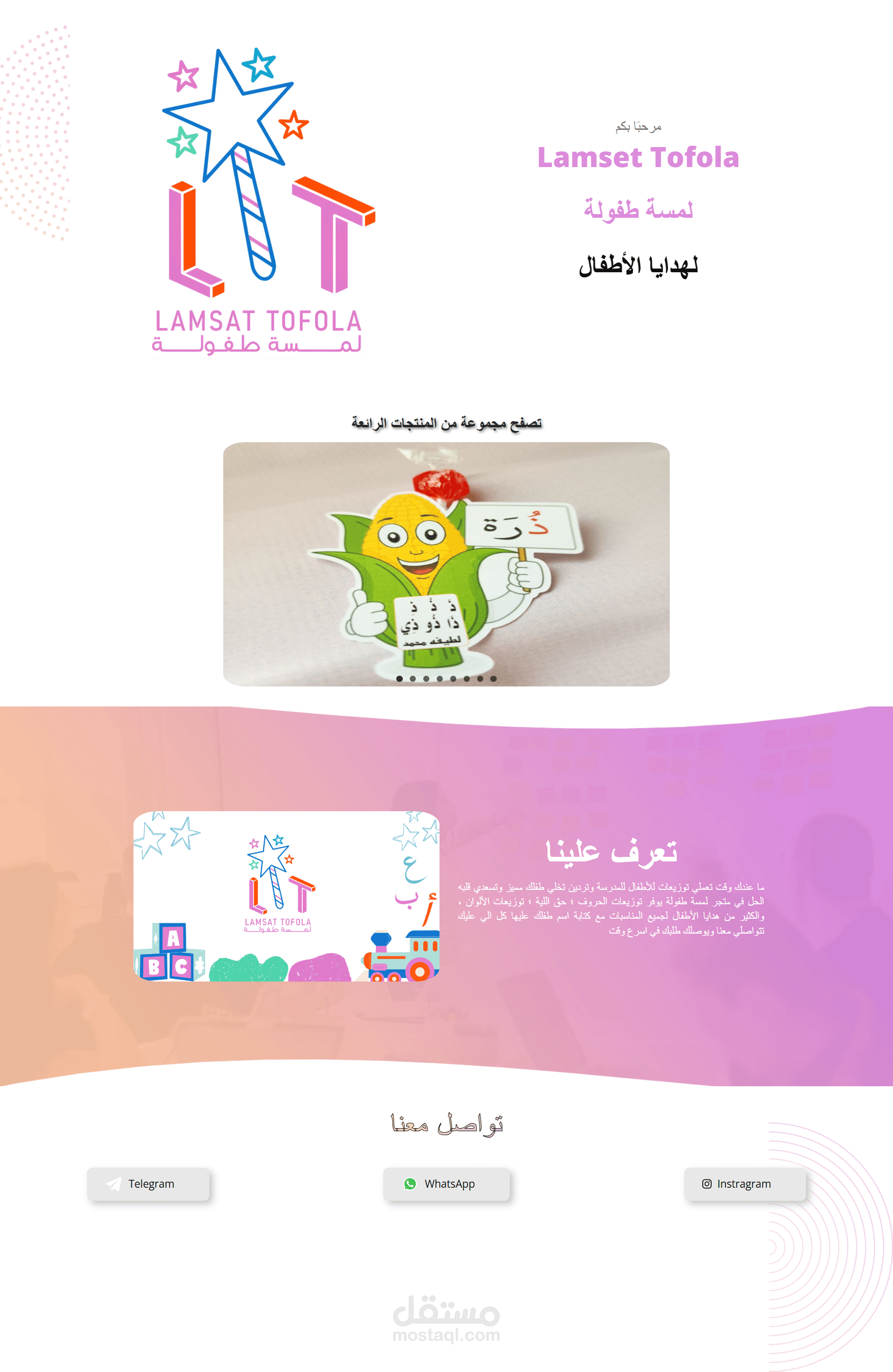 يهدف هذا المشروع إلى تصميم موقع ويب جذاب لمتجر يعتمد على منصة إنستغرام ويختص ببيع ألعاب الأطفال والهدايا المخصصة.