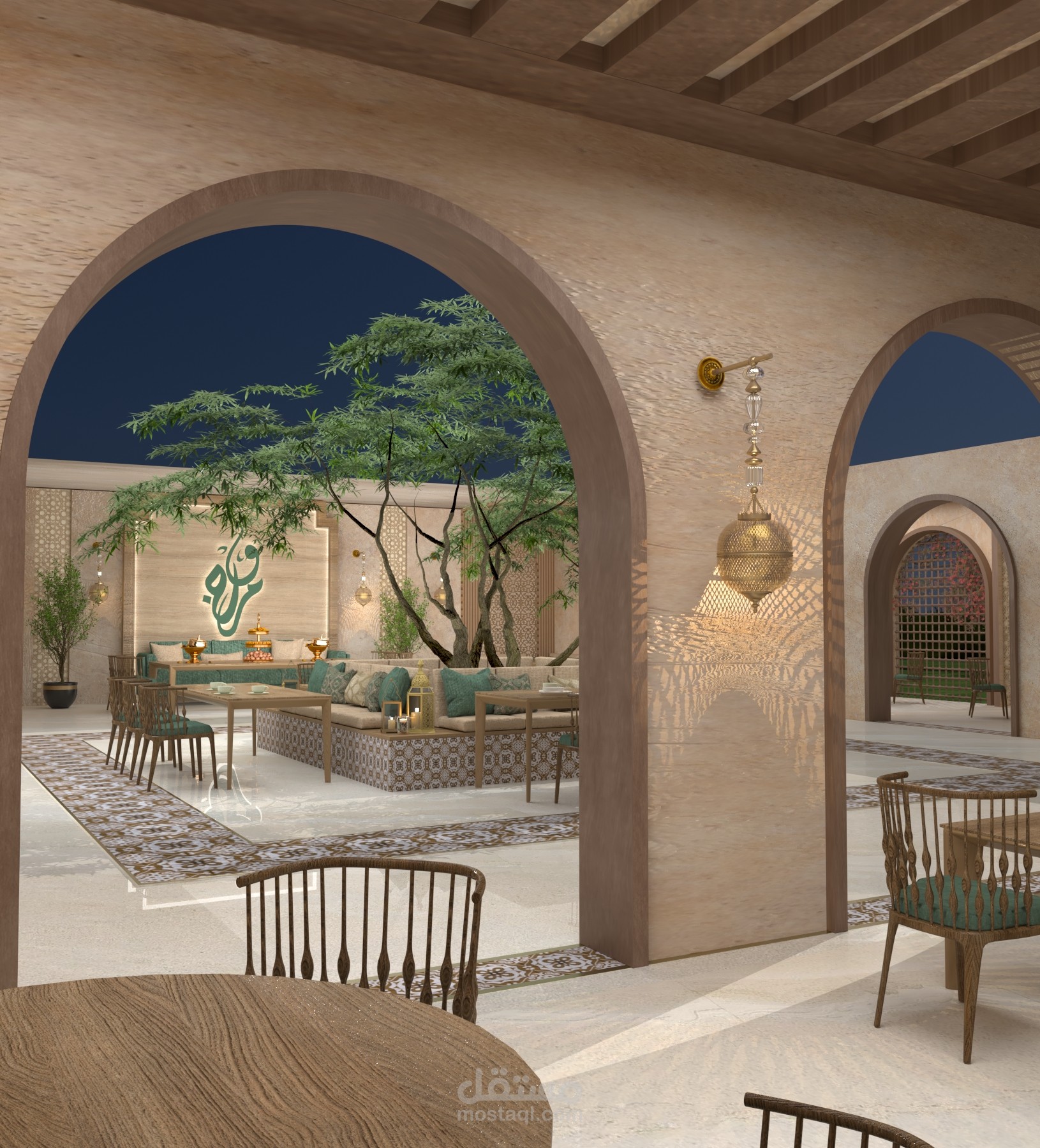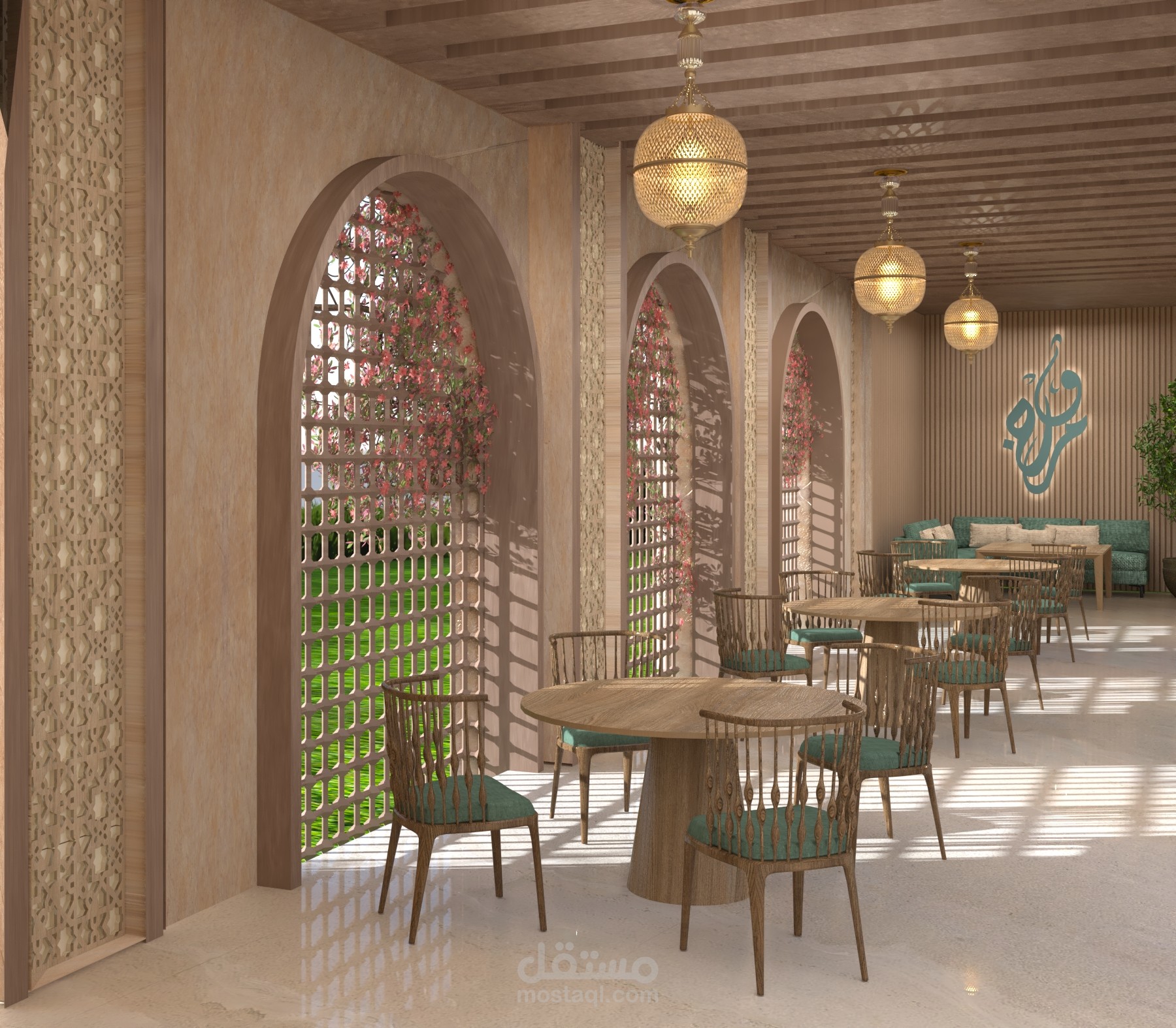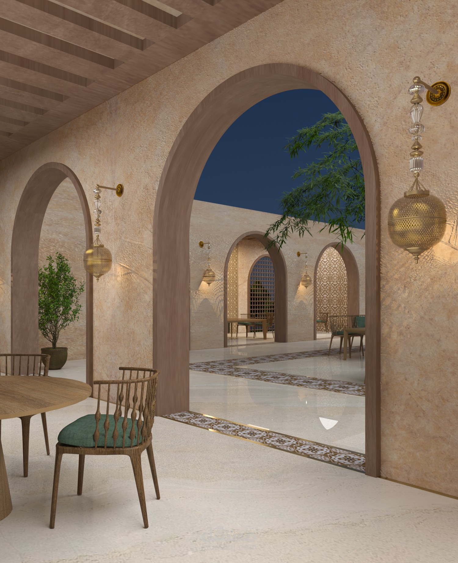 الإضاءة الطبيعية: حرصتُ على تعزيز الإضاءة الطبيعية داخل المطعم من خلال استخدام نوافذ كبيرة ومشربيات مستوحاة من العمارة الإسلامية التقليدية، مما يسمح بدخول الضوء الطبيعي وتوزيعه بشكل متوازن في المساحات الداخلية.